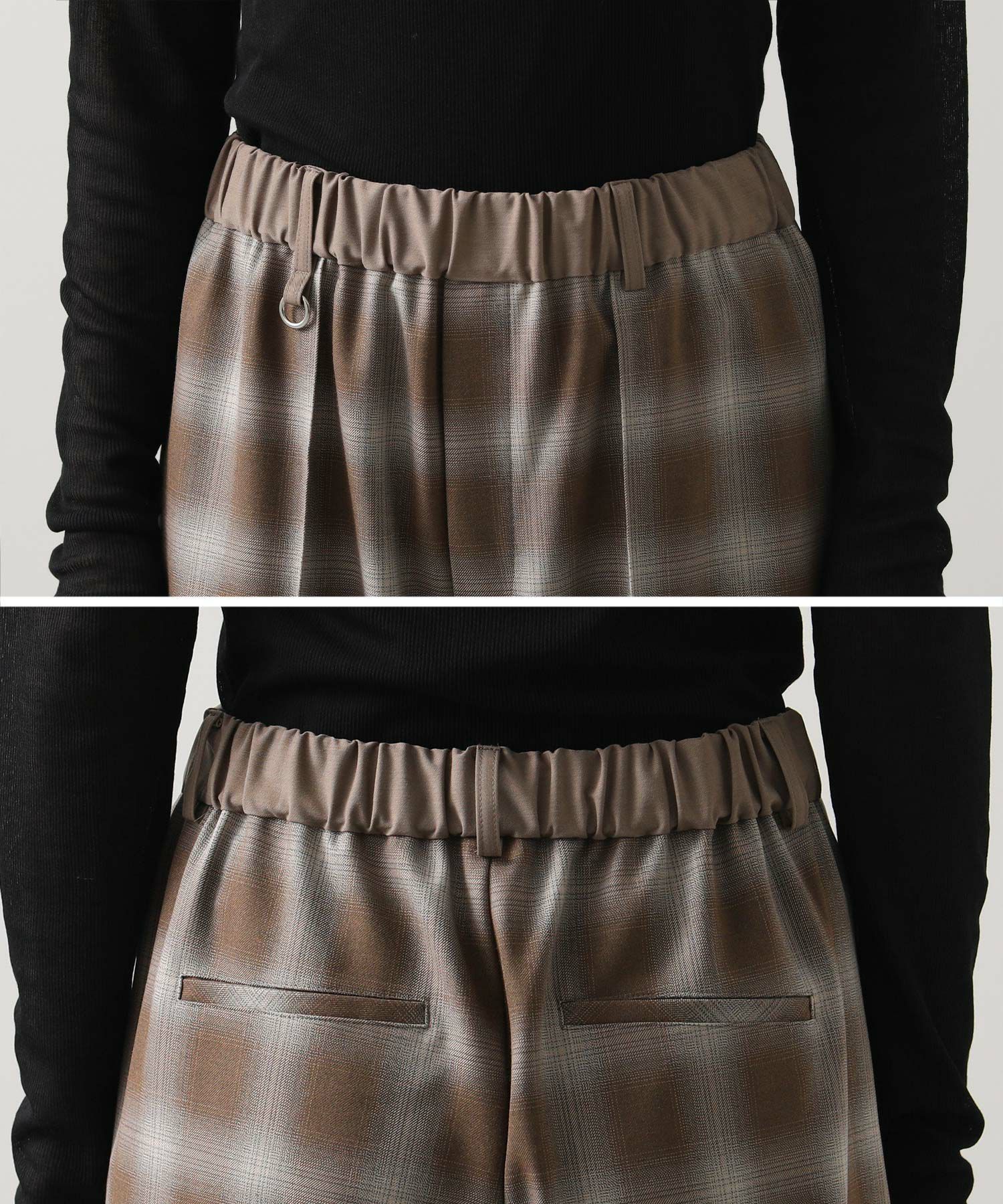オンブレチェックの裏微起毛ツイルを使用した、ピンタック入りのワイドパンツ。