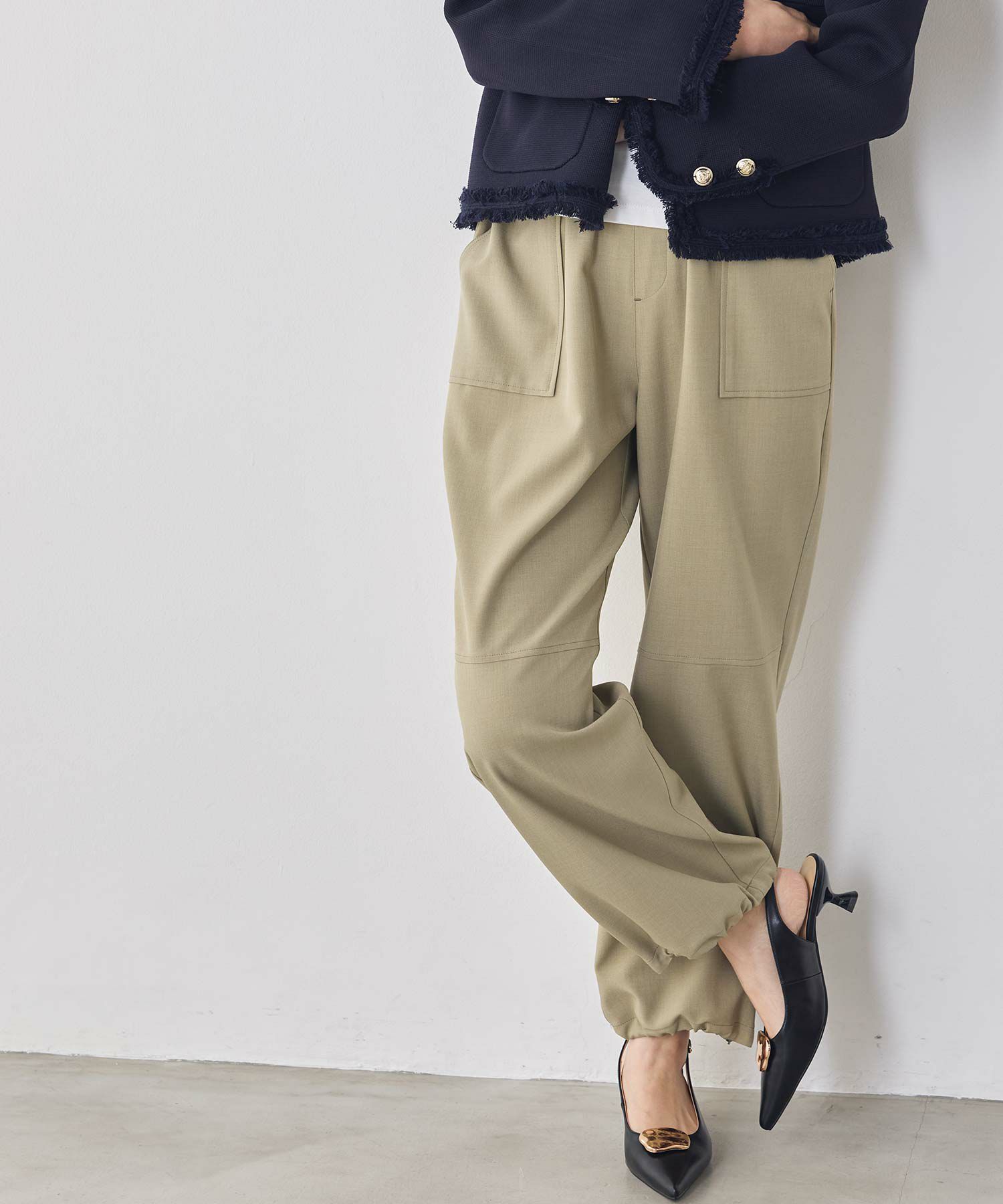 裾のドローコードでシルエットを変化させることにより、スニーカーやパンプス、サンダルなど足元に合わせて変えられるので、様々なシーンで楽しめます。