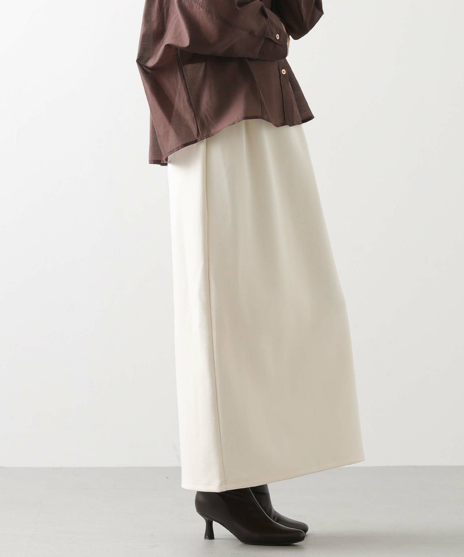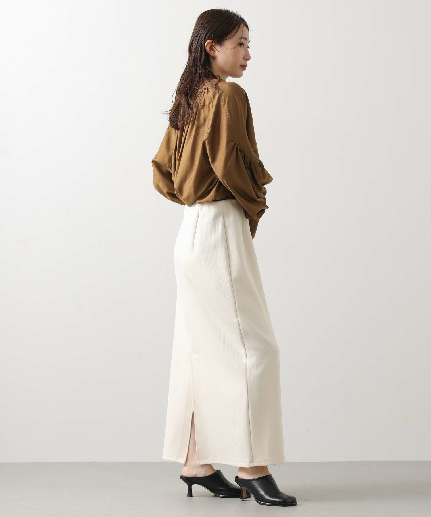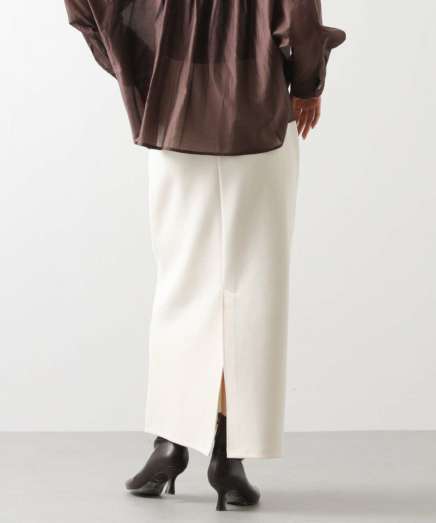 程よくフィット感のあるサイジングは、下半身をすっきり見せ、女性らしさを引き立ててくれます。