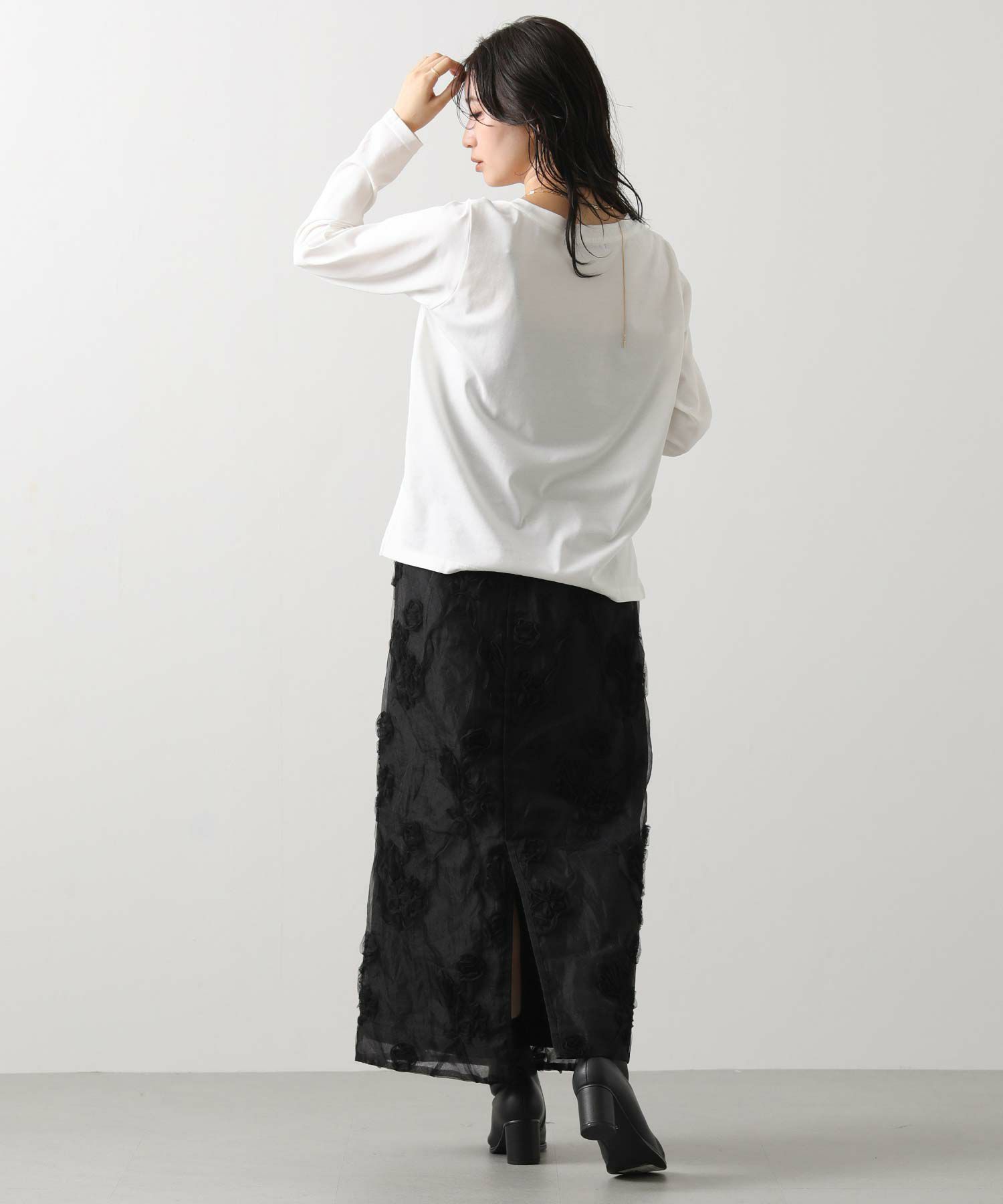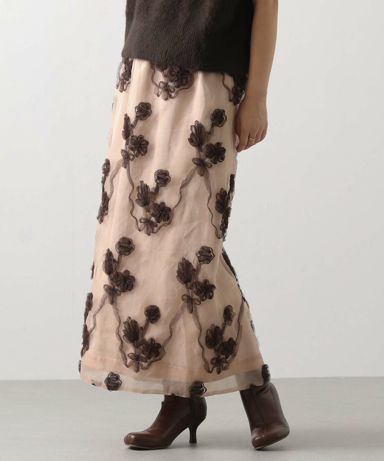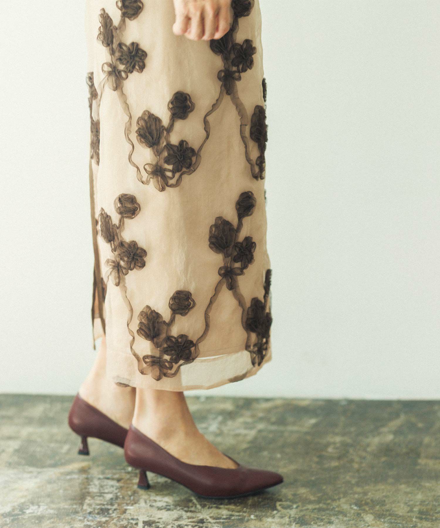 オーガンジーにチュールで刺繍を施した立体感のある素材が、スタイリングにアクセントをつけてくれます。ウエストはグログランテープを使用して、インスタイルも決まるデザインになっています。