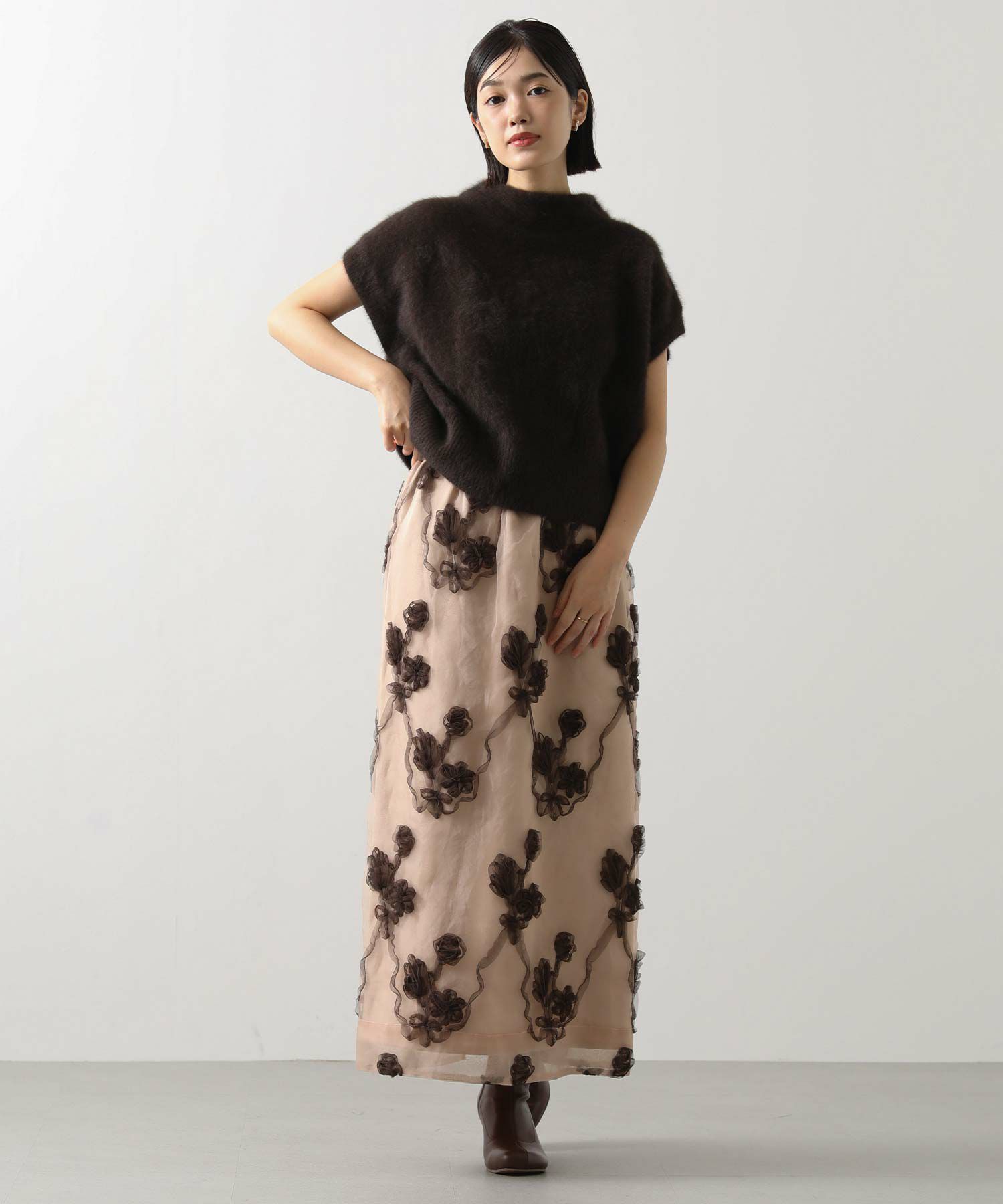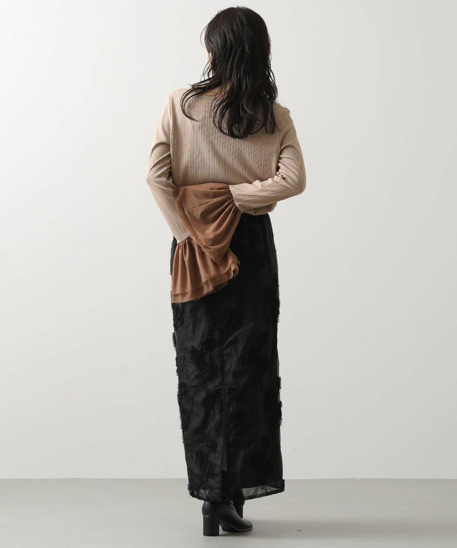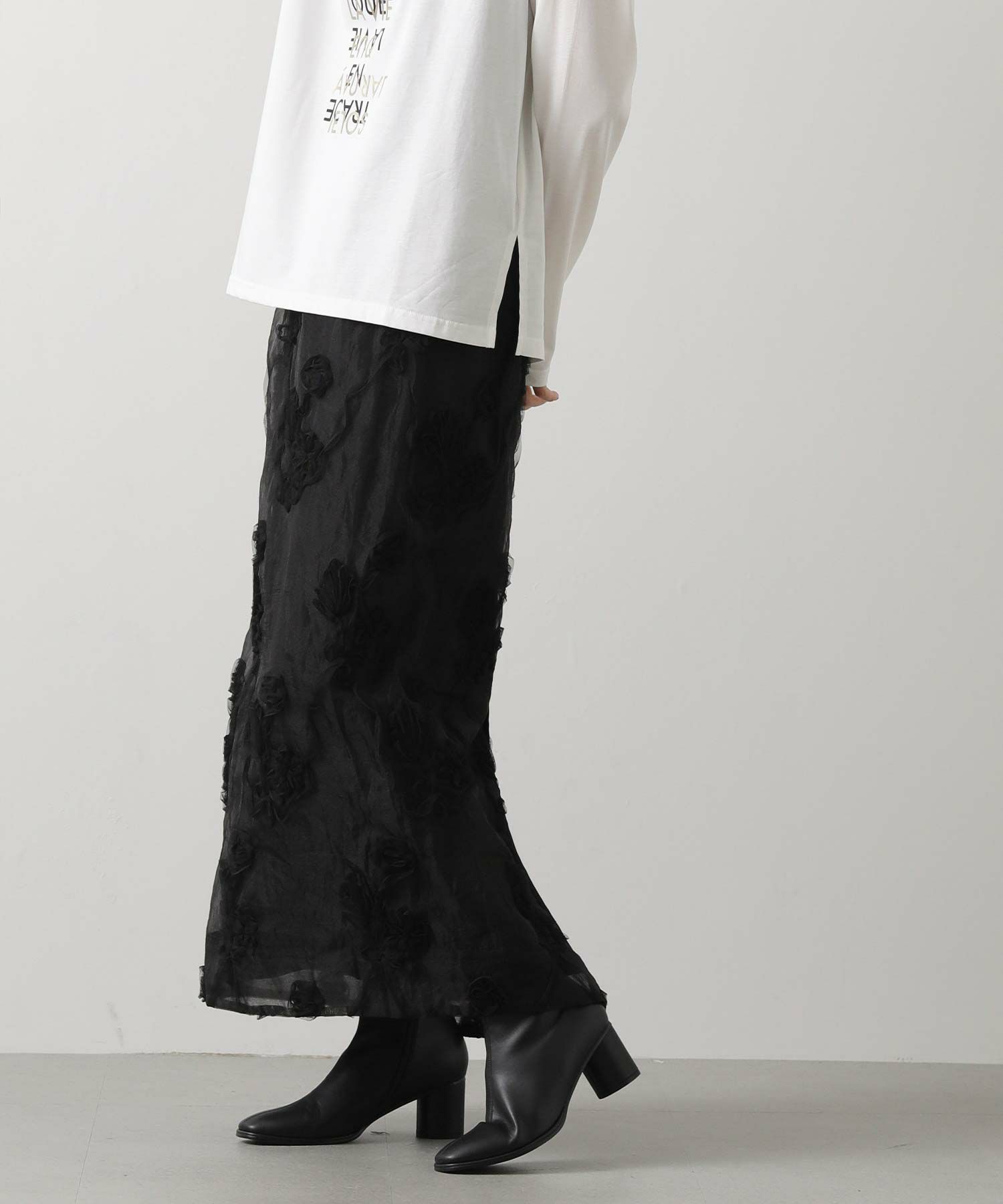 オーガンジーにチュールで刺繍を施した立体感のある素材が、スタイリングにアクセントをつけてくれます。ウエストはグログランテープを使用して、インスタイルも決まるデザインになっています。