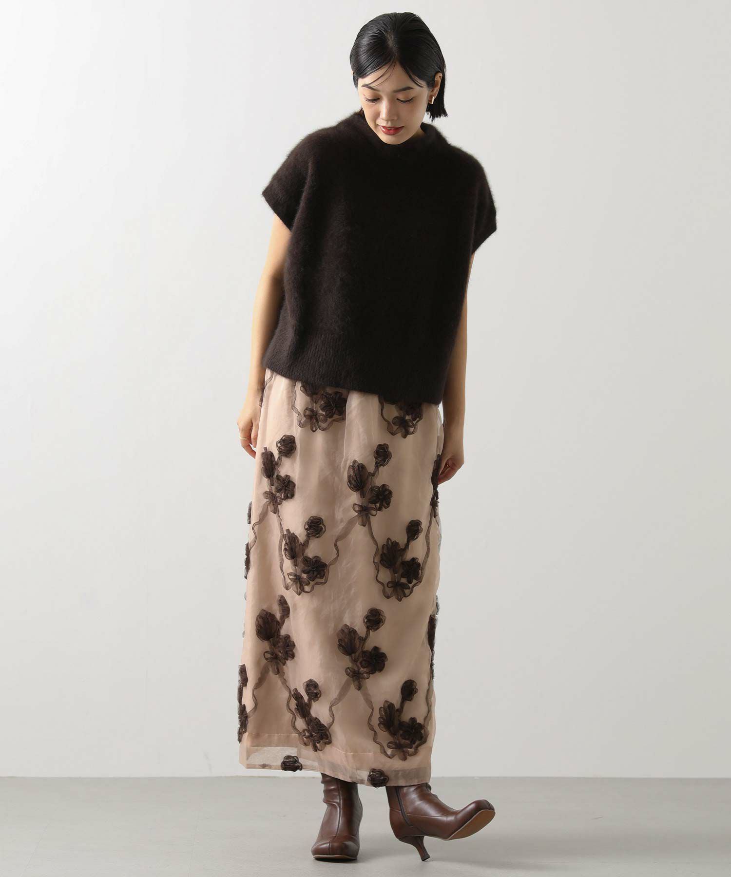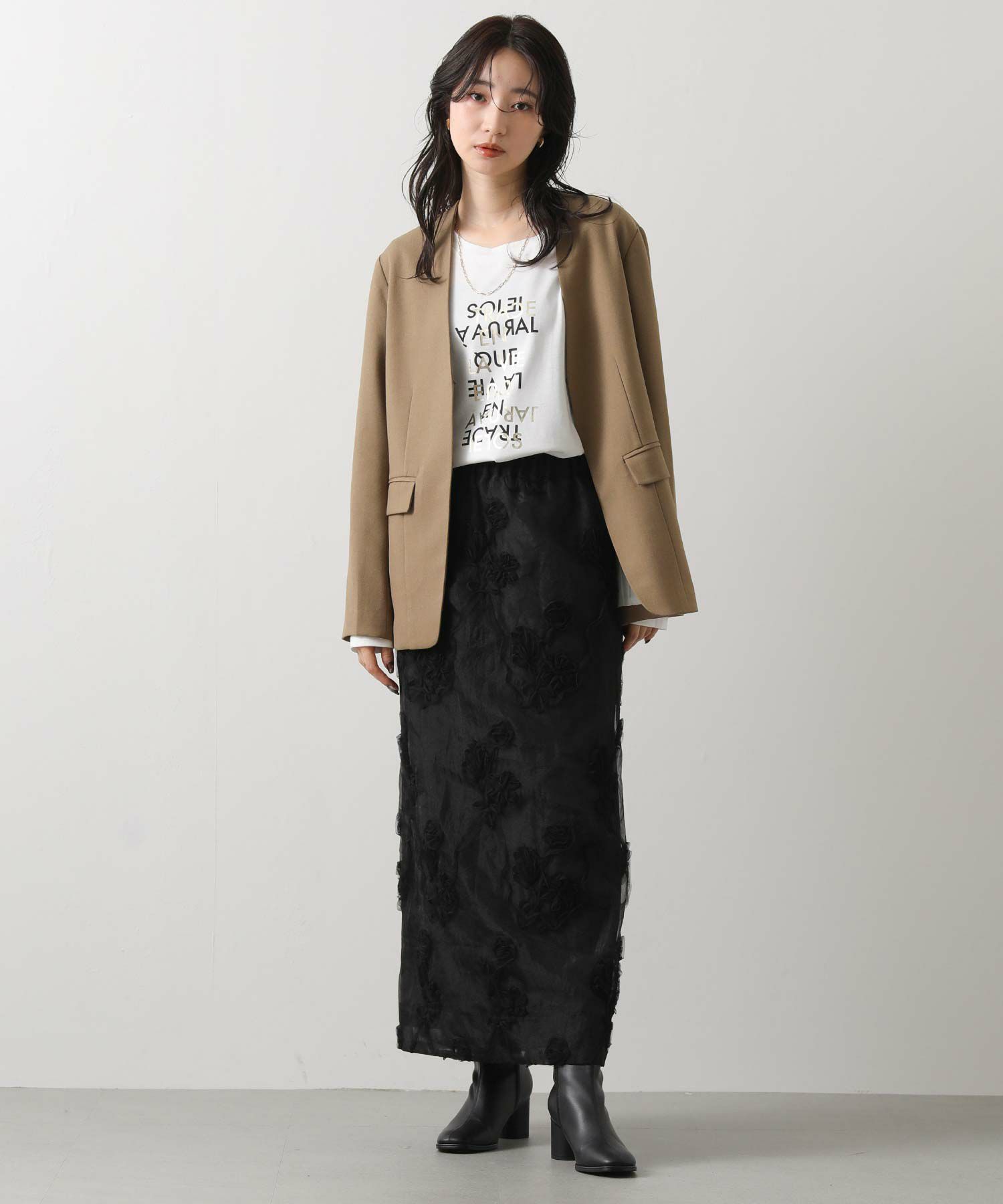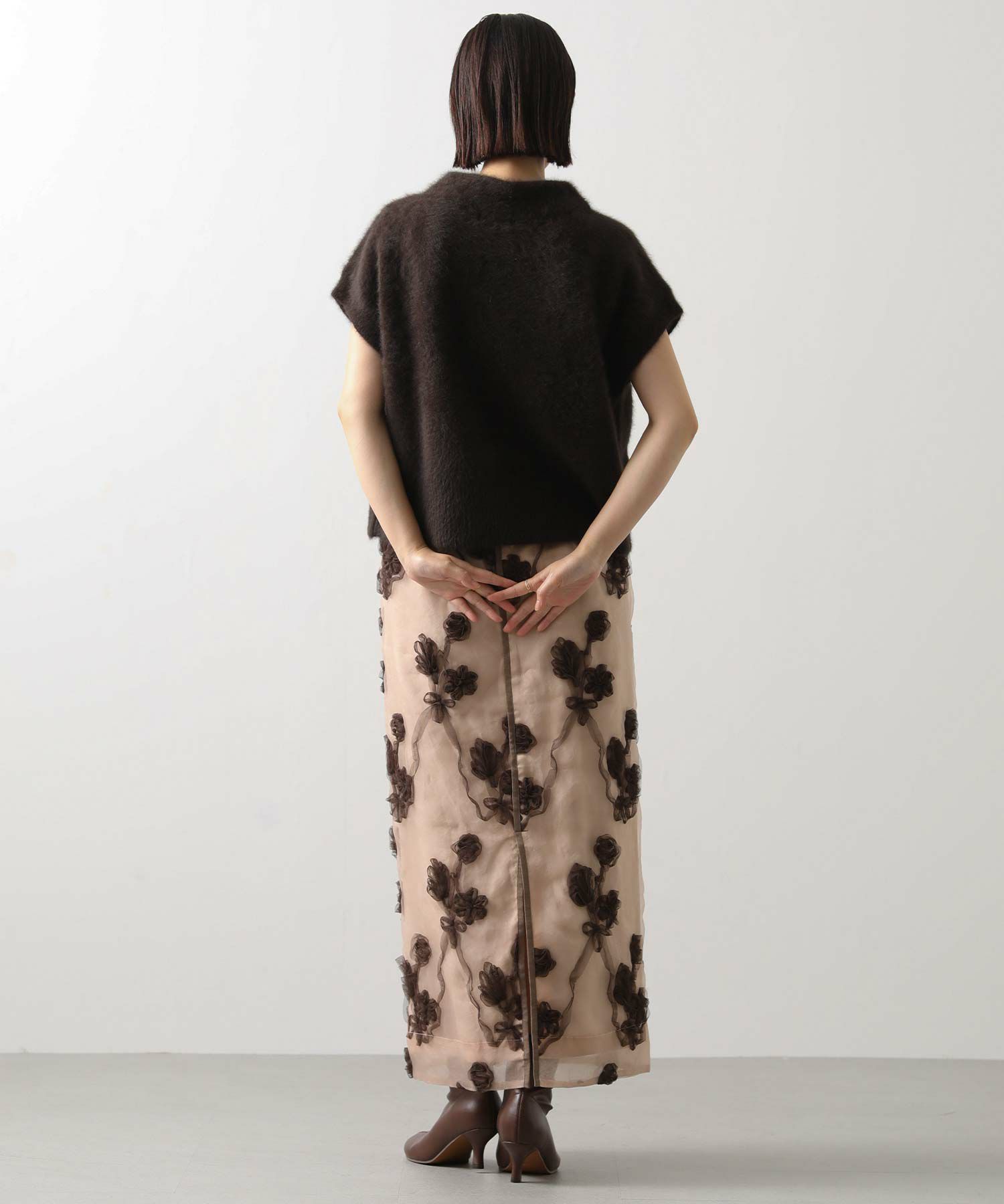 オーガンジーにチュールで刺繍を施した立体感のある素材が、スタイリングにアクセントをつけてくれます。ウエストはグログランテープを使用して、インスタイルも決まるデザインになっています。