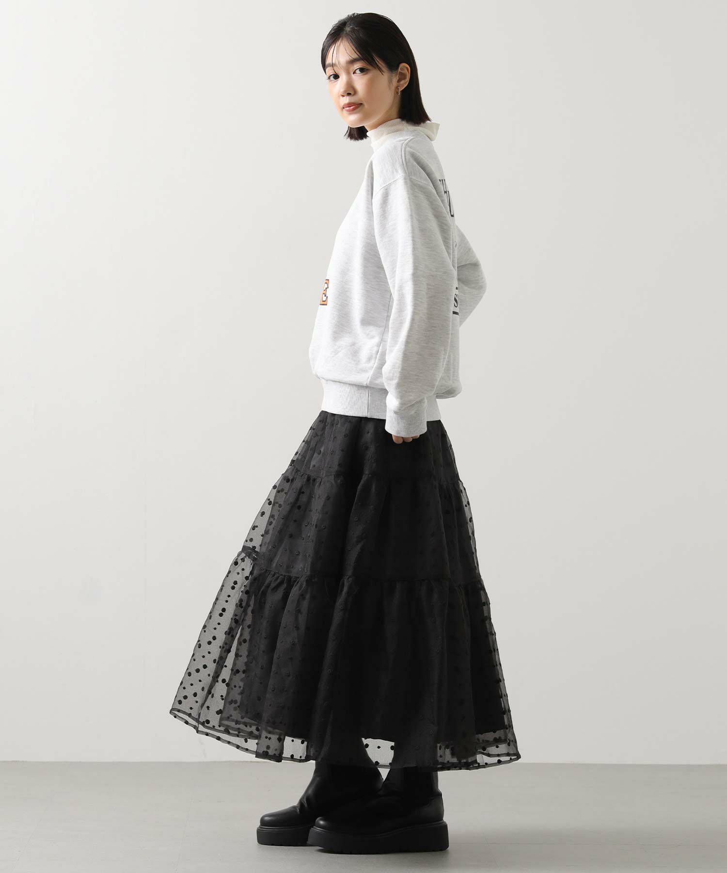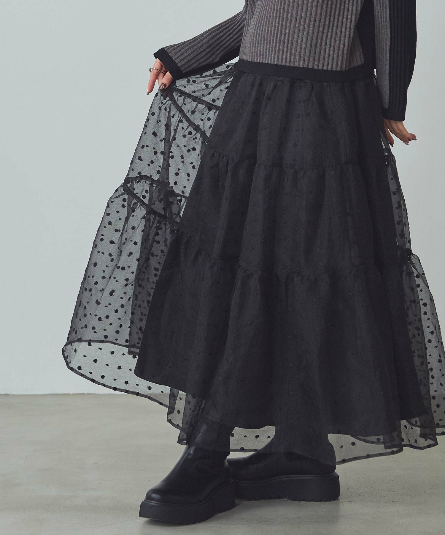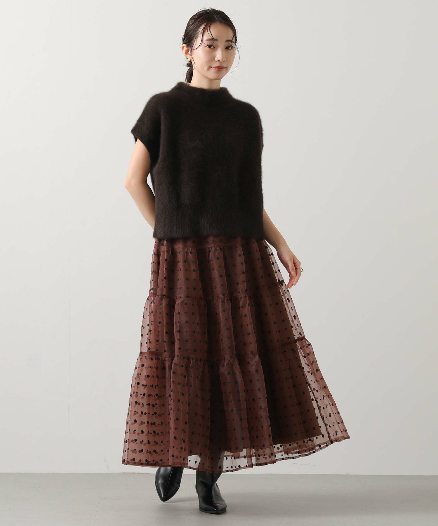 シアーの軽い質感のオーガンジーは、冬のふわふわニットと相性抜群!