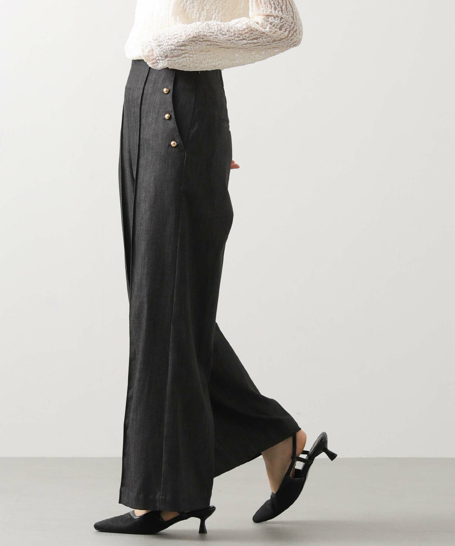 脇にキラッと光る金釦がポイント。カジュアルになりすぎず、シンプルなカットソーやシャツ合わせでも上品な大人のカジュアルスタイルが決まります。
