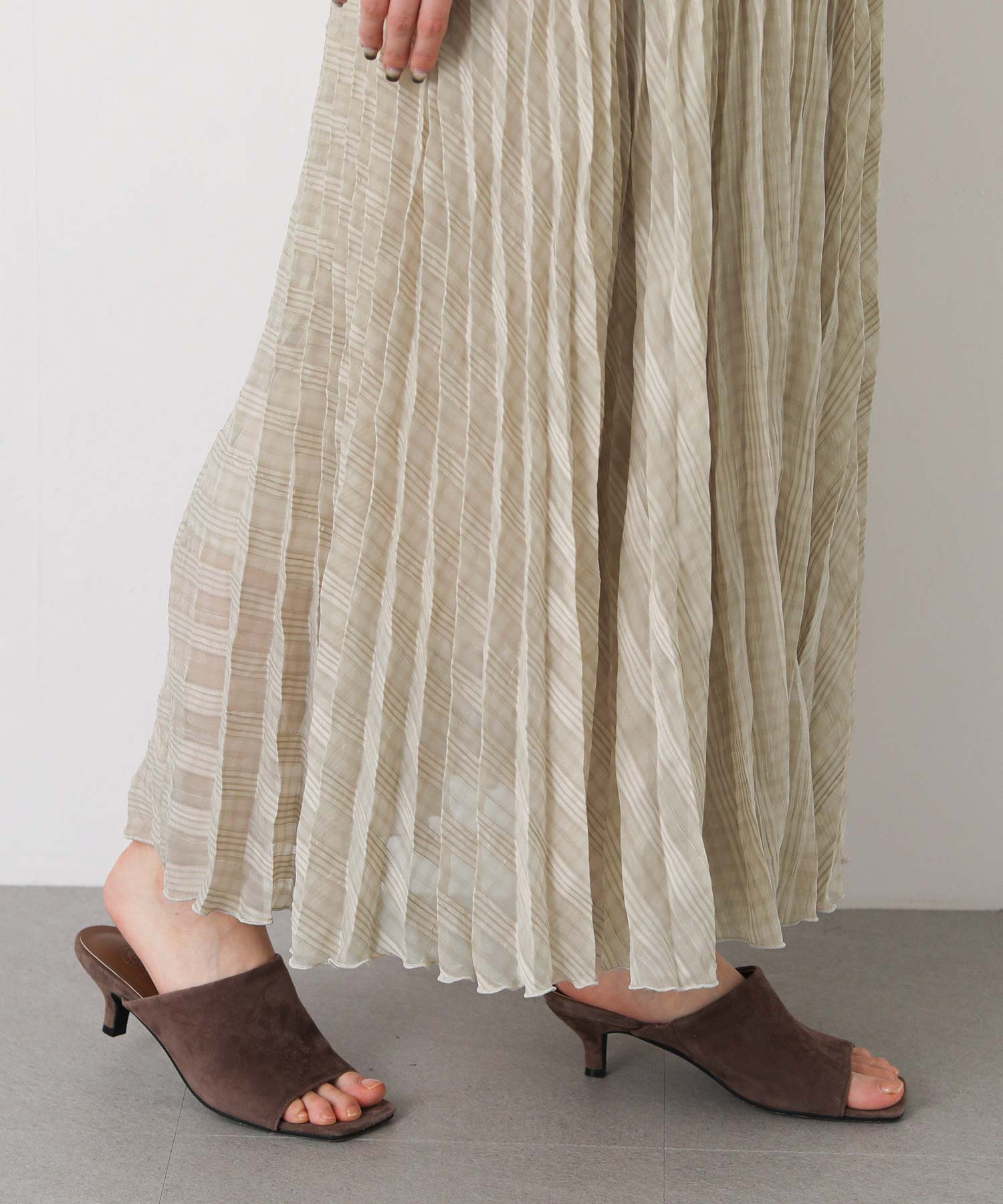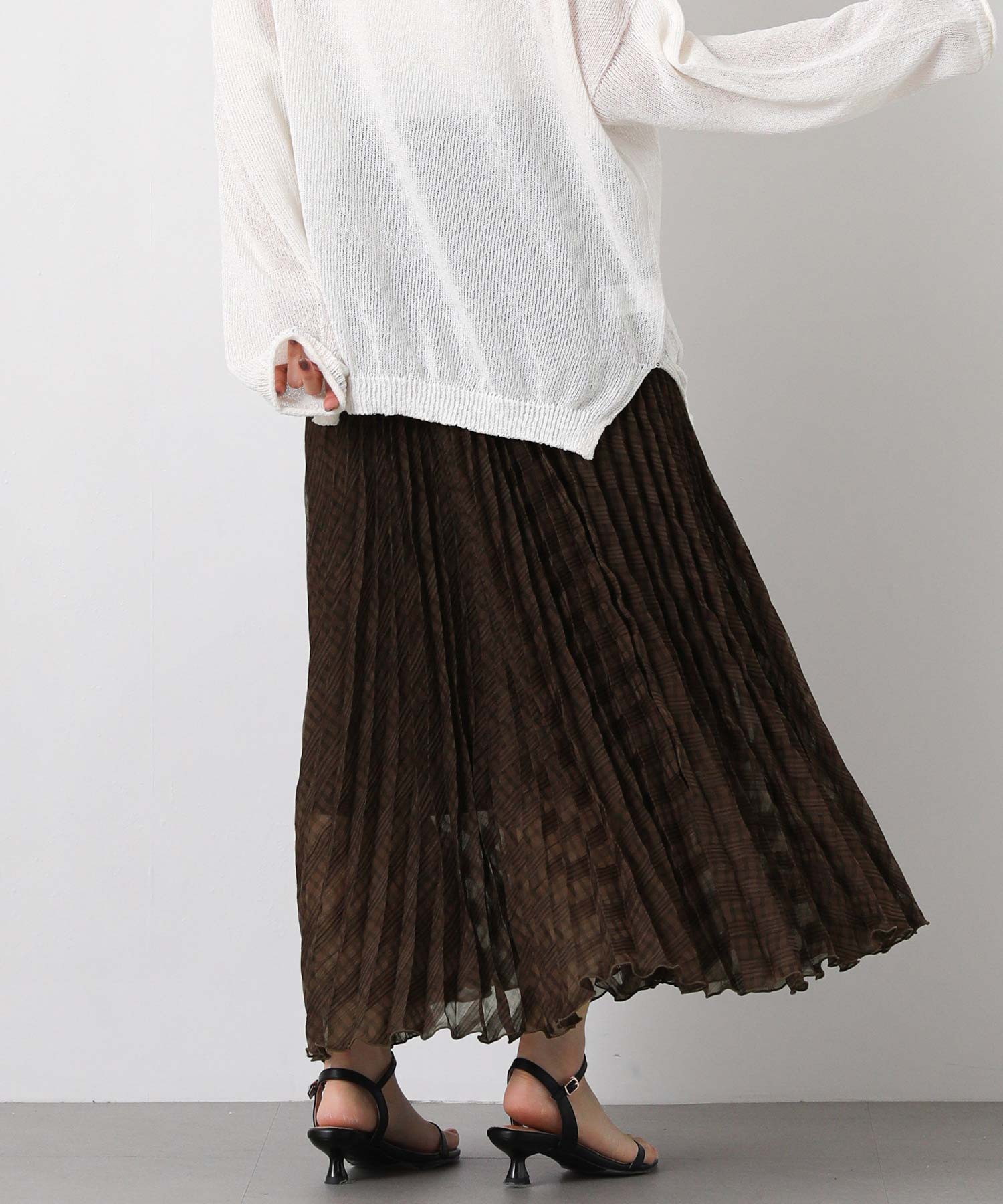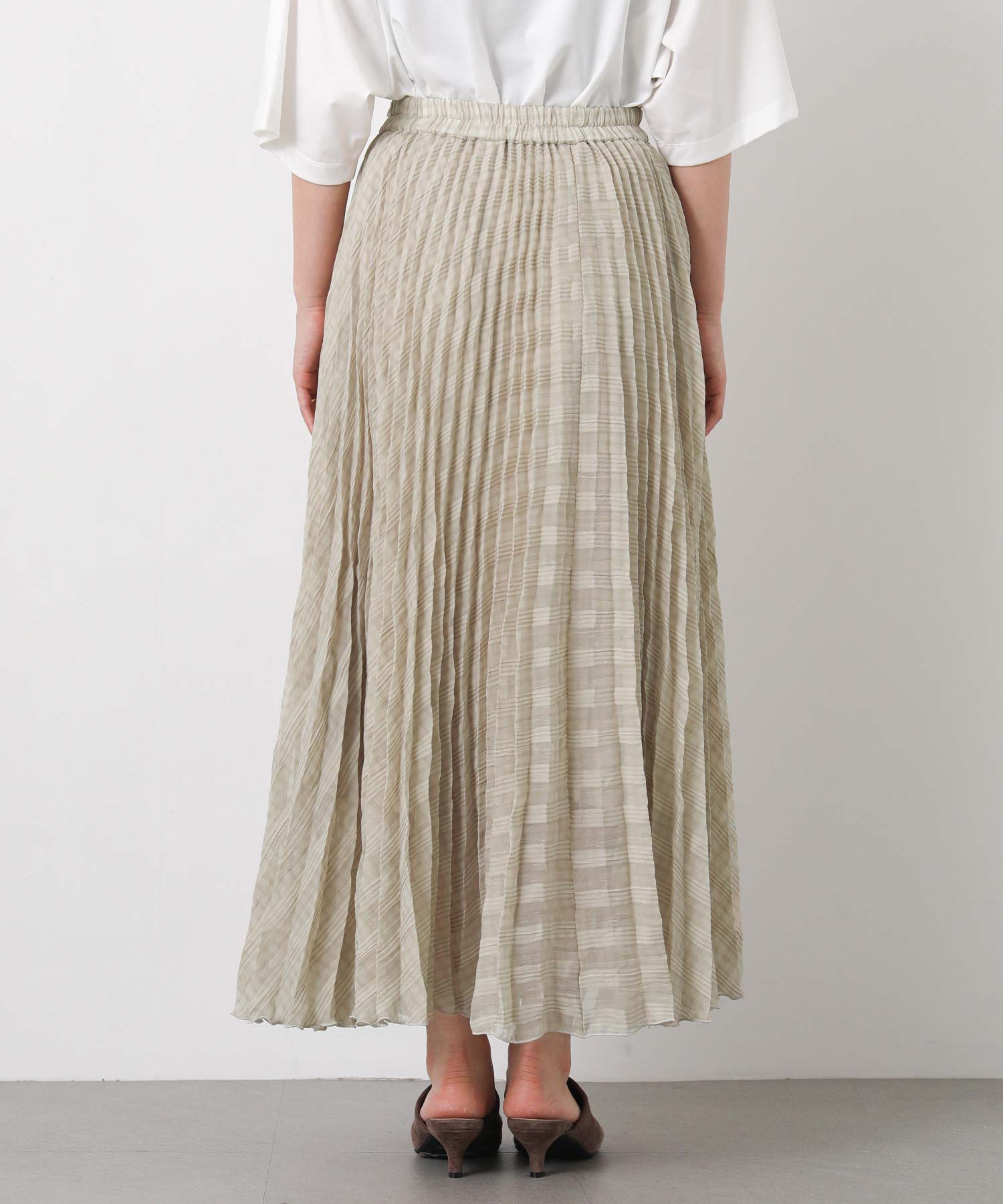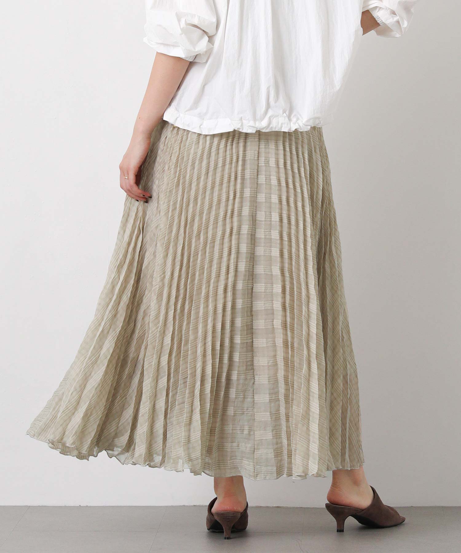 繊細なシアー素材に同系色のチェック柄を織りで表現した生地に、プリーツ加工をかけて動きを出しました。