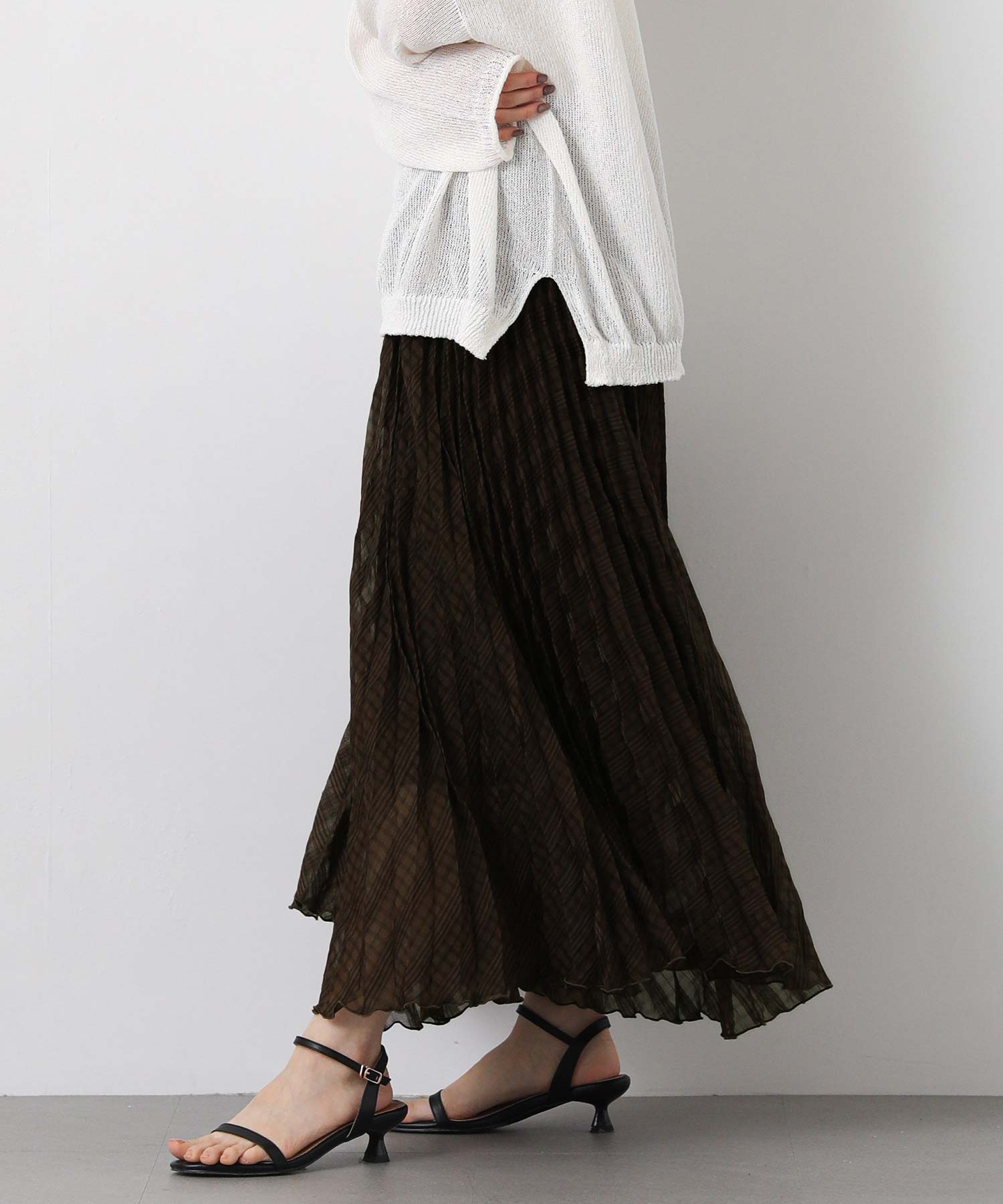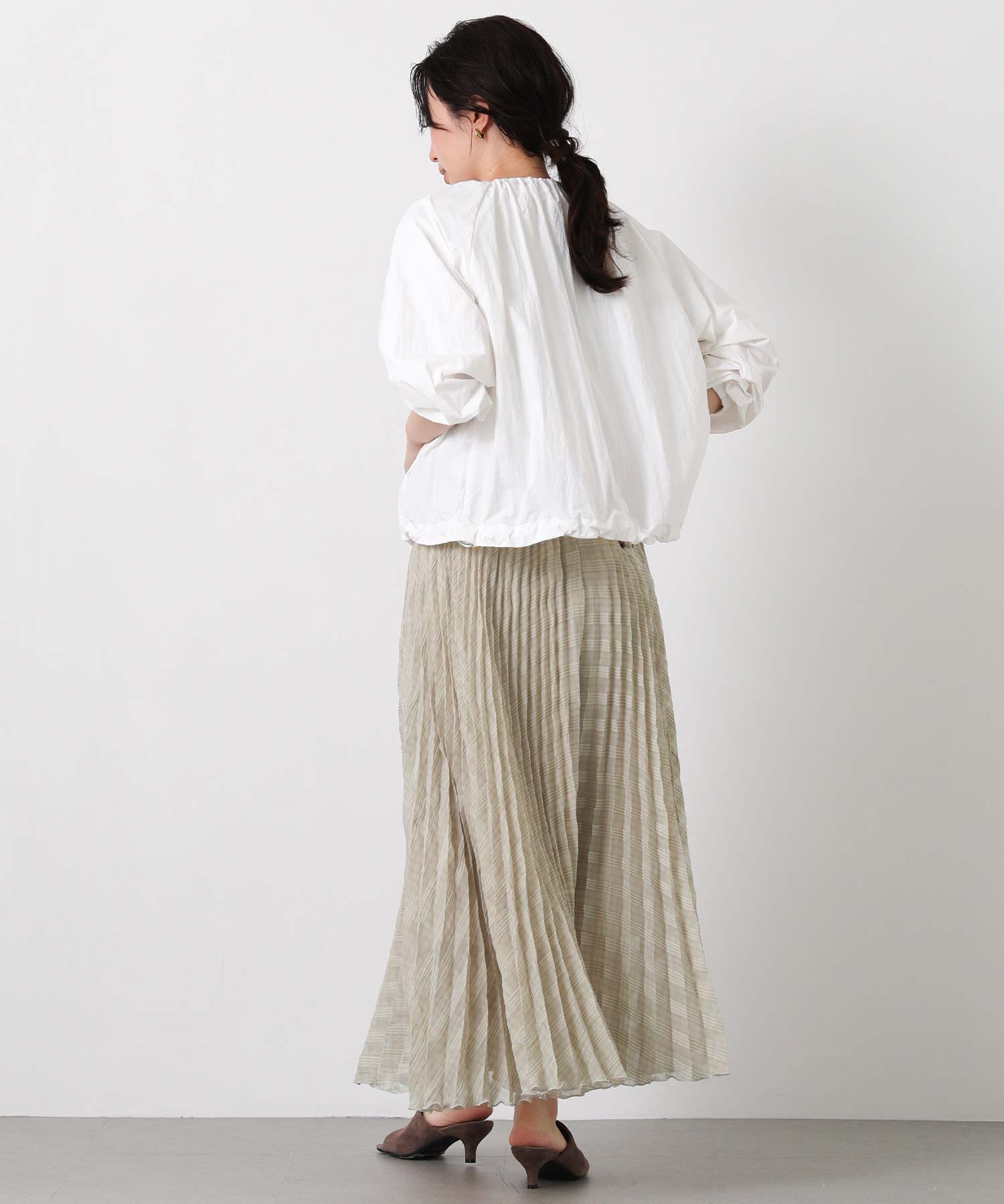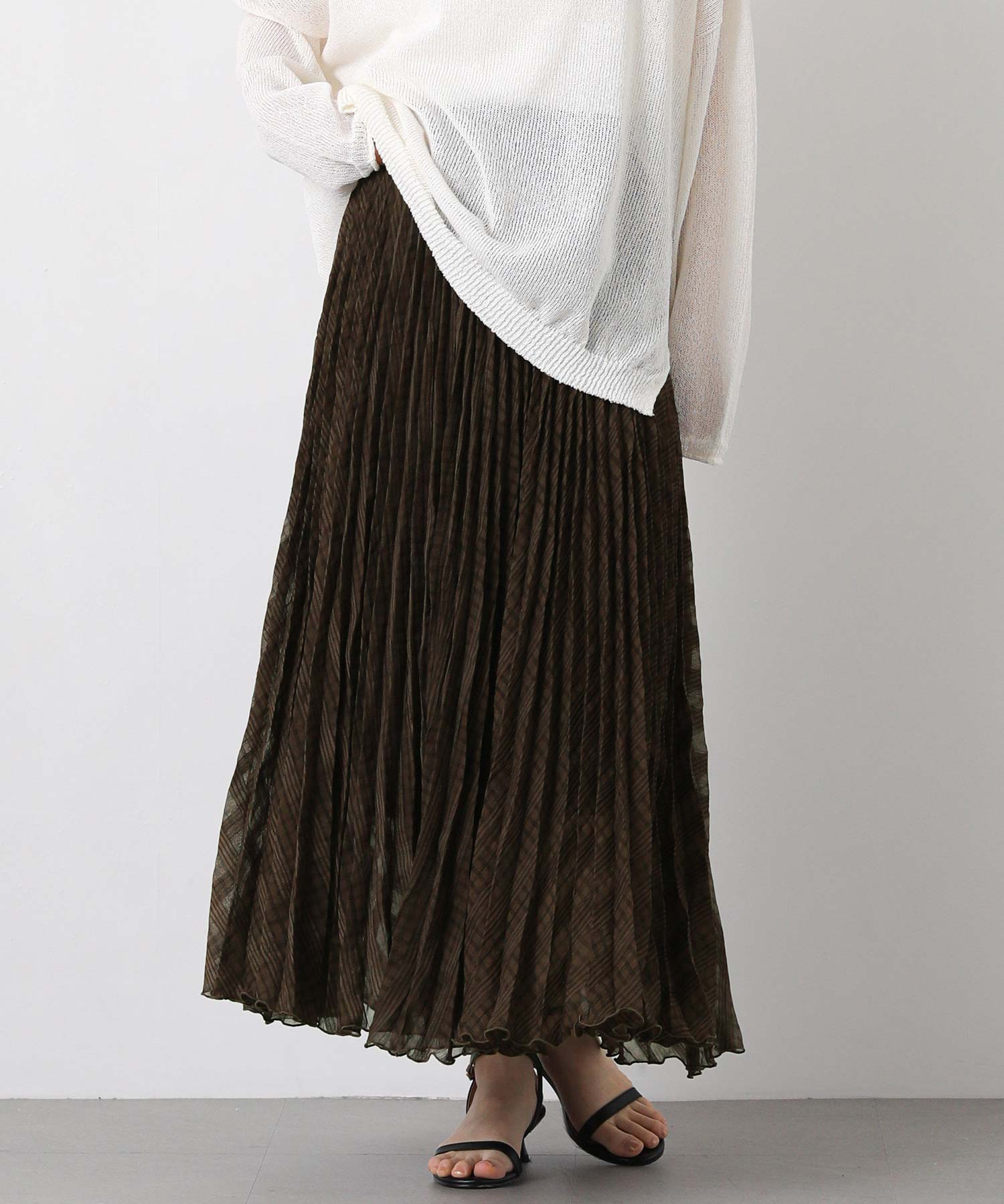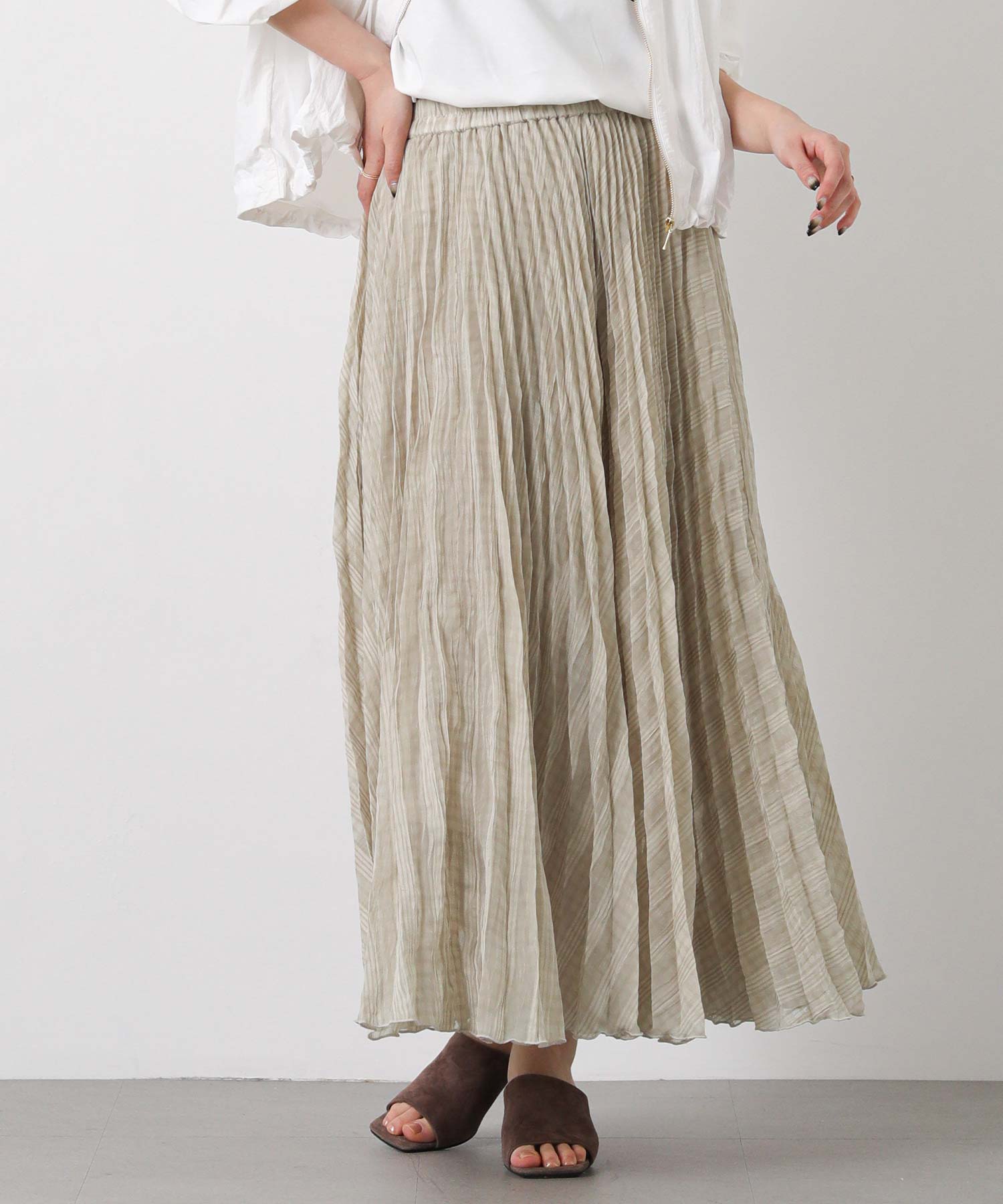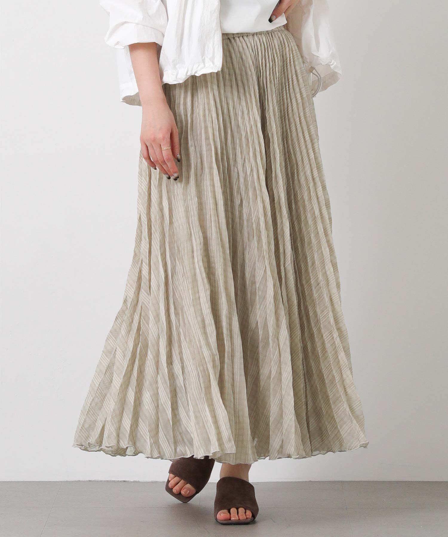 繊細なシアー素材に同系色のチェック柄を織りで表現した生地に、プリーツ加工をかけて動きを出しました。