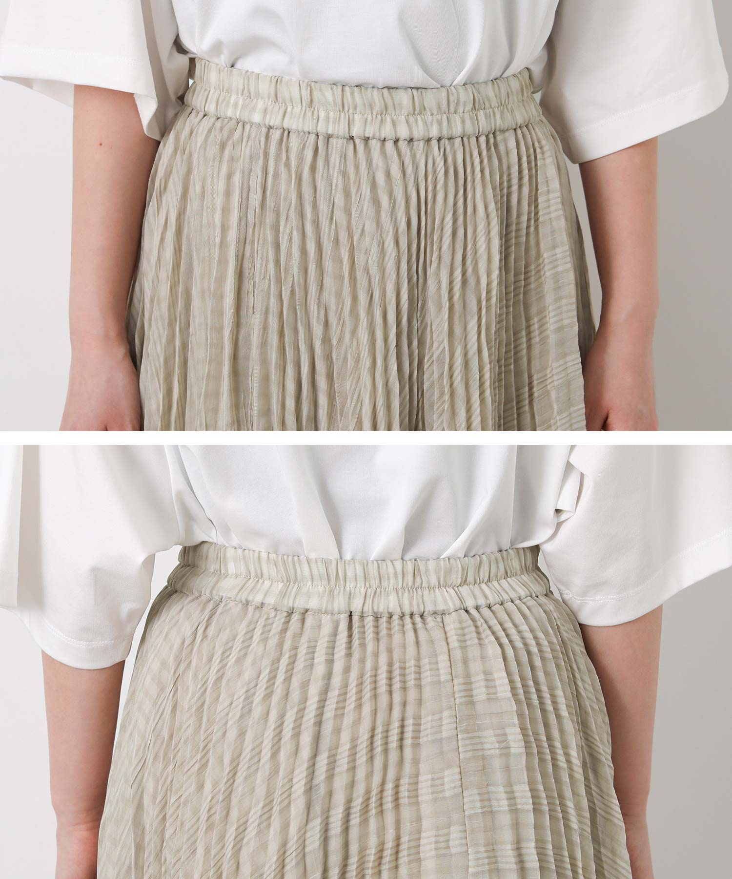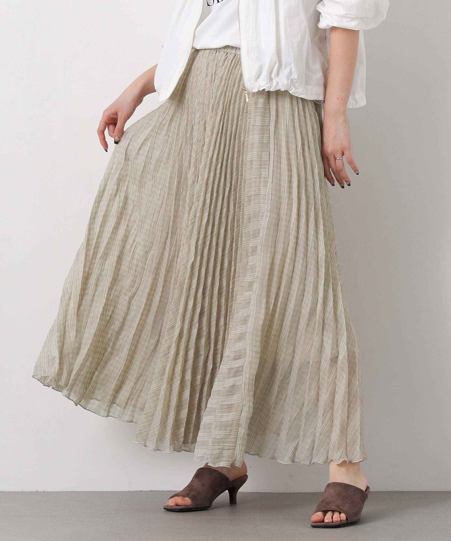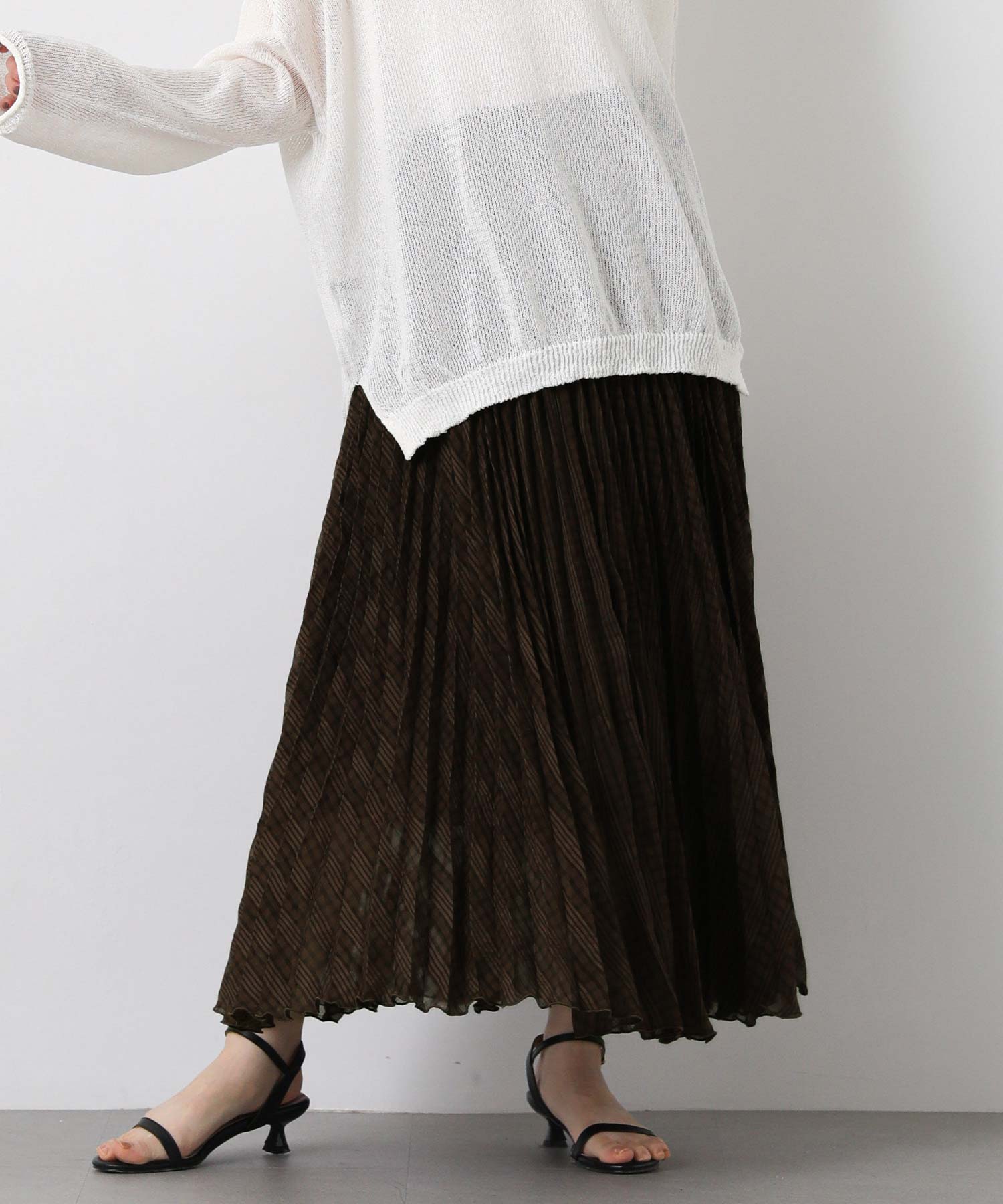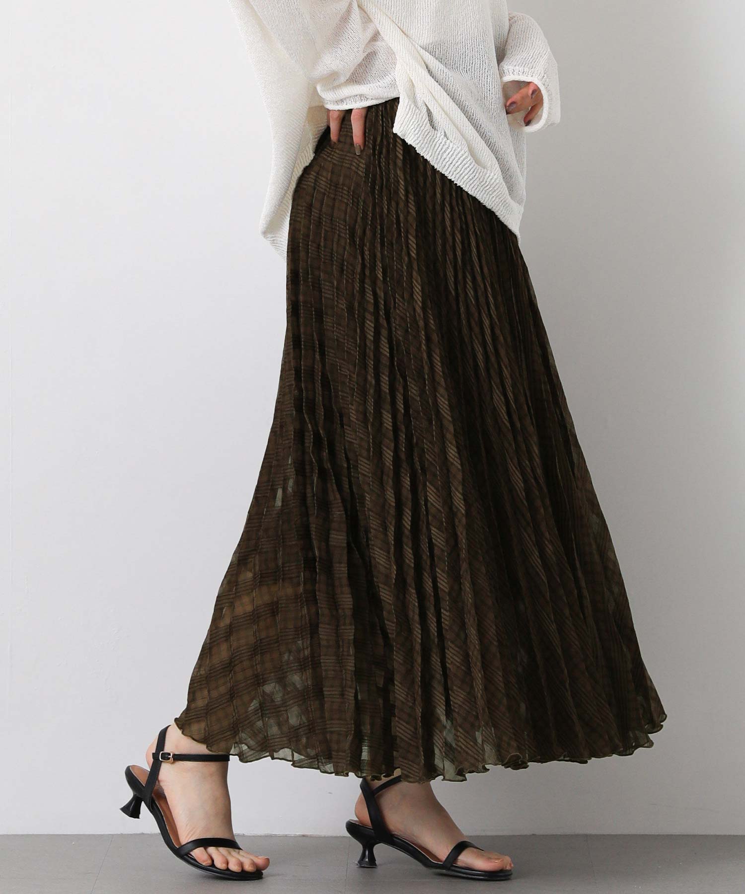 繊細なシアー素材に同系色のチェック柄を織りで表現した生地に、プリーツ加工をかけて動きを出しました。