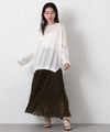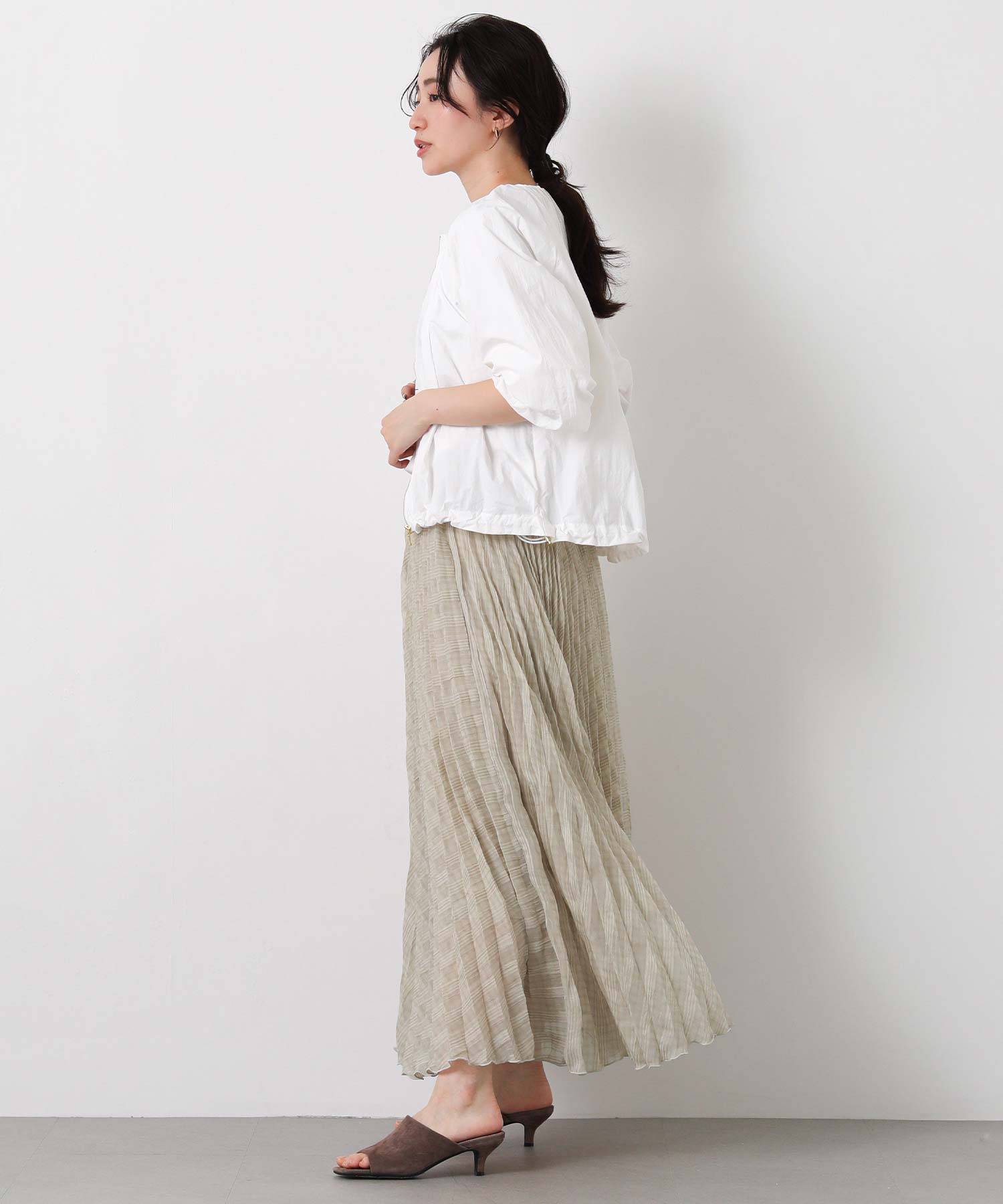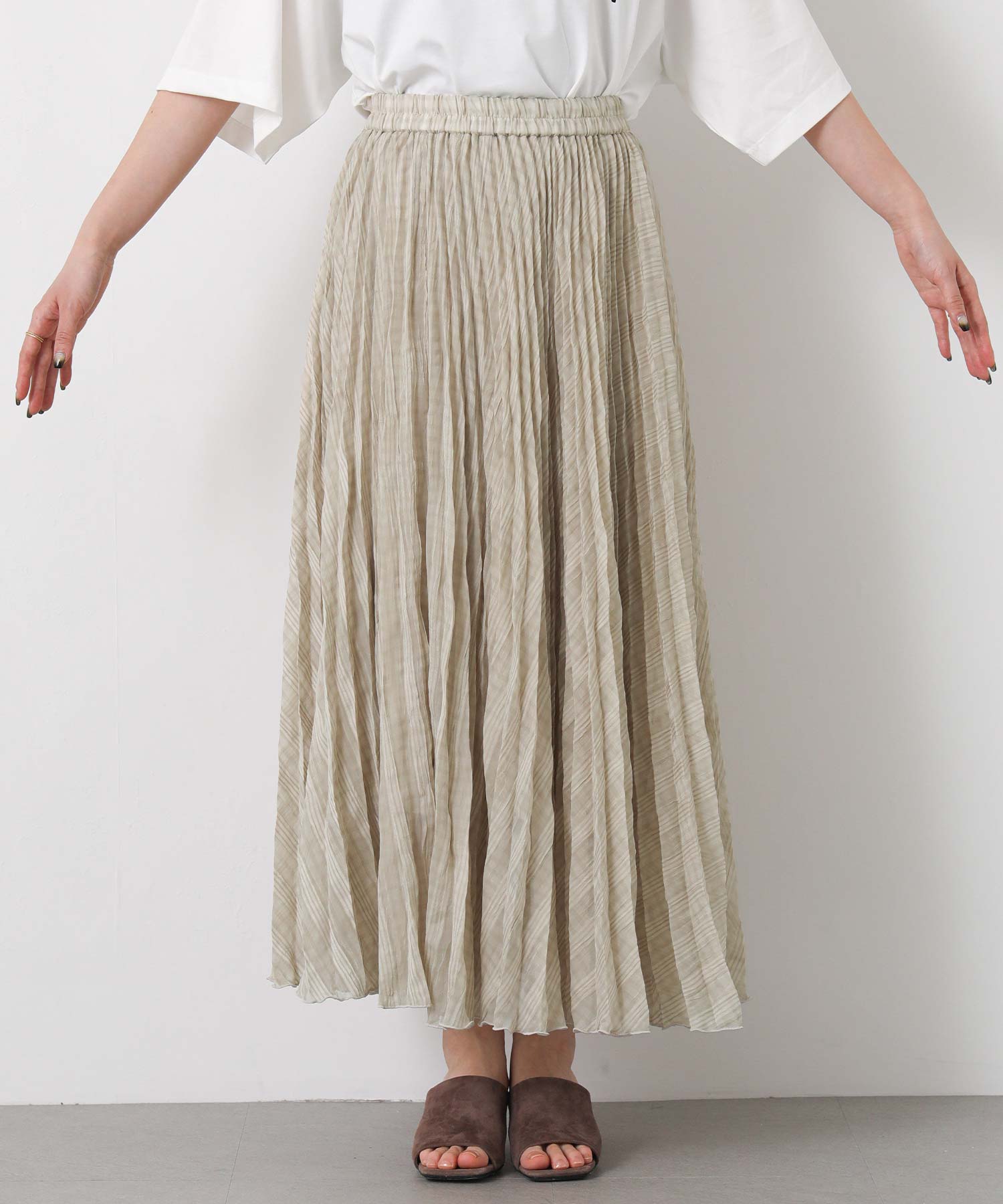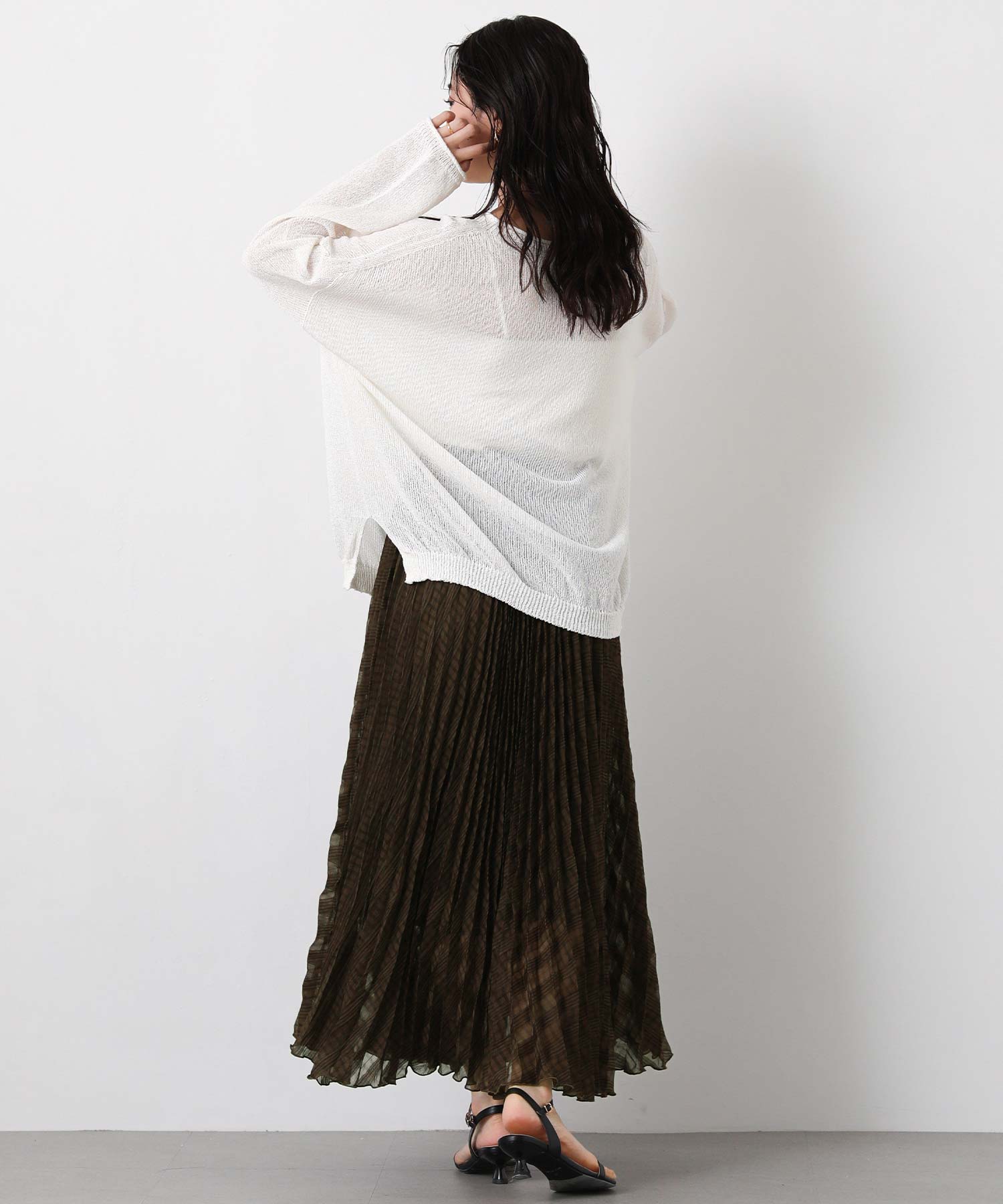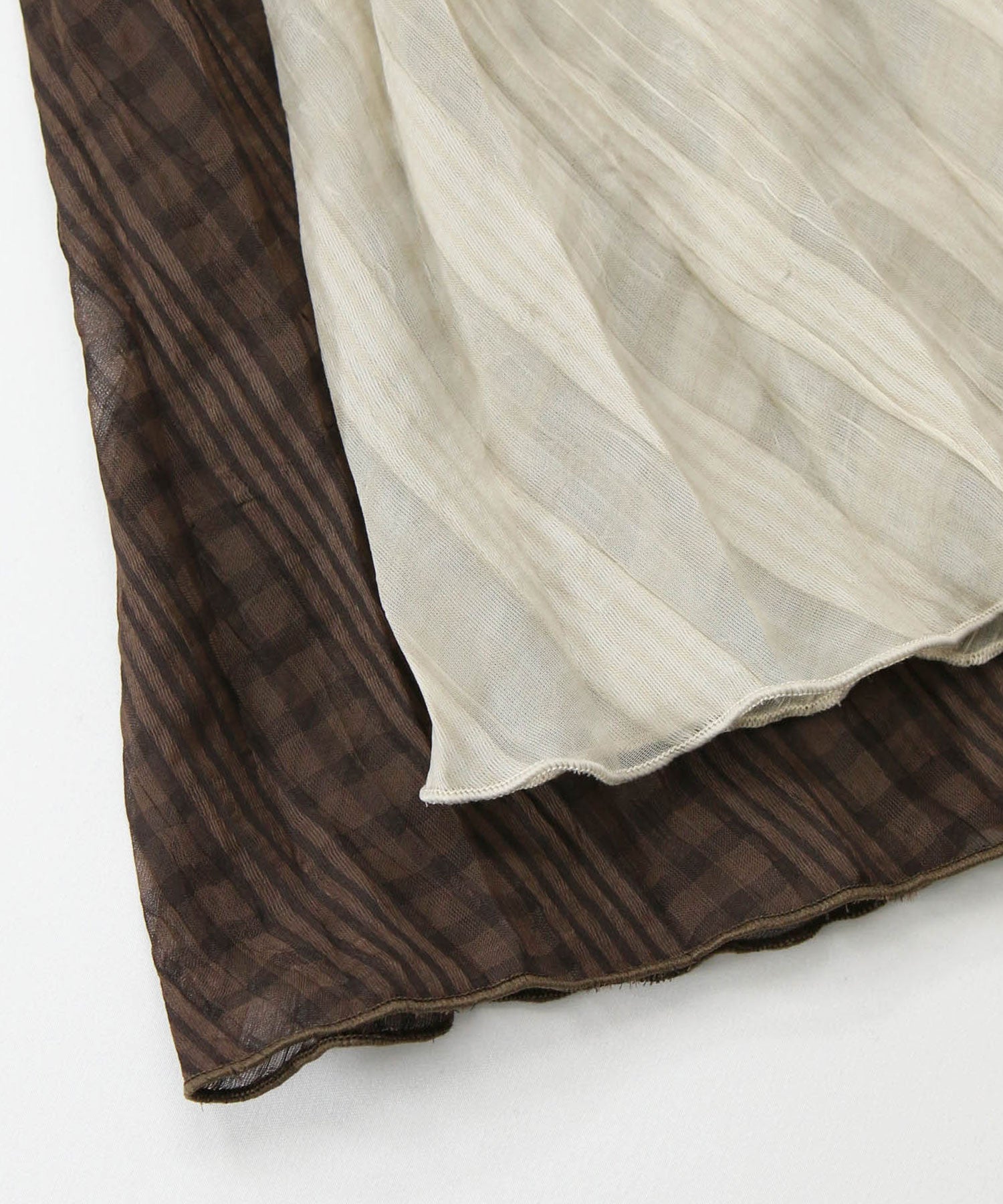 繊細なシアー素材に同系色のチェック柄を織りで表現した生地に、プリーツ加工をかけて動きを出しました。