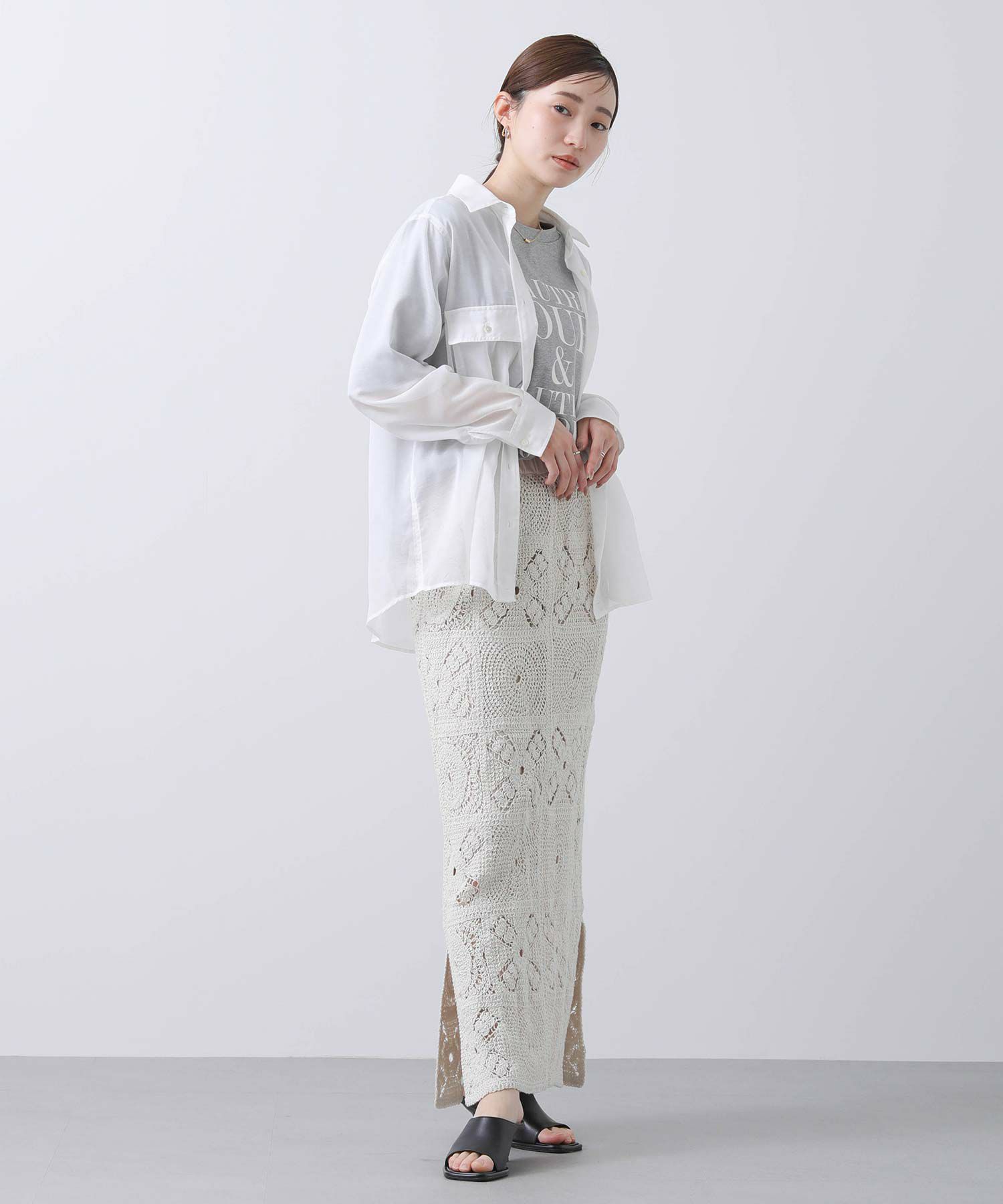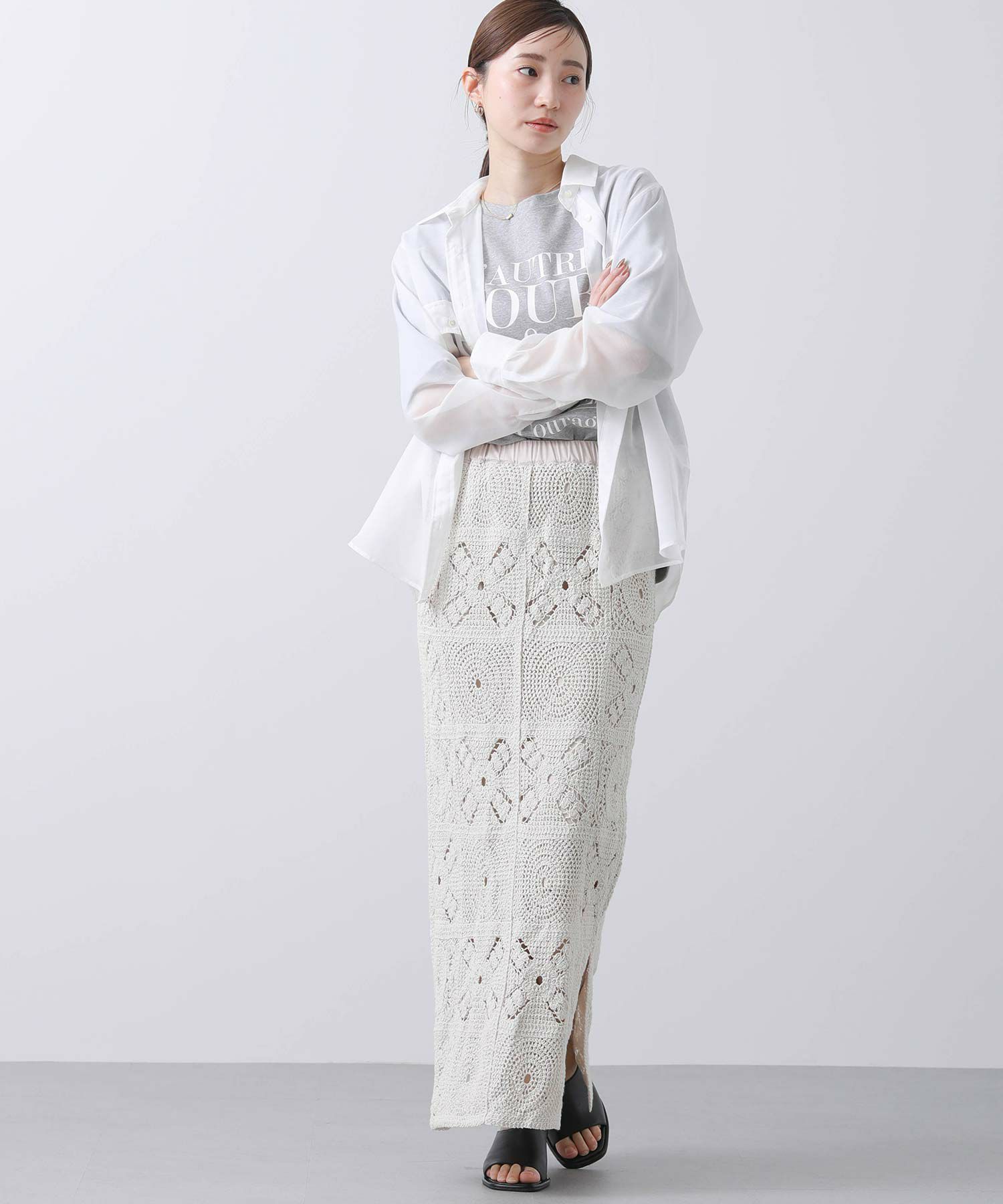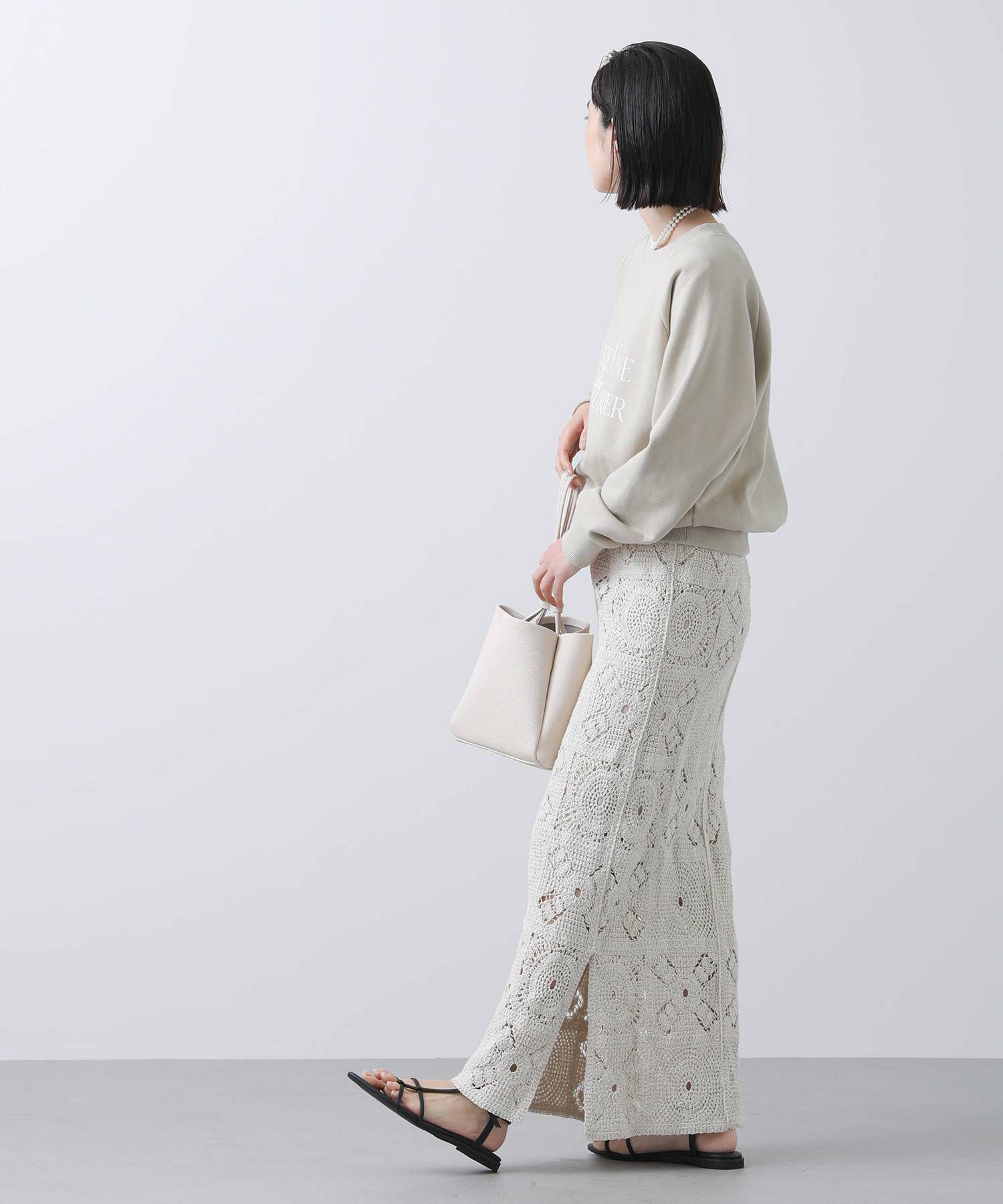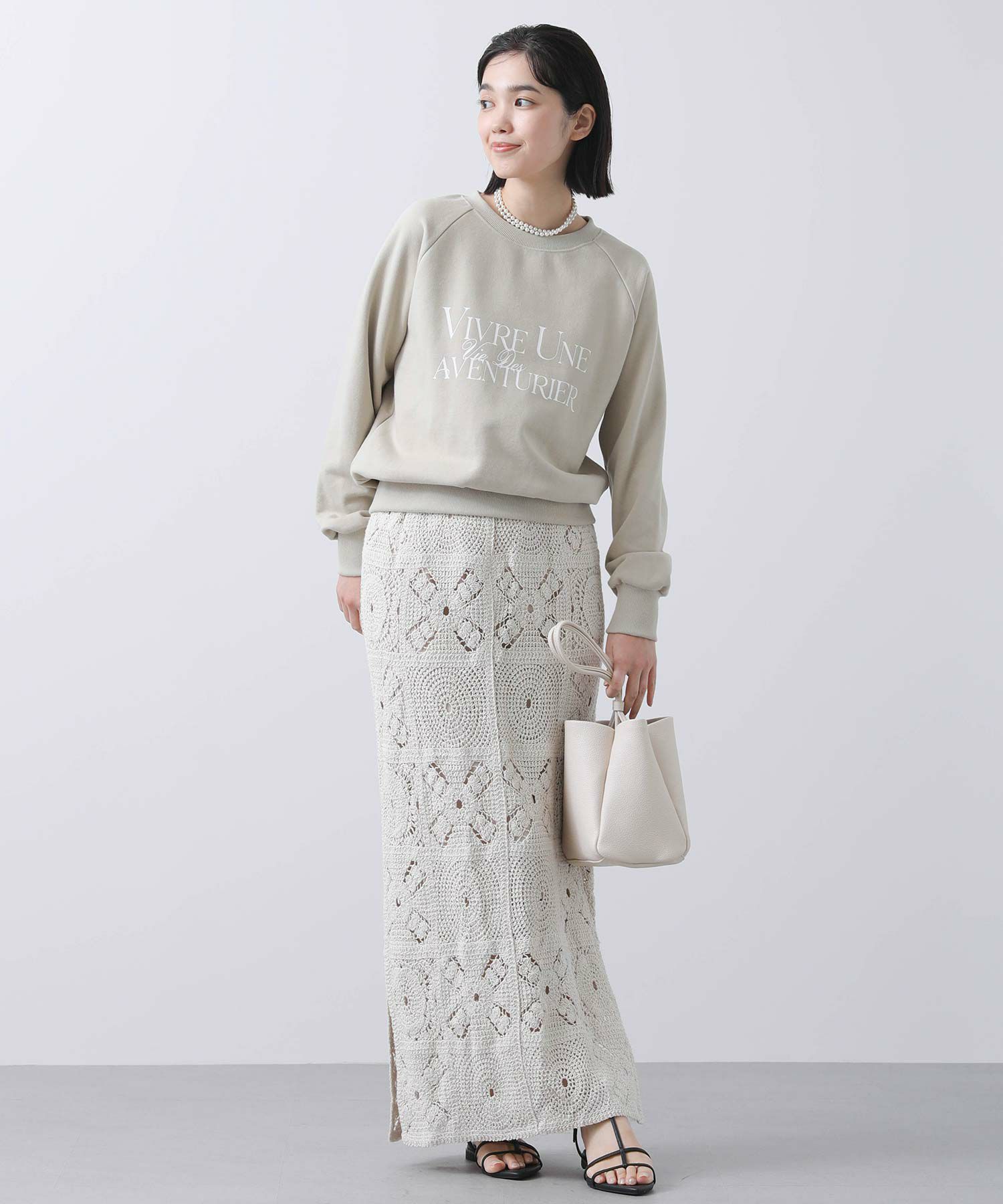 大きなクロッシェ編みがヘルシーで女性らしく、長めの丈とタイトシルエットで大人カジュアルな印象に。