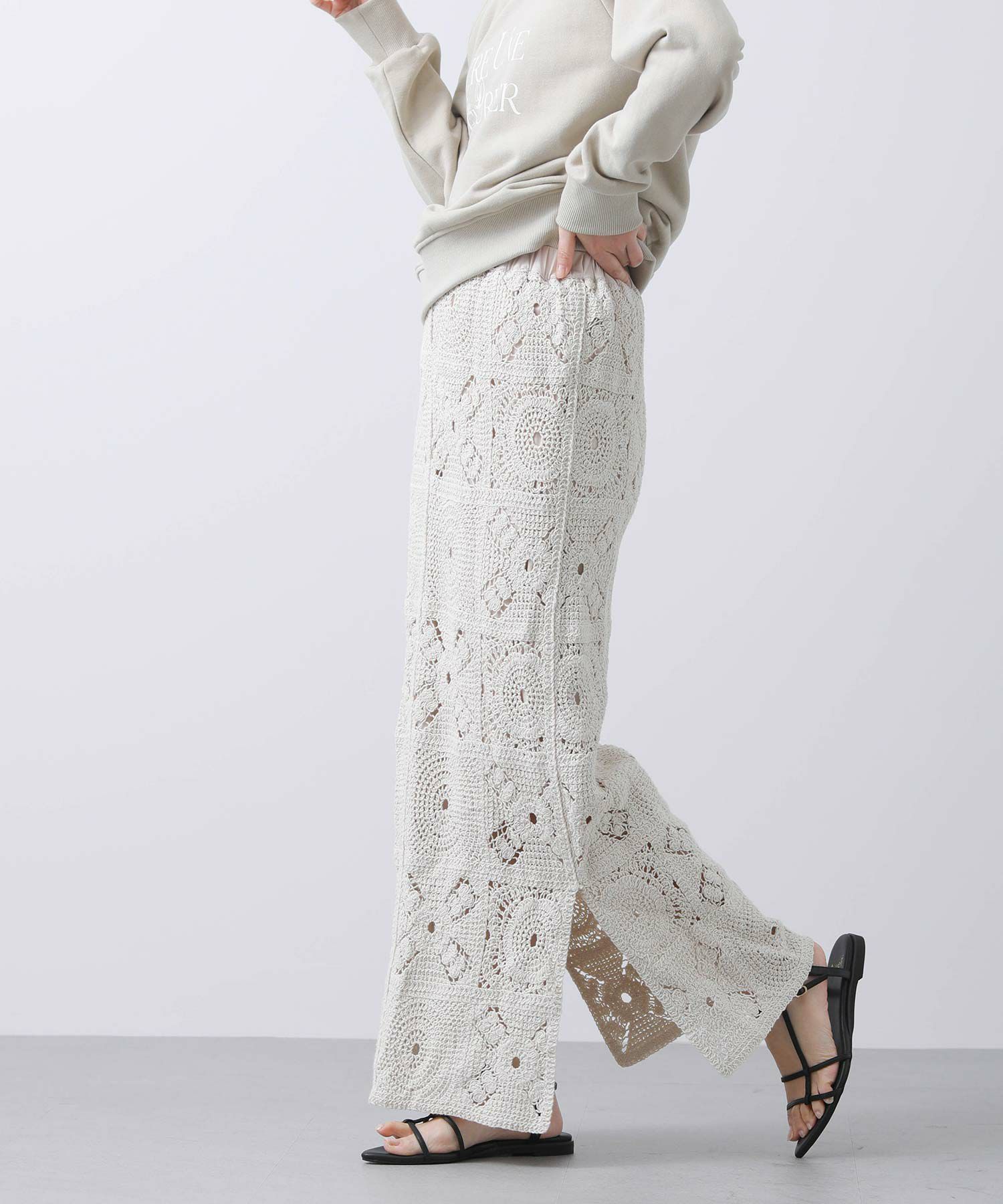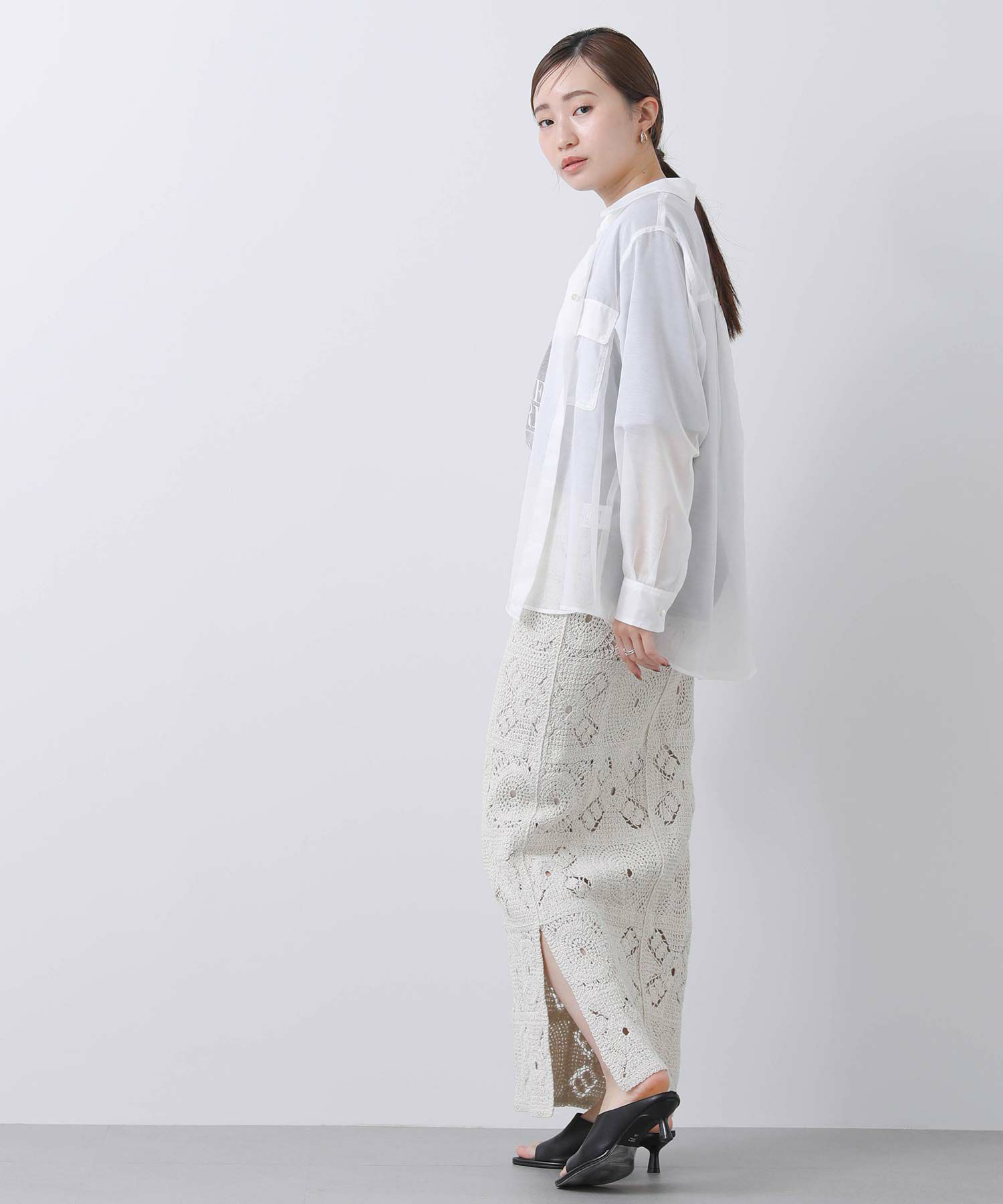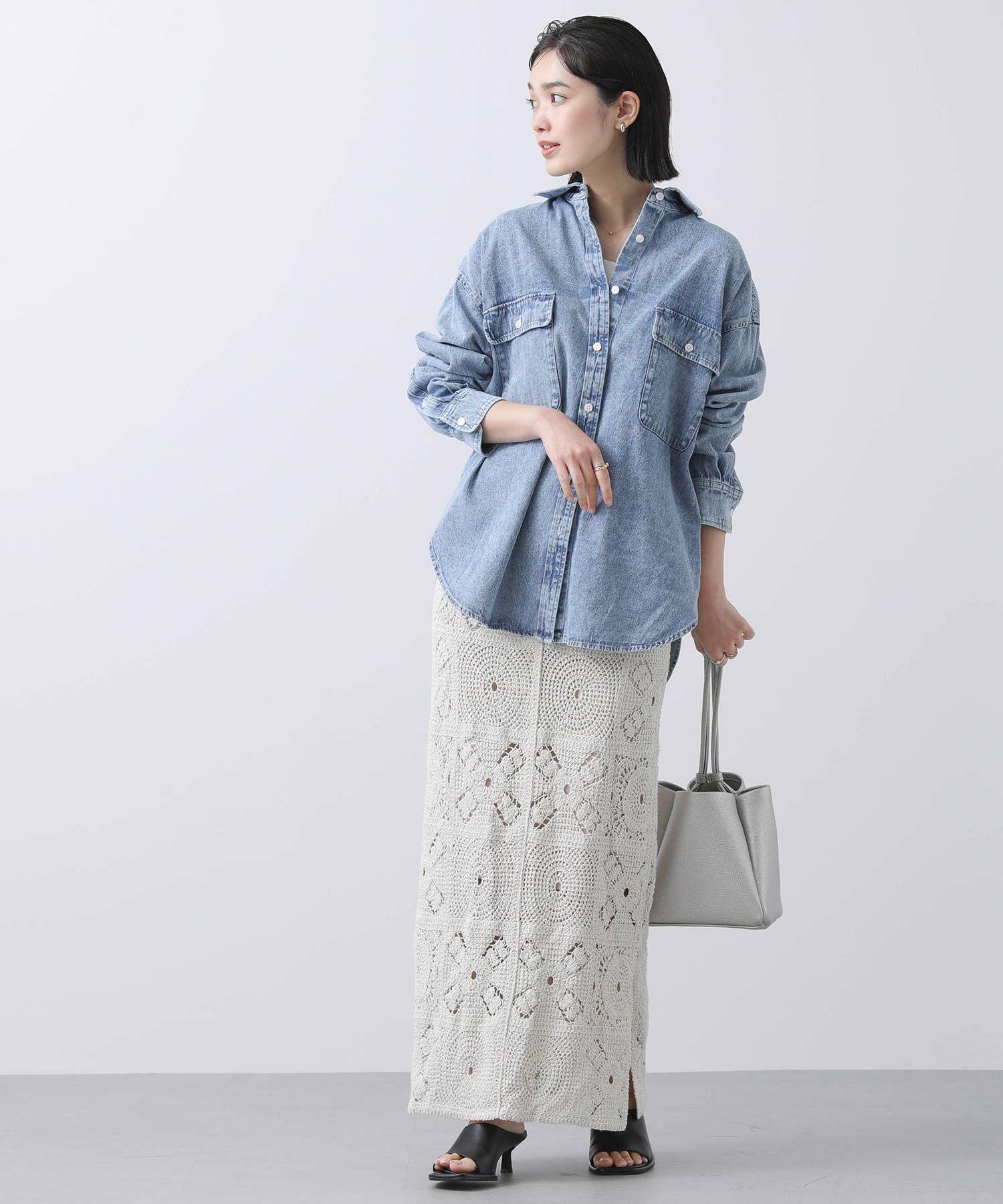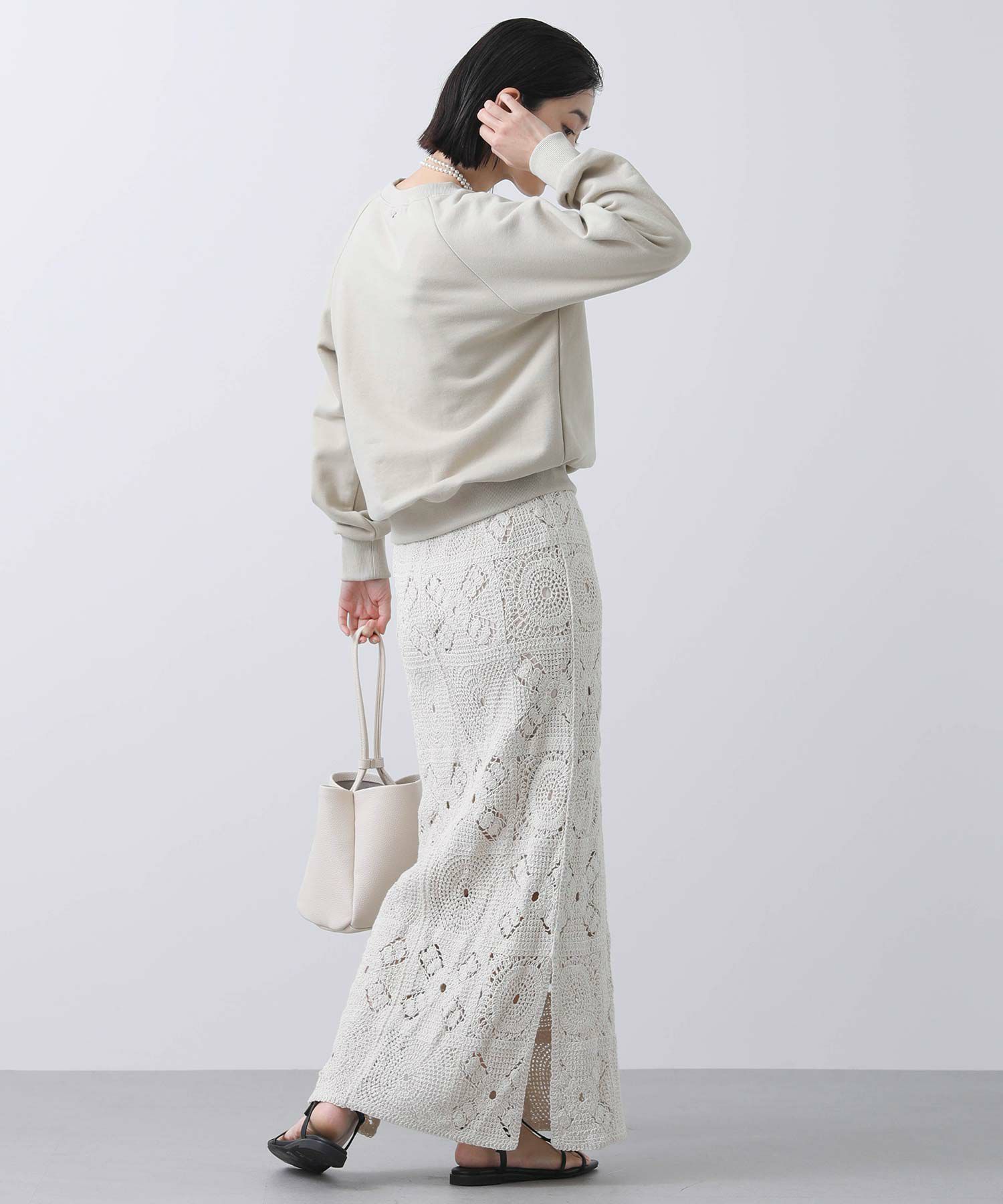 大きなクロッシェ編みがヘルシーで女性らしく、長めの丈とタイトシルエットで大人カジュアルな印象に。