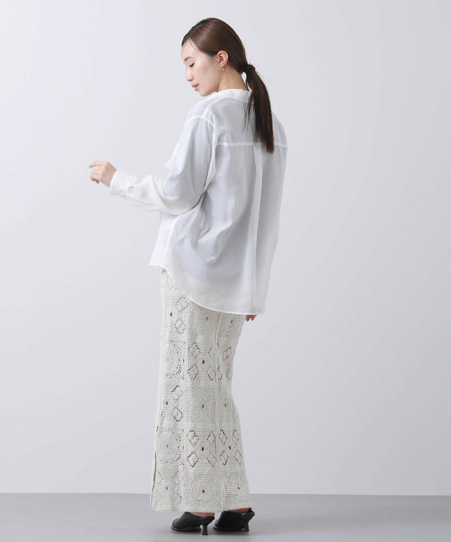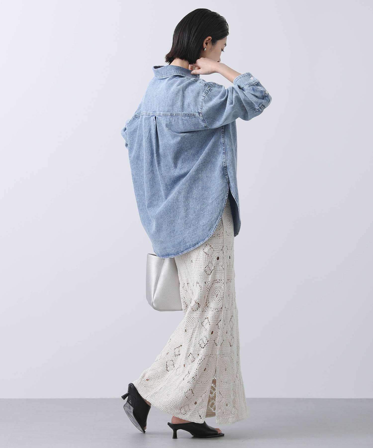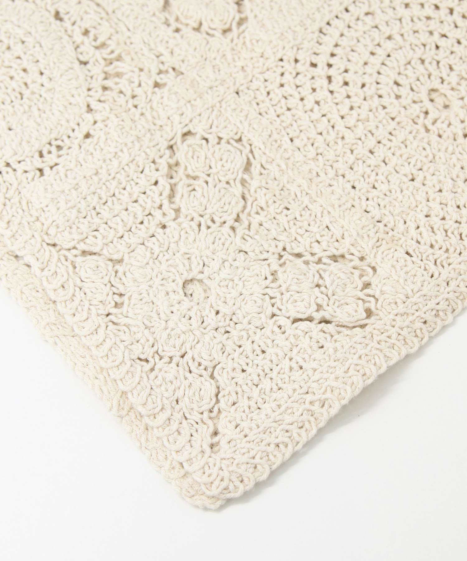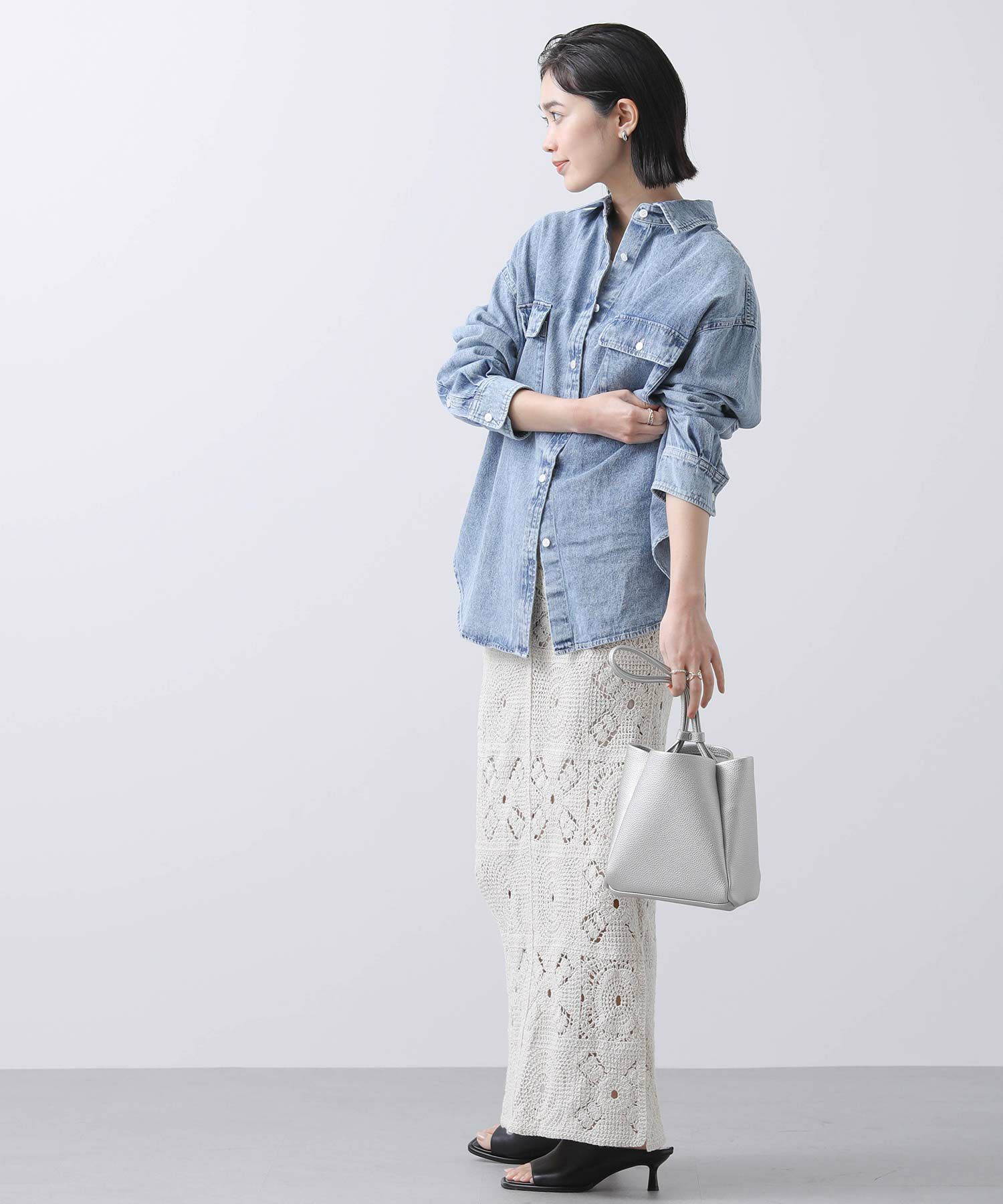大きなクロッシェ編みがヘルシーで女性らしく、長めの丈とタイトシルエットで大人カジュアルな印象に。