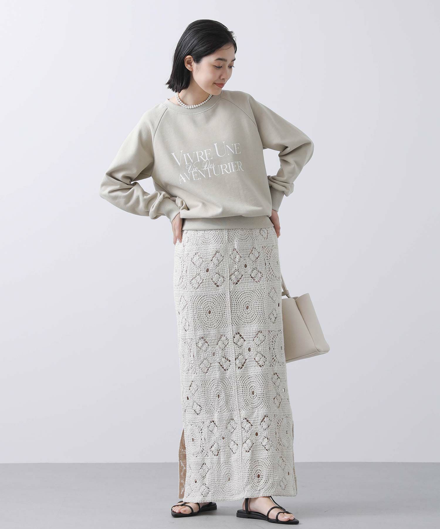 大きなクロッシェ編みがヘルシーで女性らしく、長めの丈とタイトシルエットで大人カジュアルな印象に。