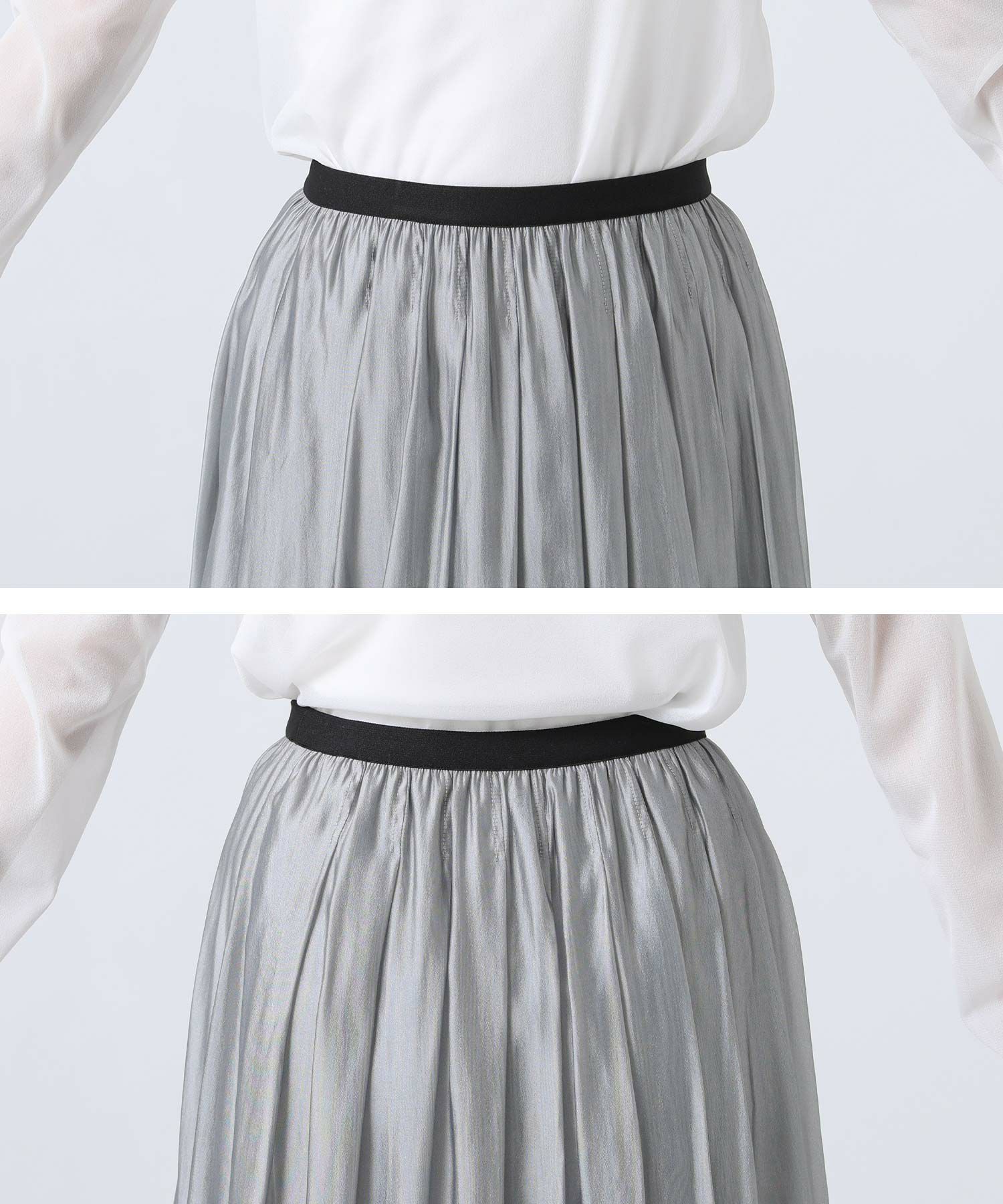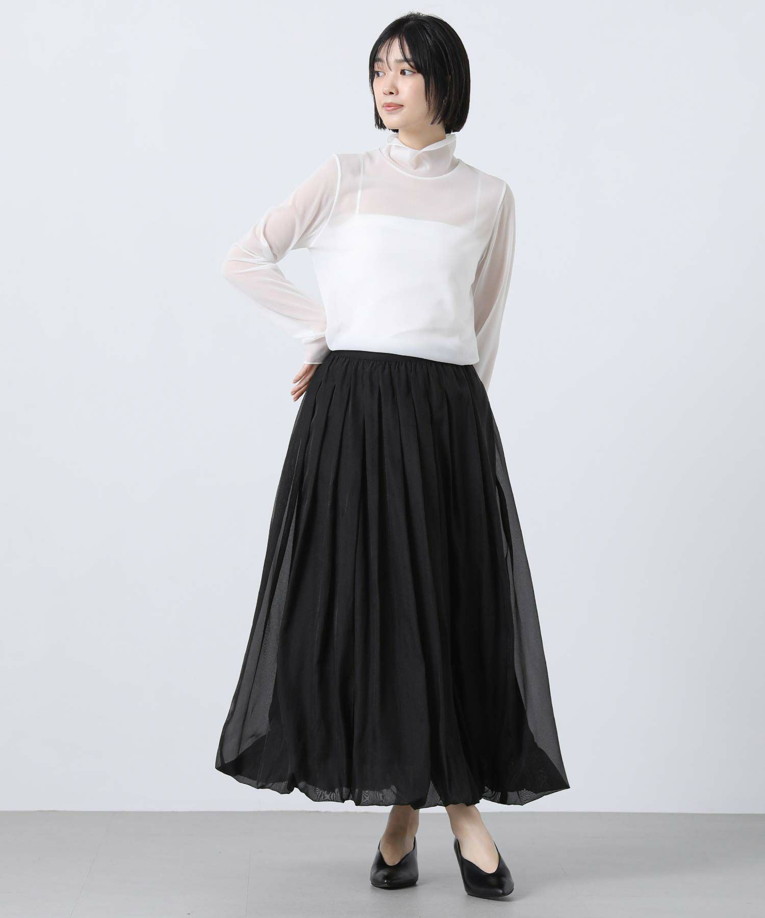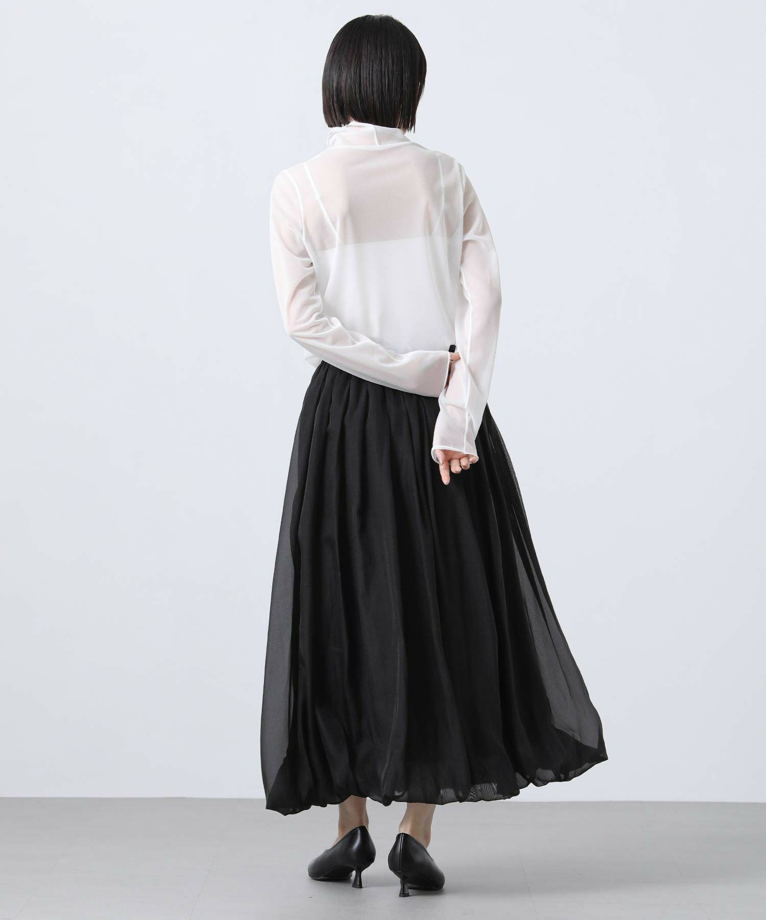 程よい透け感とツヤ感のあるシースルー生地は、軽やかで大人らしい落ち着いた印象。