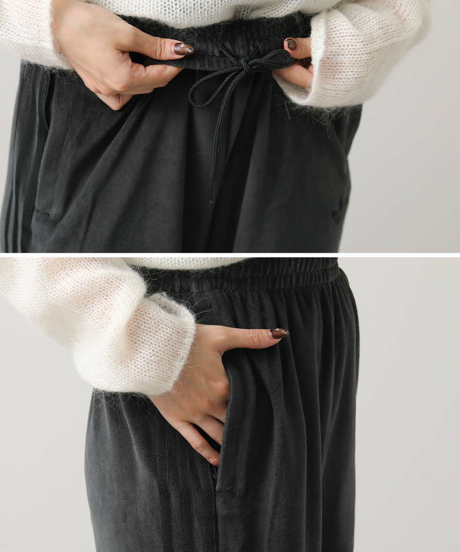 ソフトなベロア生地で作られているので、自宅でのリラックスタイムにもお出かけにもピッタリ。