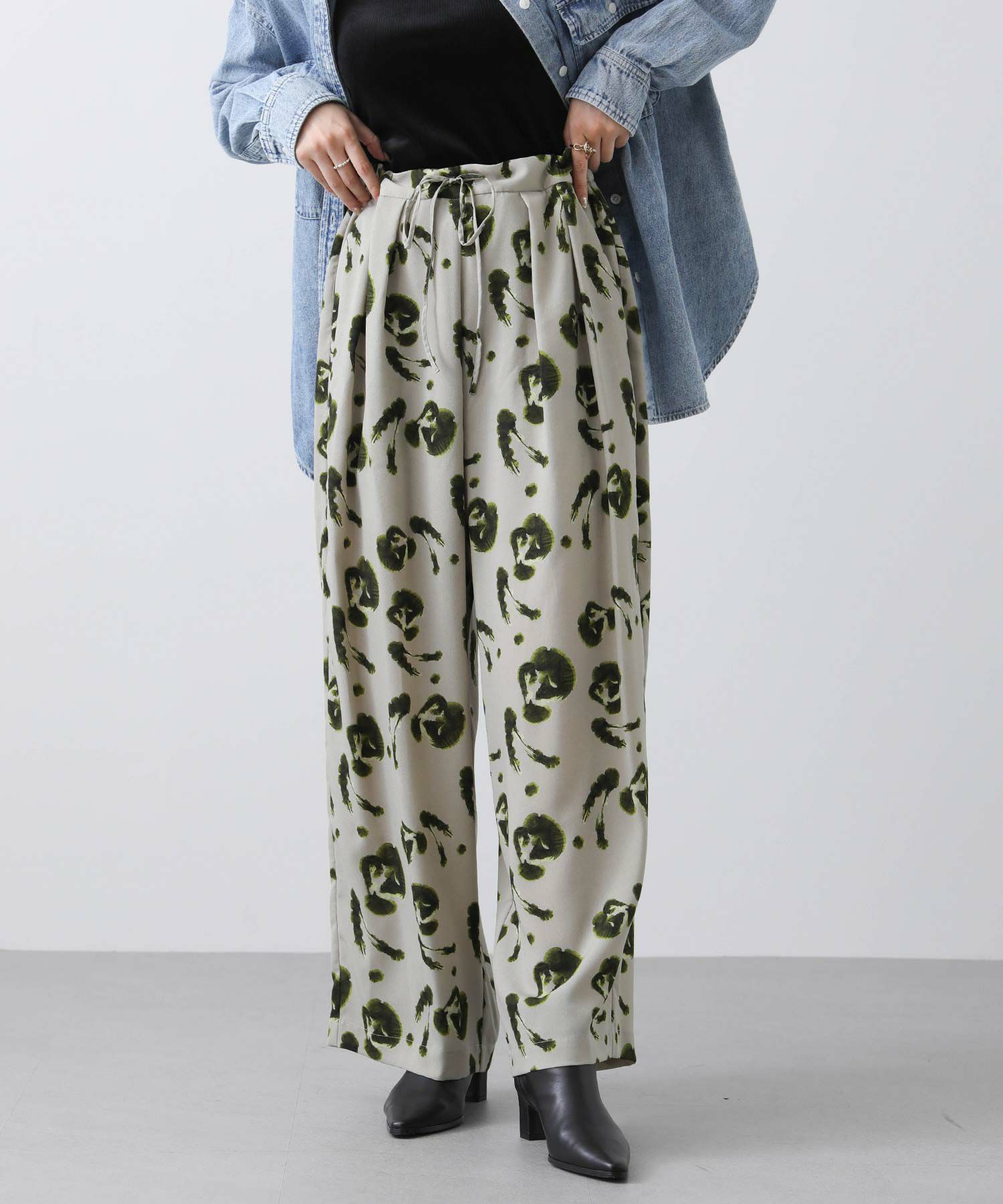 ぼかした花柄が可愛い着映えプリントイージーパンツ。