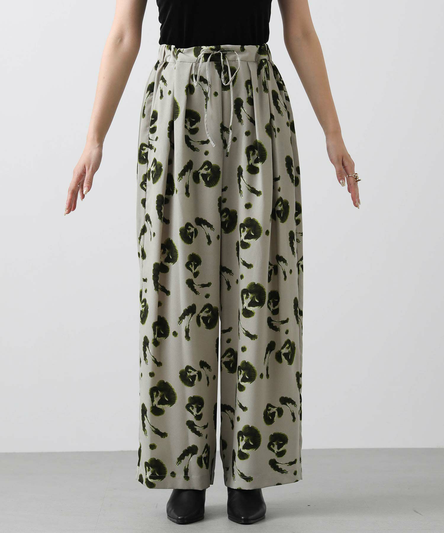ぼかした花柄が可愛い着映えプリントイージーパンツ。