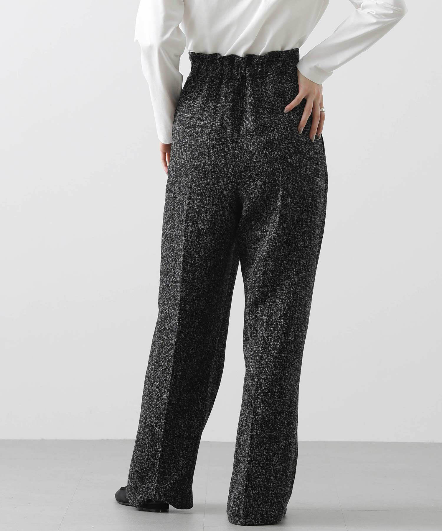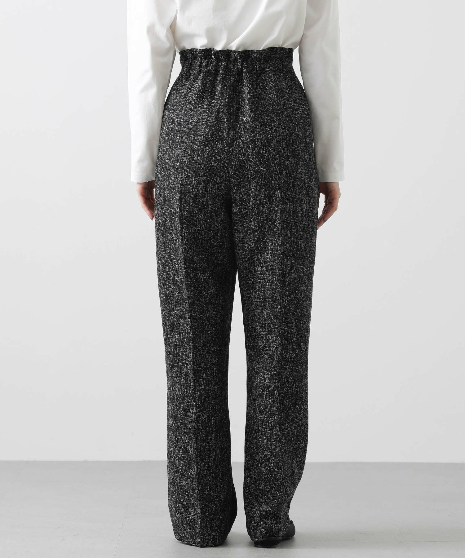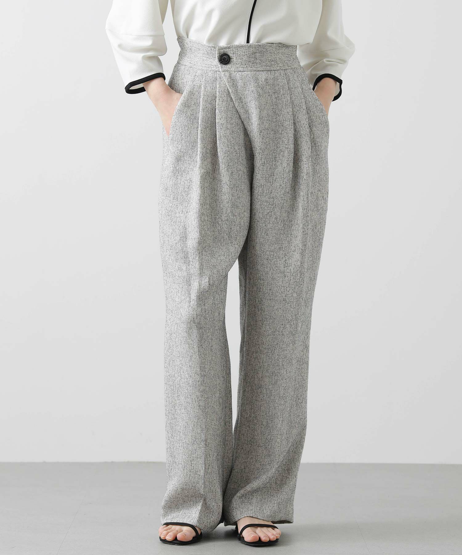 細かく織られたツイード素材を使用したタックパンツです。タック入りのフロントのラップデザインがポイントになる一着。ゴム仕様の後ろウエスト+ボタンを2つつけることでさらにアジャスト可能に。