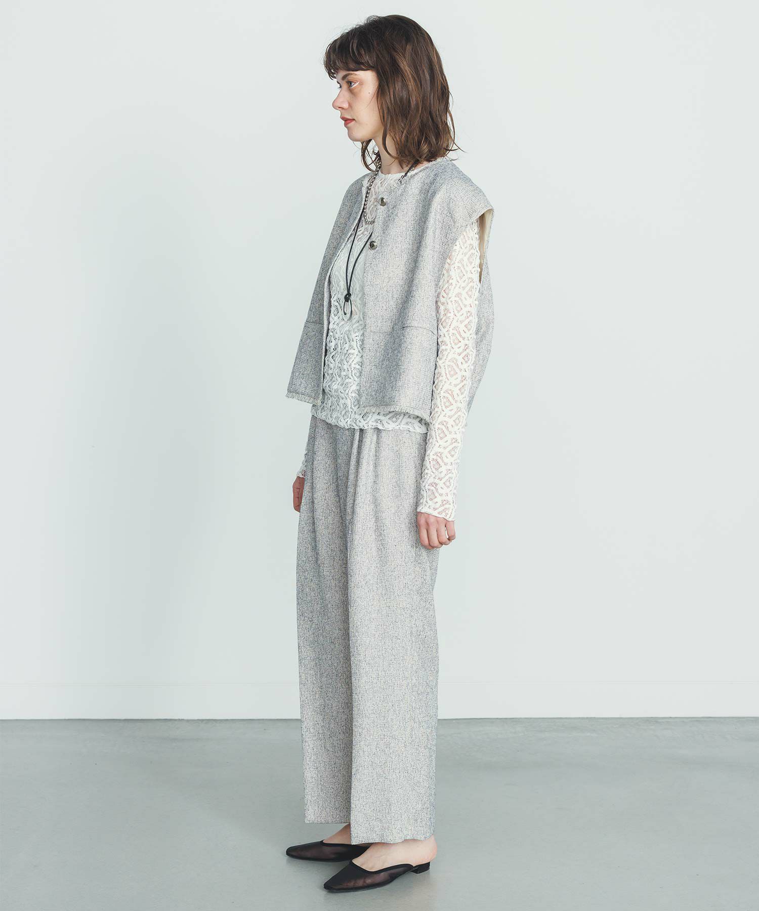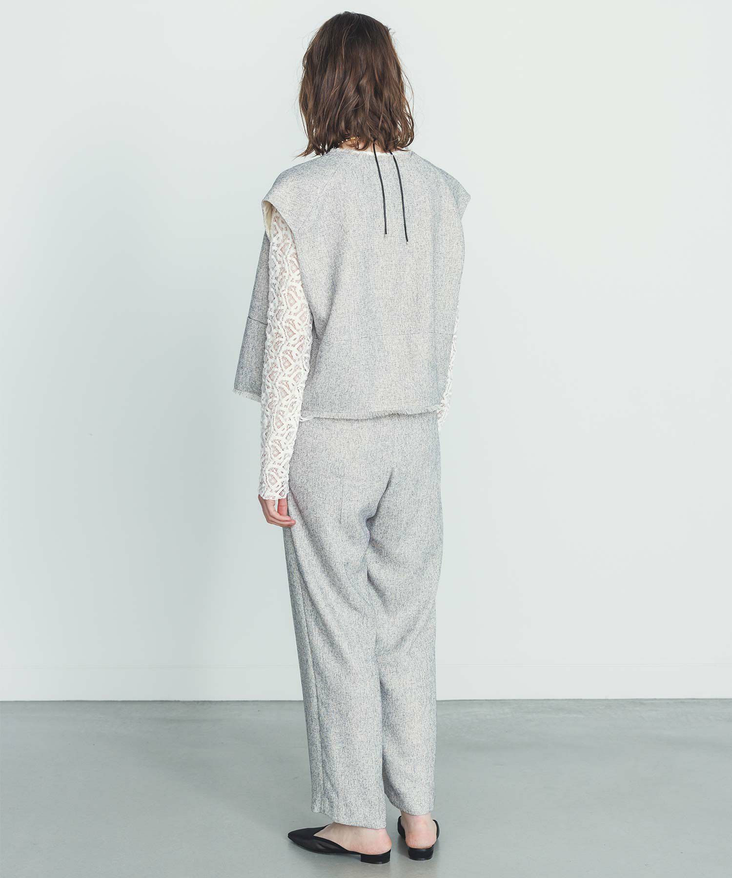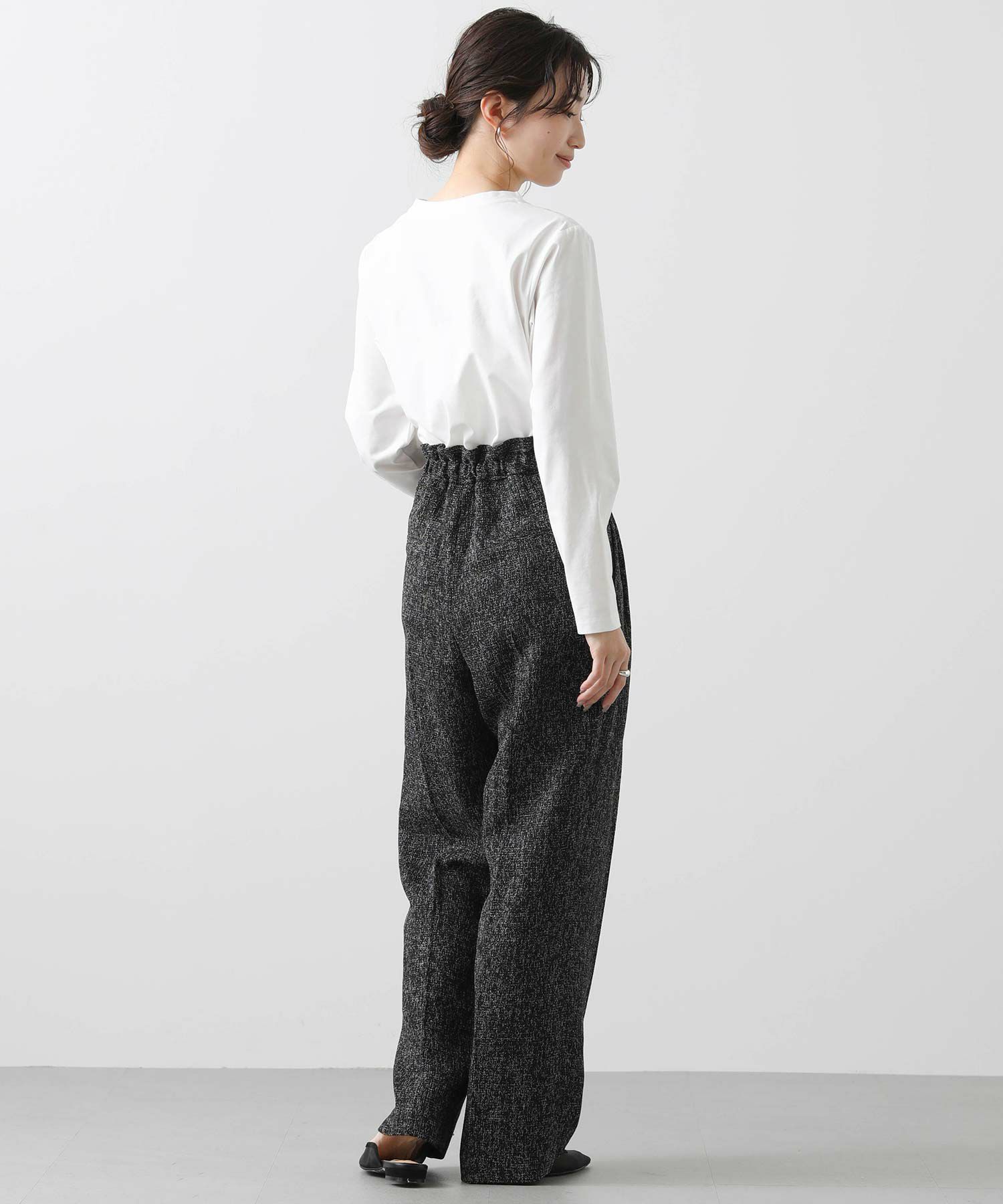 細かく織られたツイード素材を使用したタックパンツです。タック入りのフロントのラップデザインがポイントになる一着。ゴム仕様の後ろウエスト+ボタンを2つつけることでさらにアジャスト可能に。