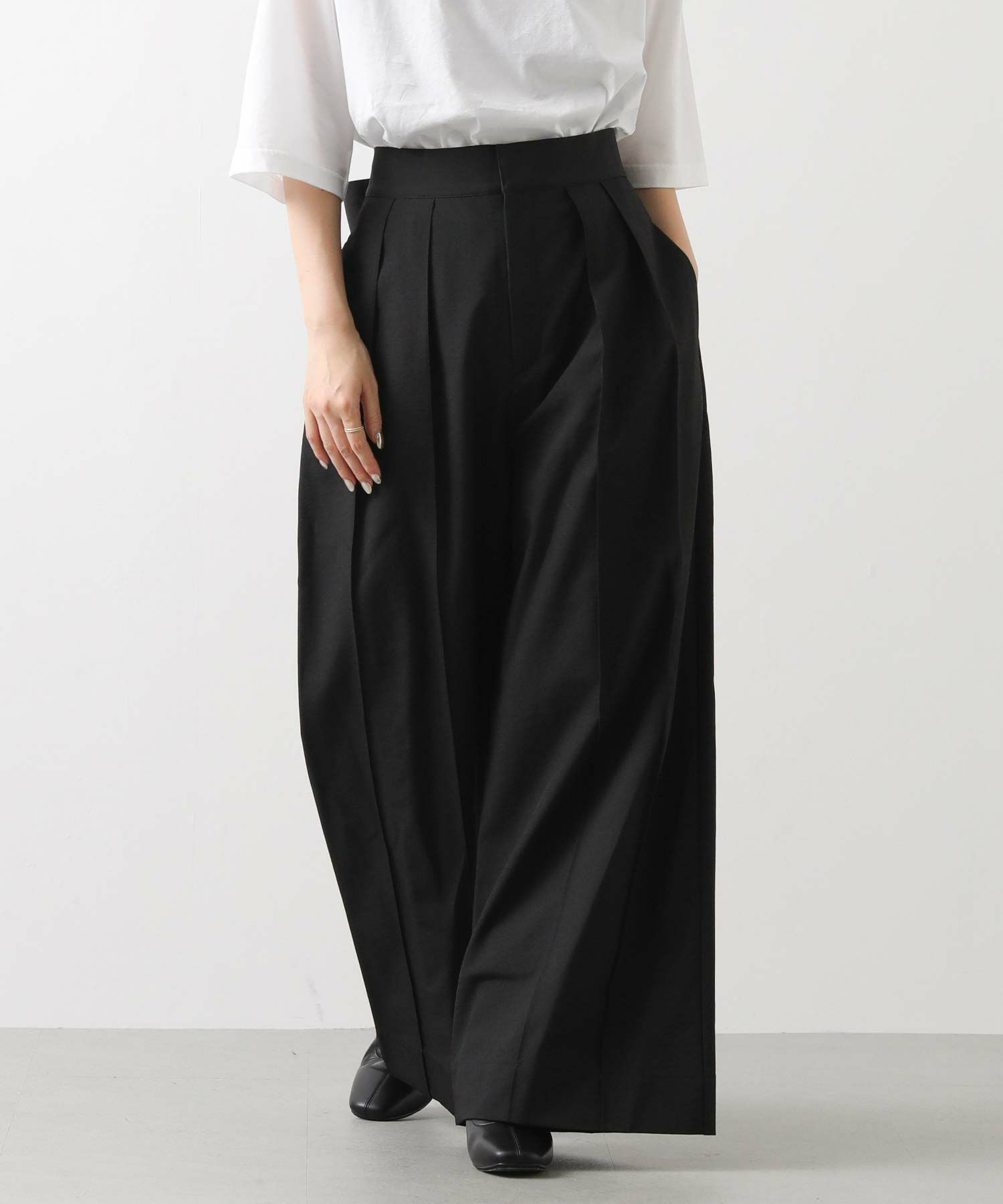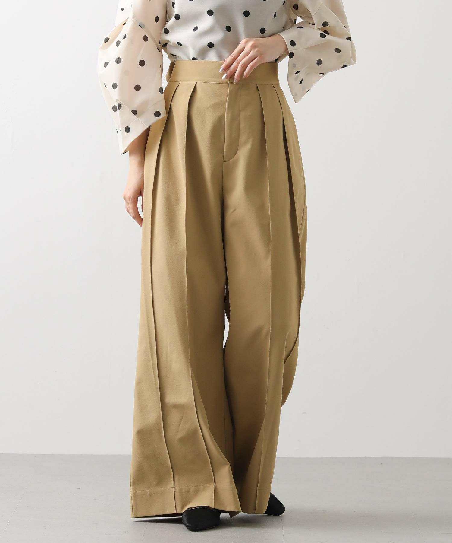 【Mewl(ミュール】から、バックスタイルの大きめリボンがポイントになったピンタックワイドパンツをセレクト。