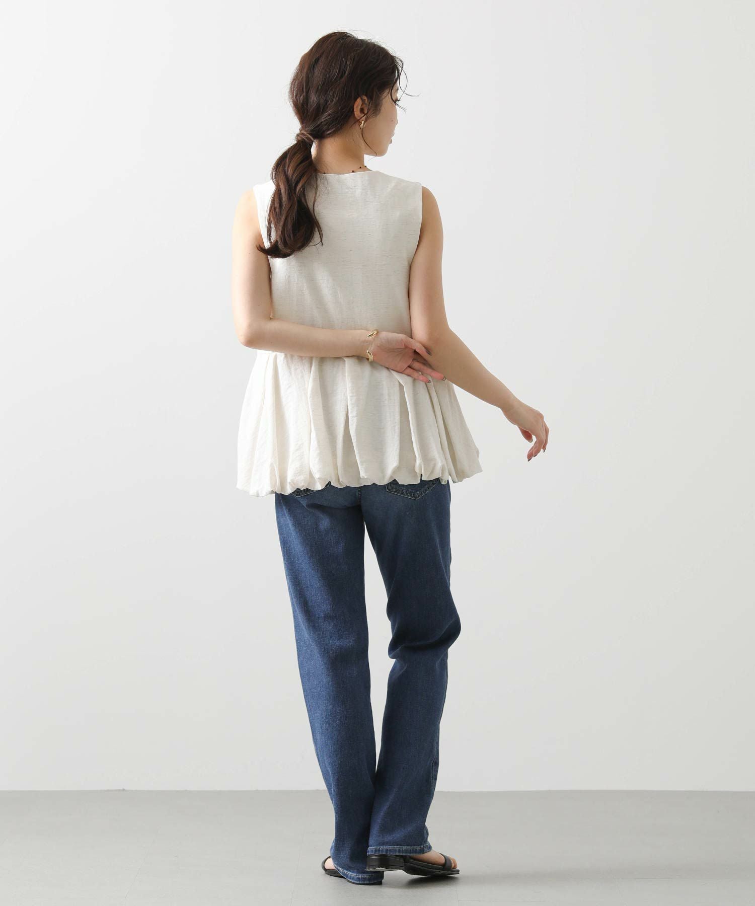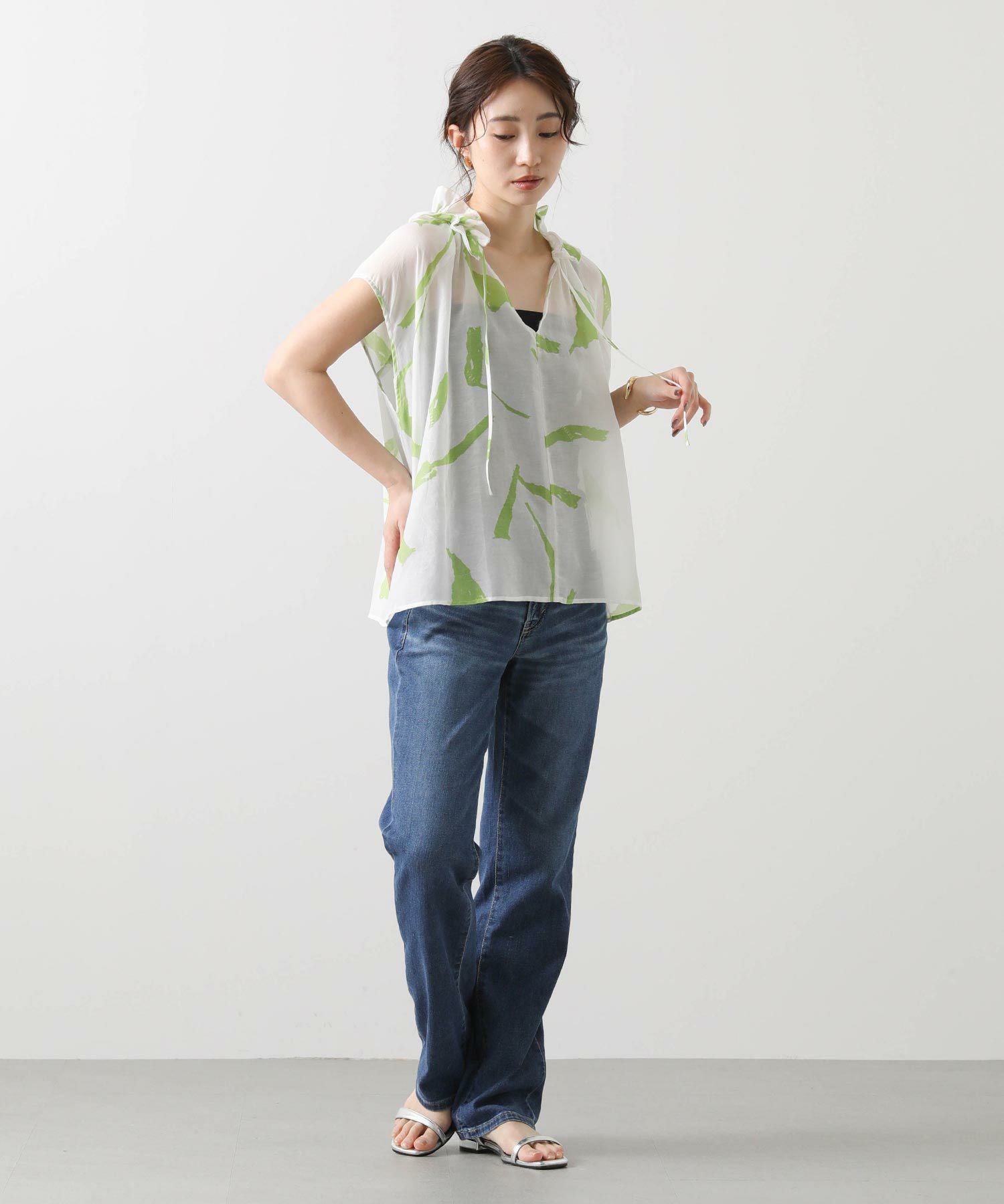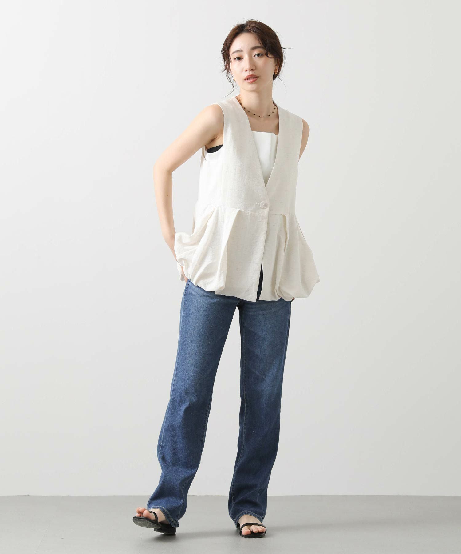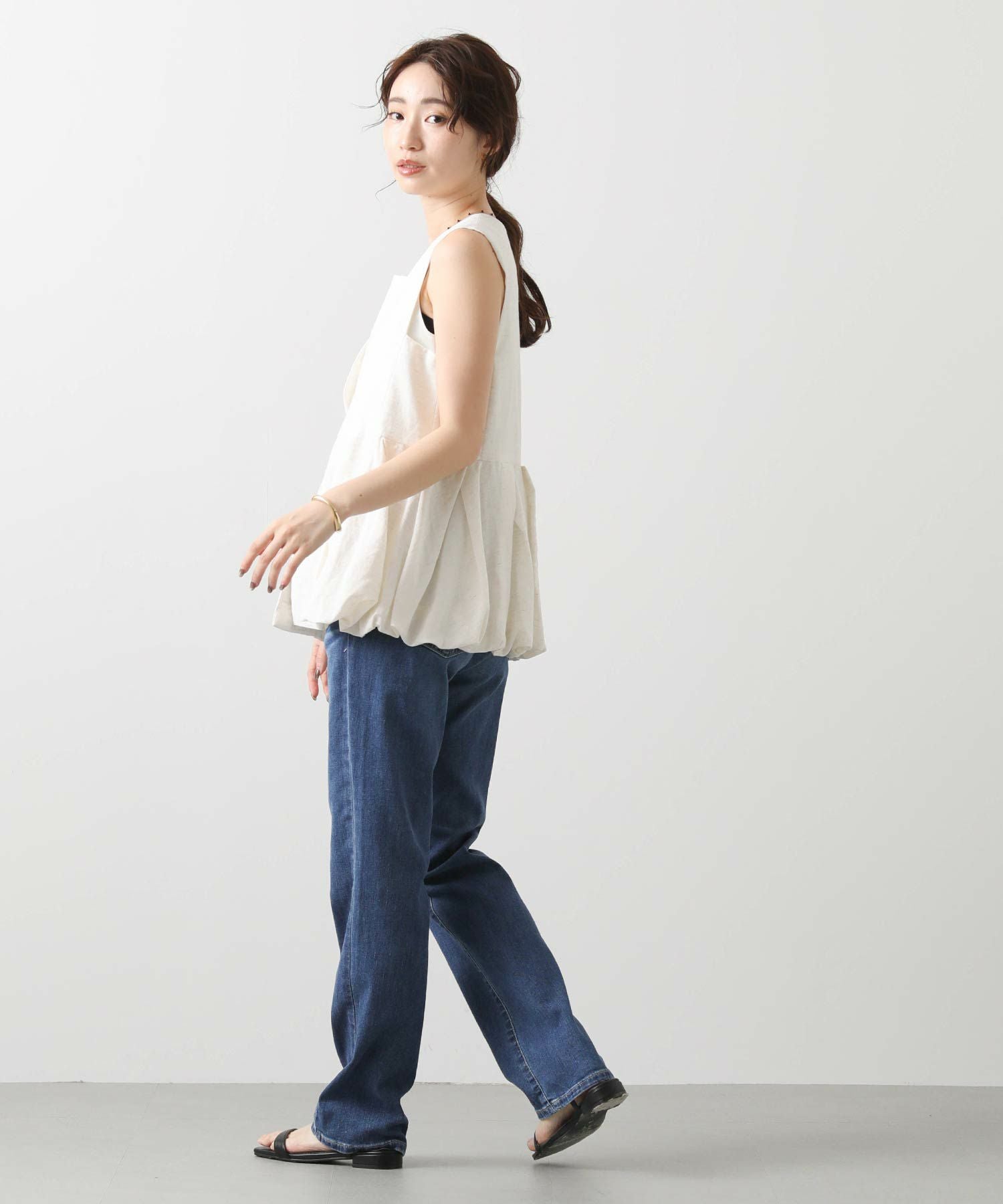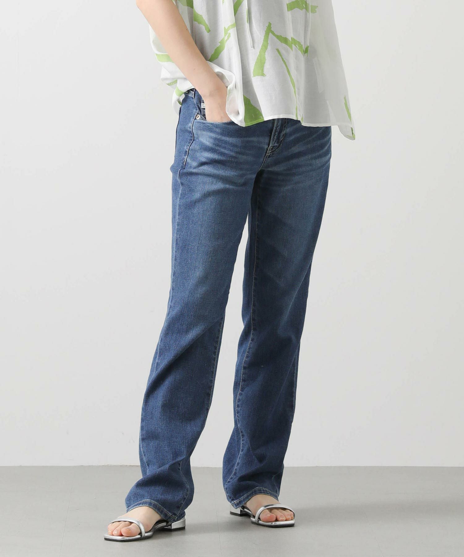 どんな着こなしにも合うストレートシルエットは、着回しやすい万能アイテム。フルレングスなので、トップスは少し肌見せをした抜け感のあるスタイルが夏らしくておすすめ。