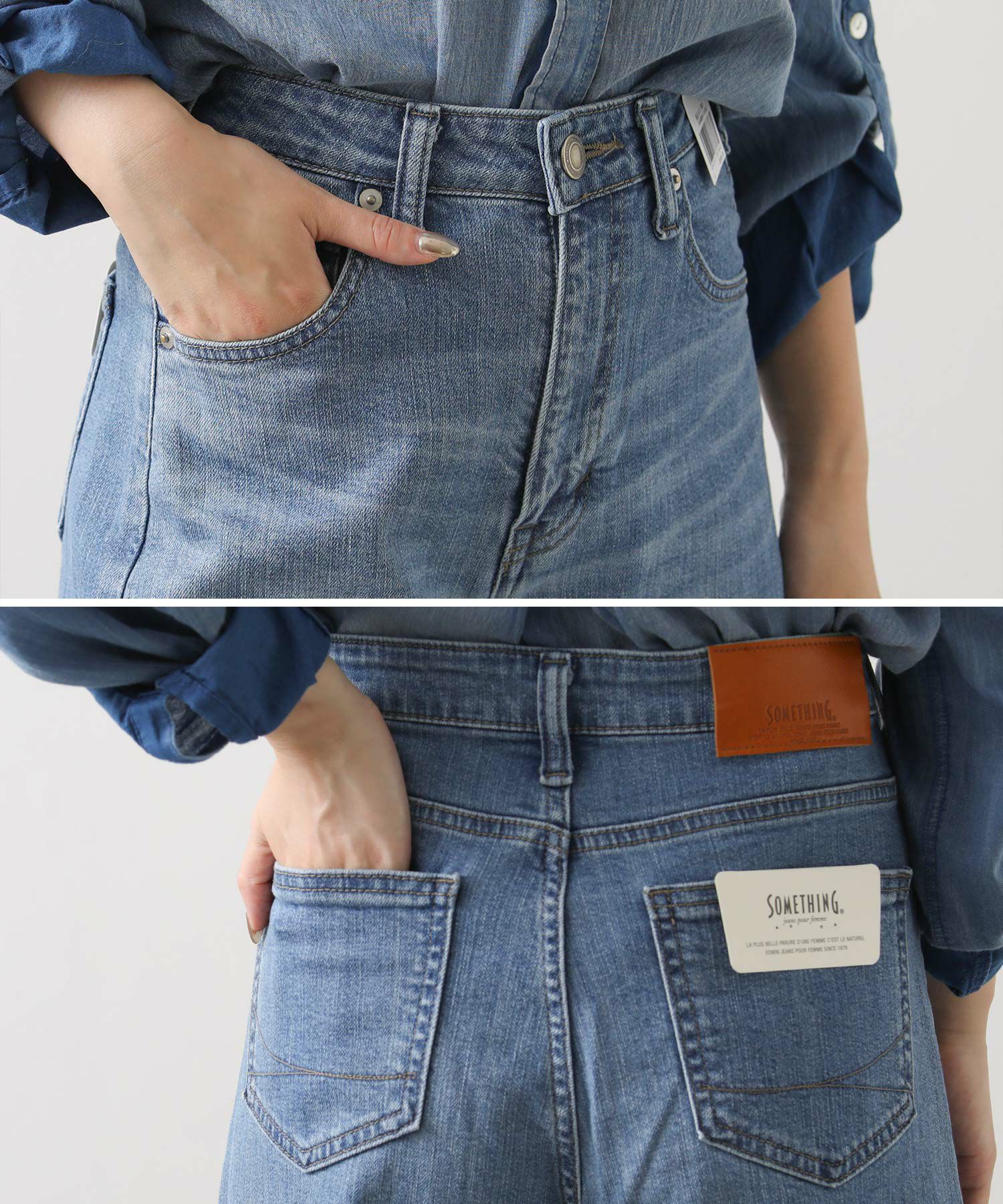 異番手、ムラ形状の違う2種のタテ糸を使用し、加工映えするよう設計した、SOMETHINGオリジナルストレッチデニムです。