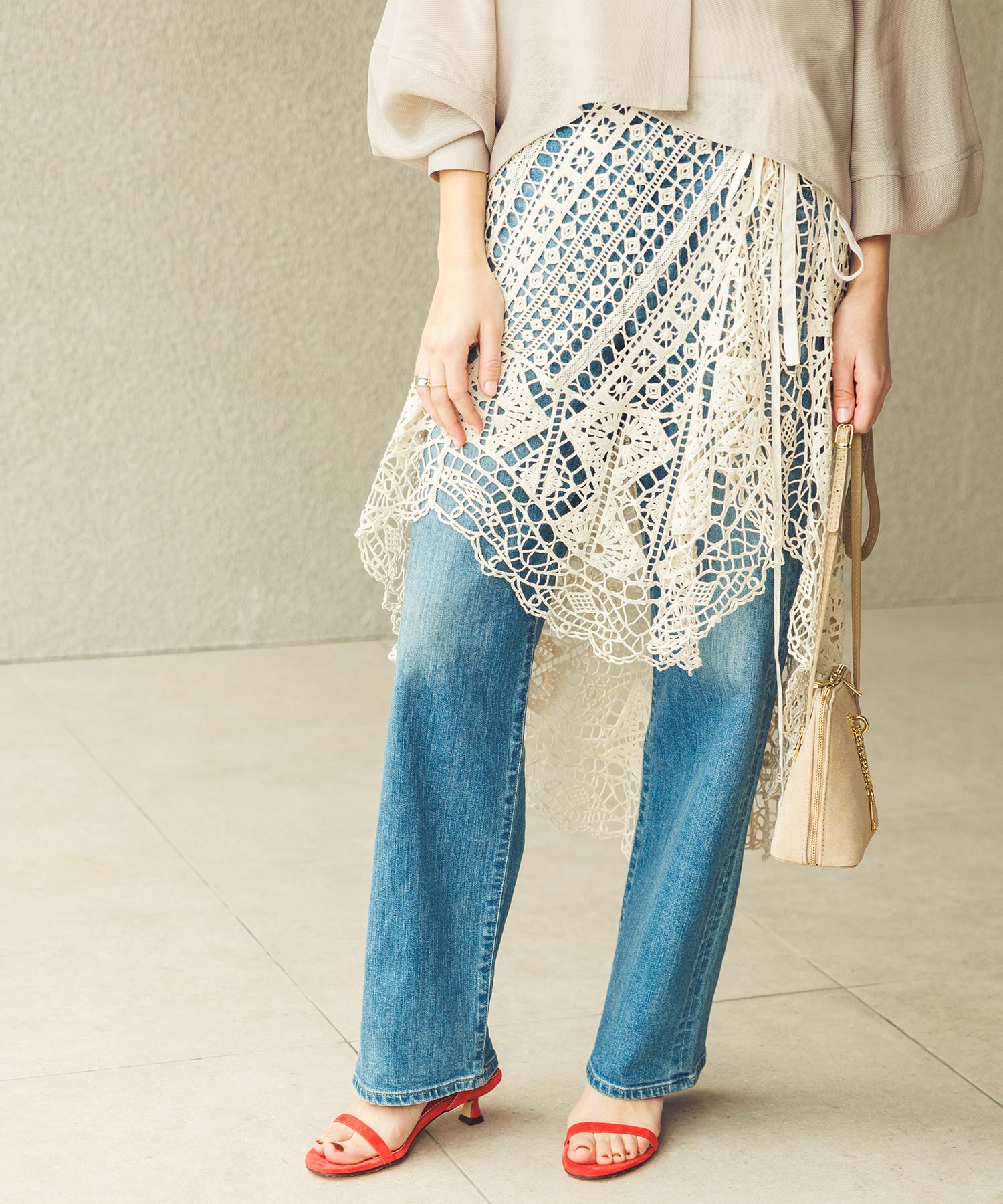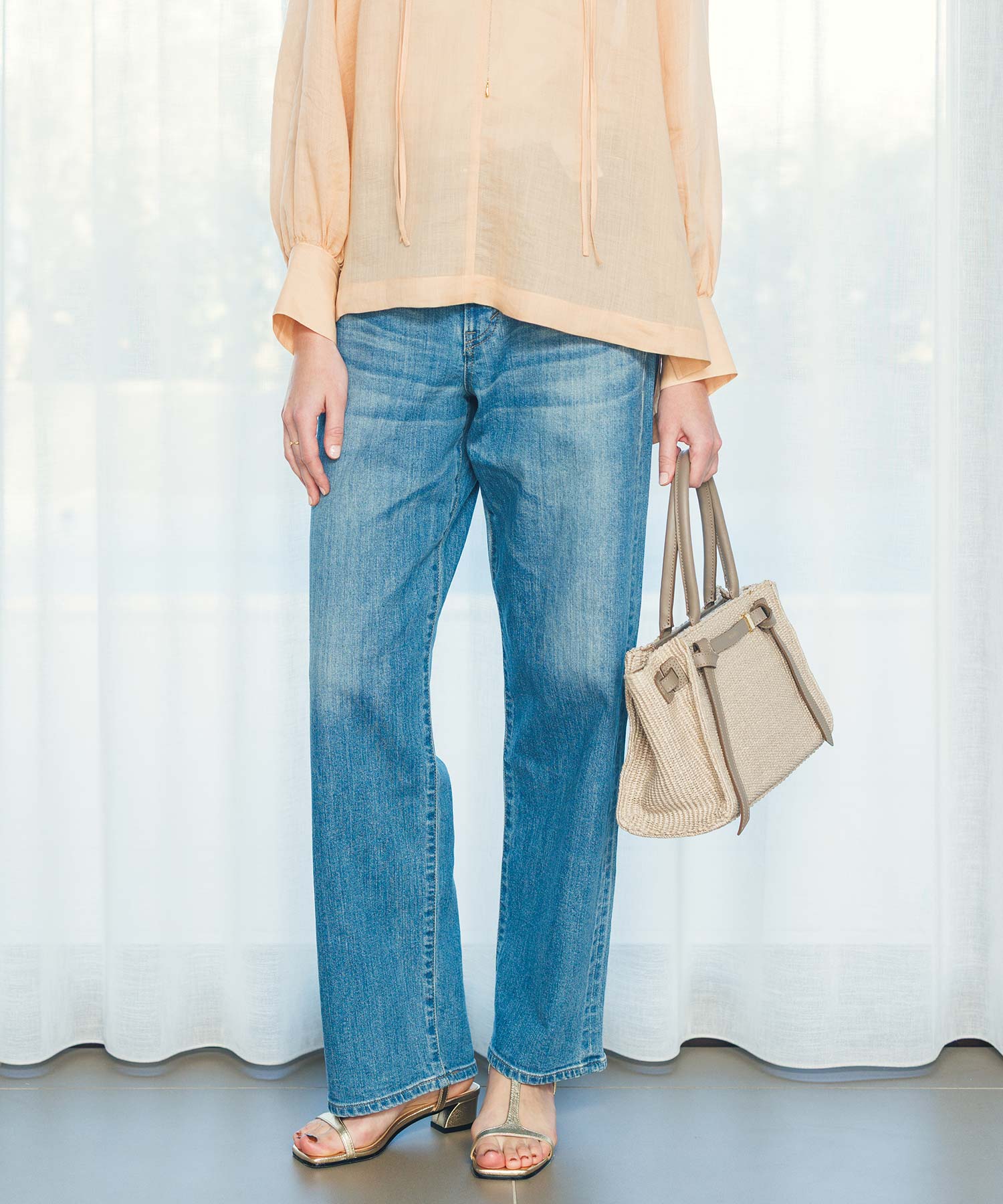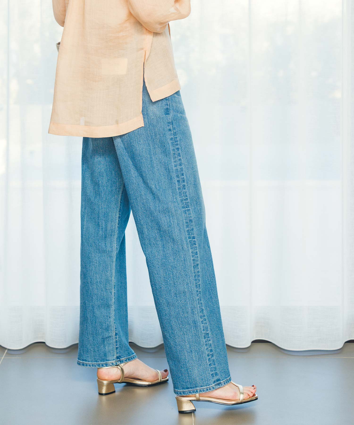 腰周りにゆとりがあり、リラックス感がありつつもシルエットが美しく、脚のラインを拾わないストンとしたシルエットが特徴。