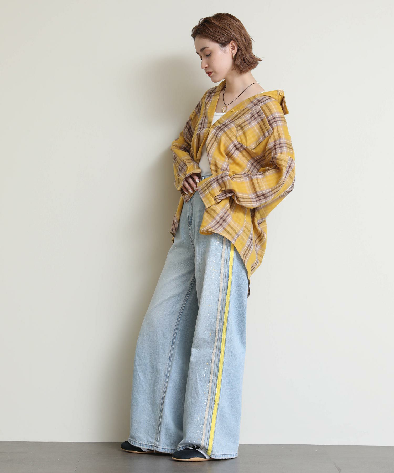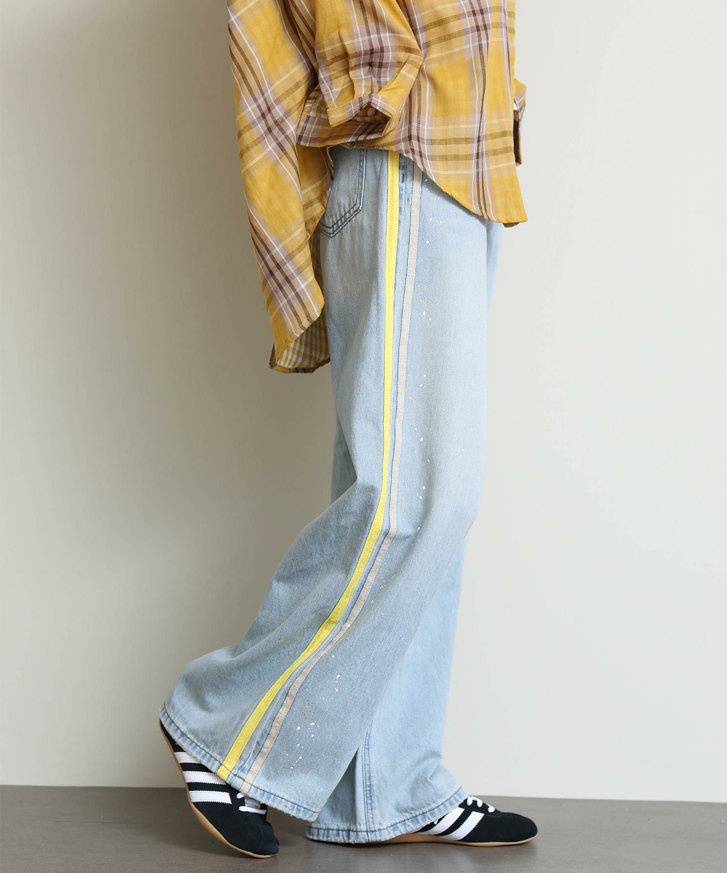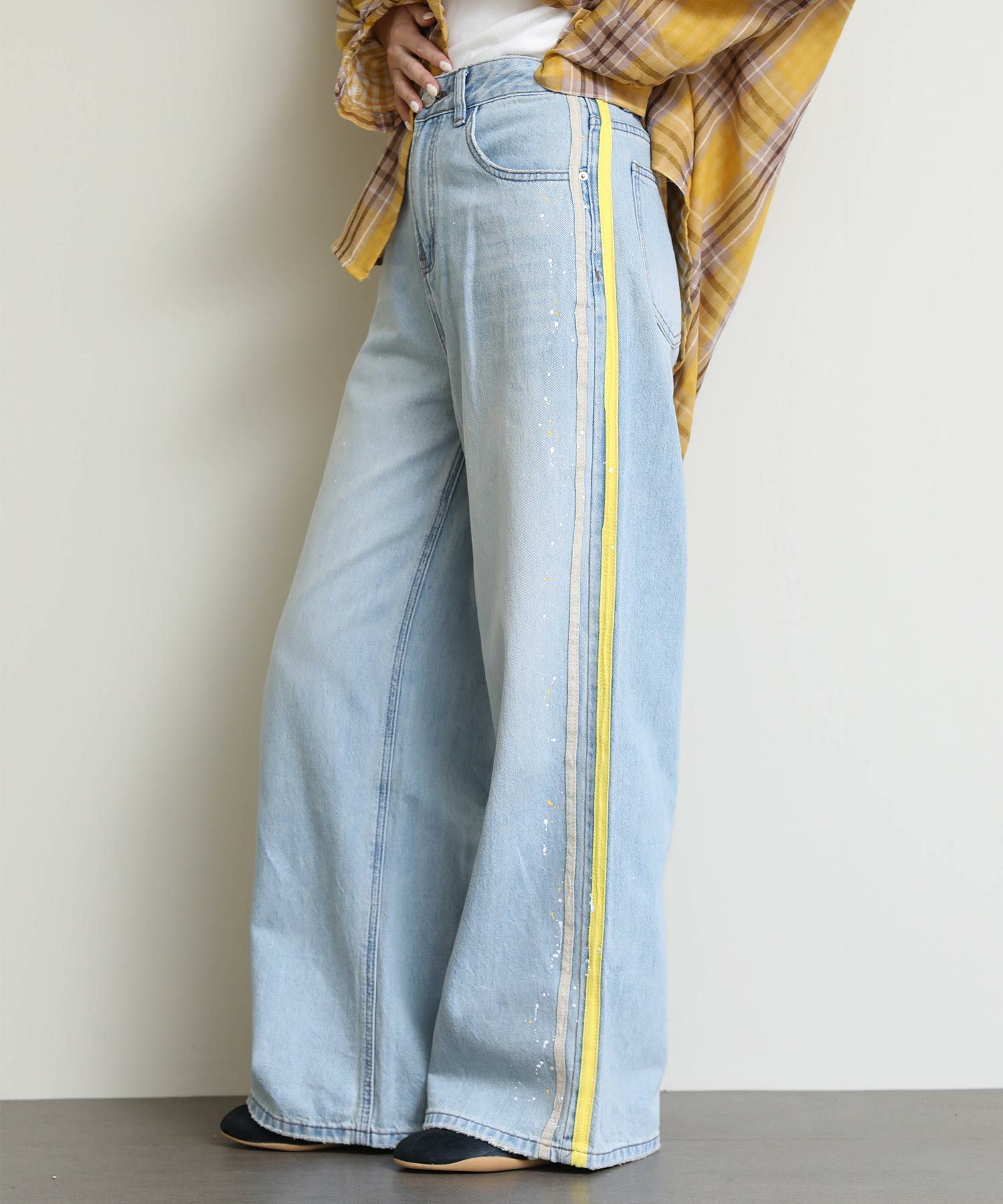 ルーズなシルエットとサイドに入ったイエローのラインがポイントのデニム。