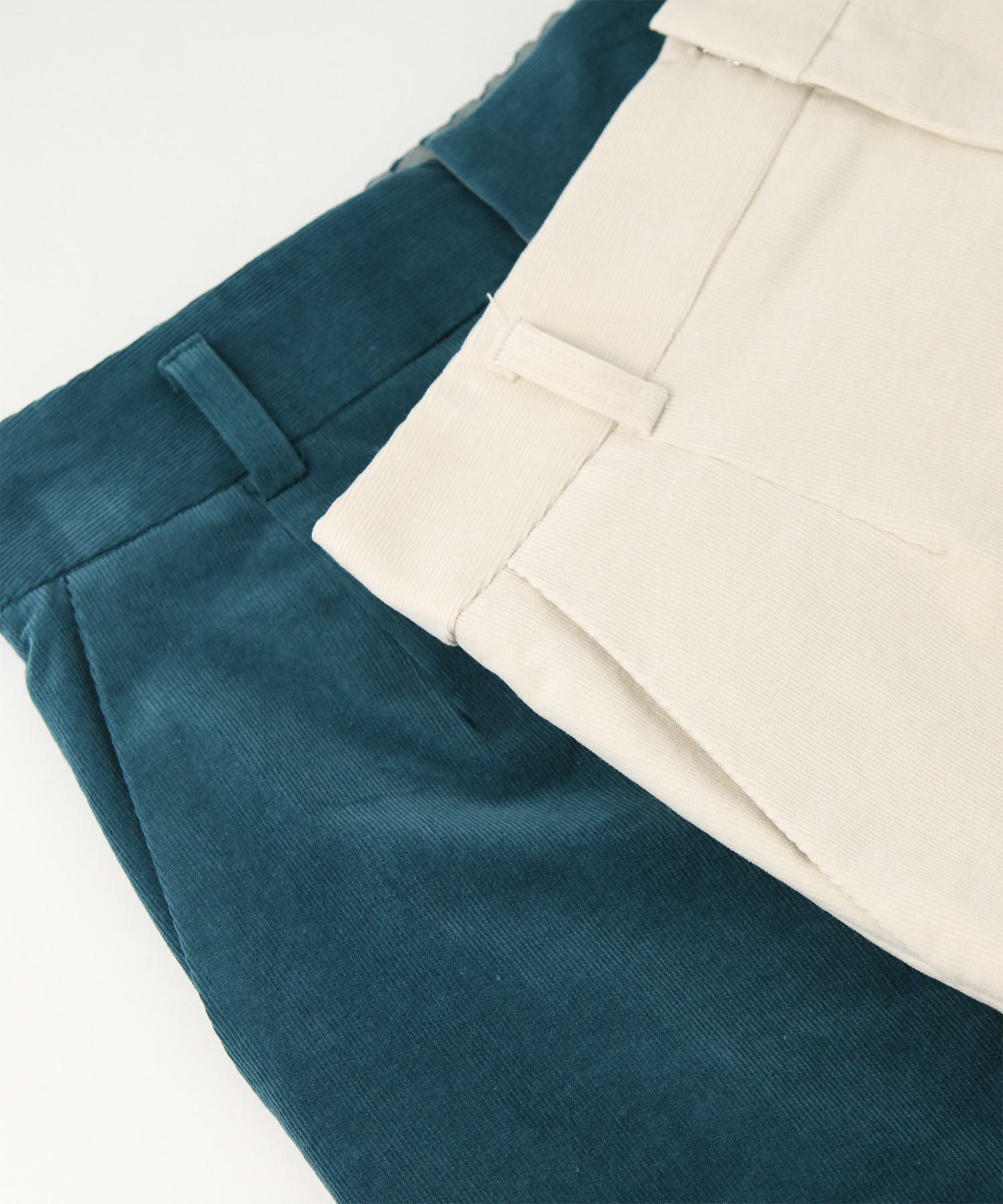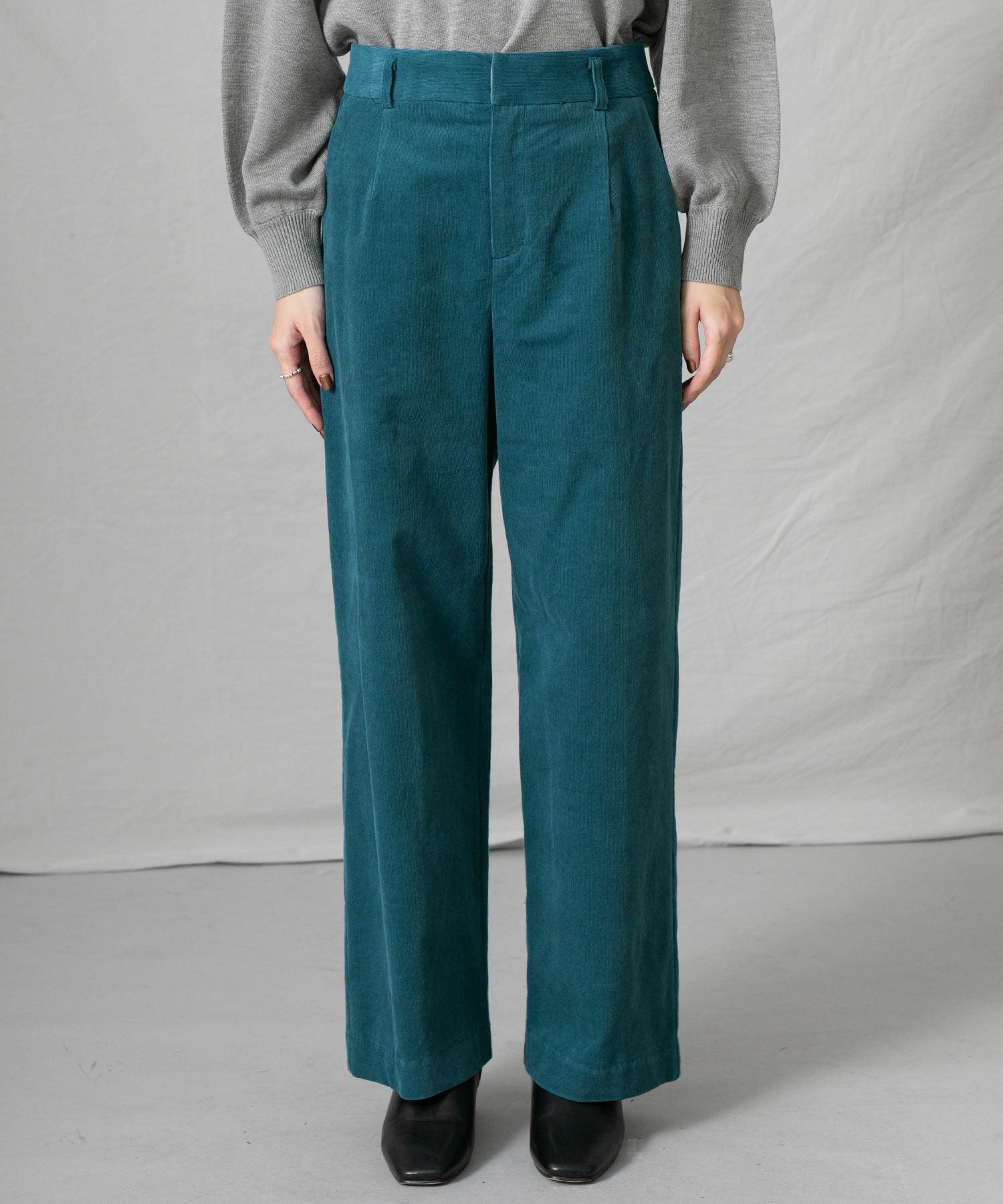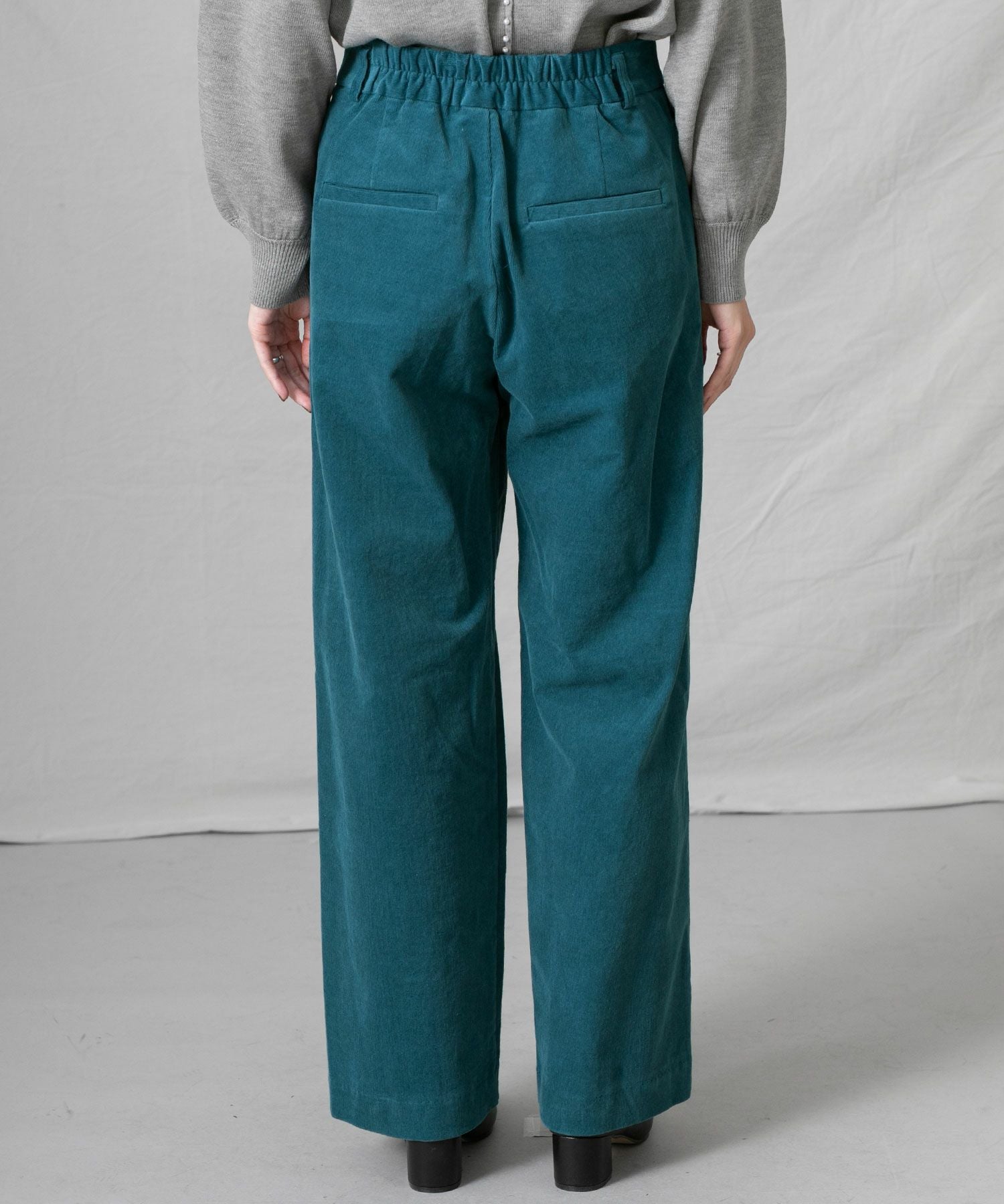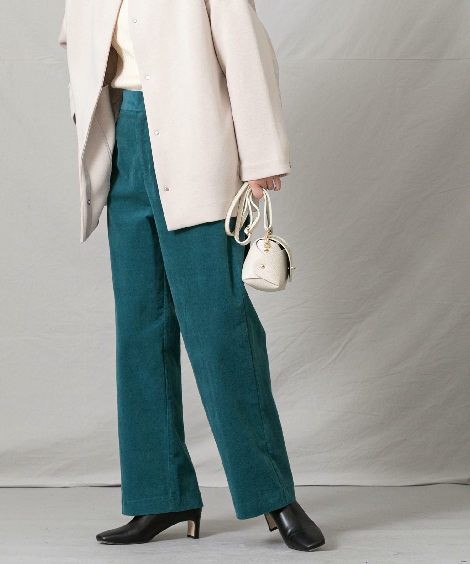 深みのあるグリーン系のブルーがトレンド感もあり秋冬の着こなしに新鮮さをプラスします。細コールの上品な光沢感も大人の着こなしにぴったり。