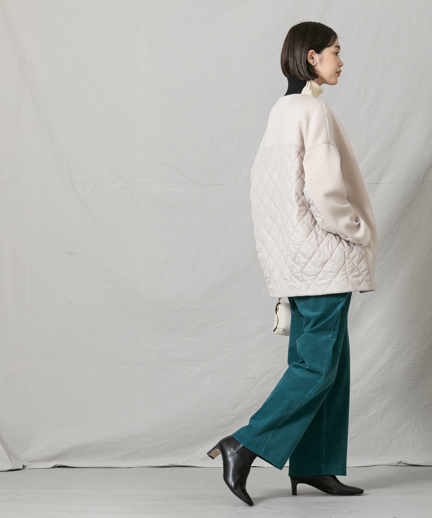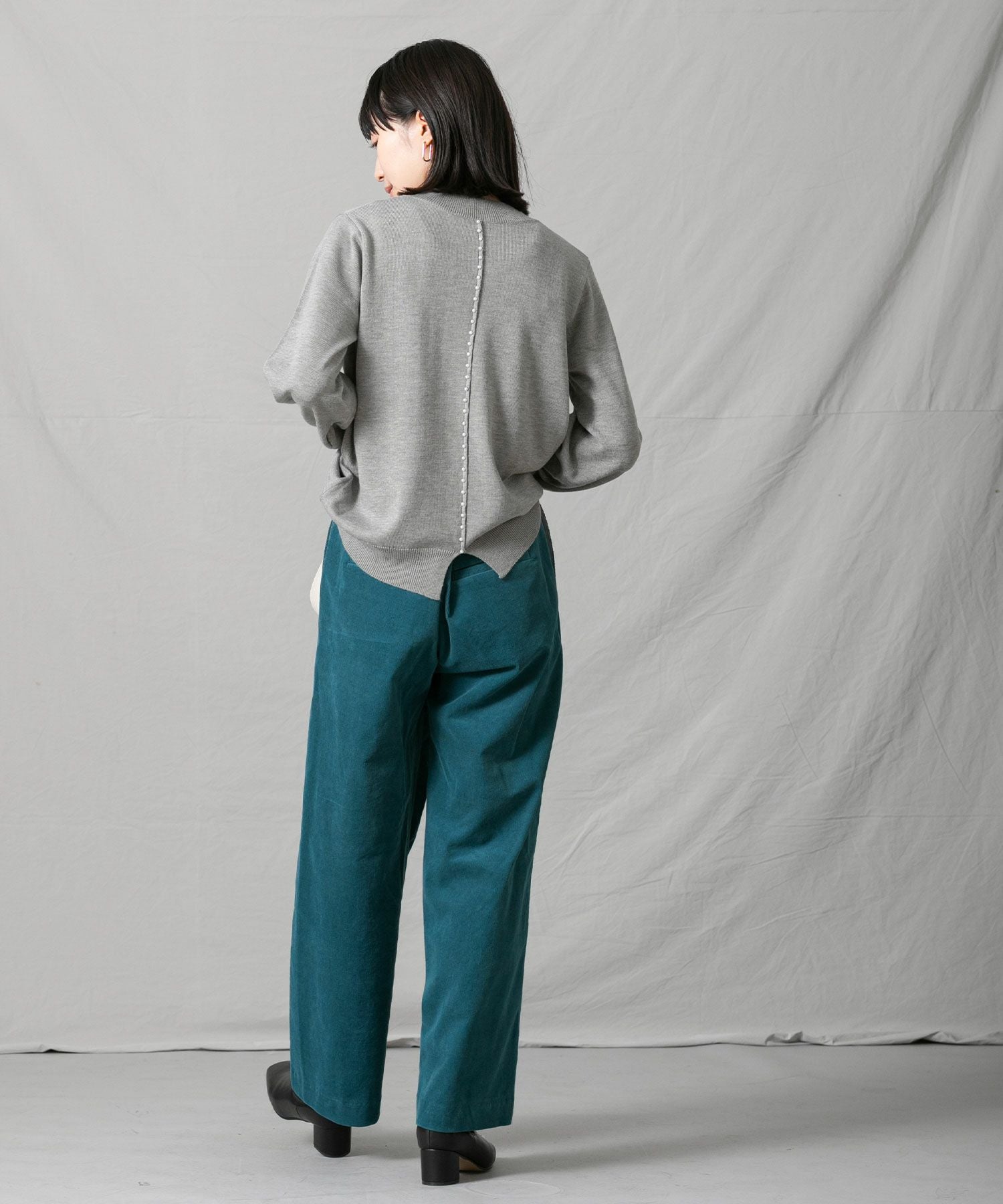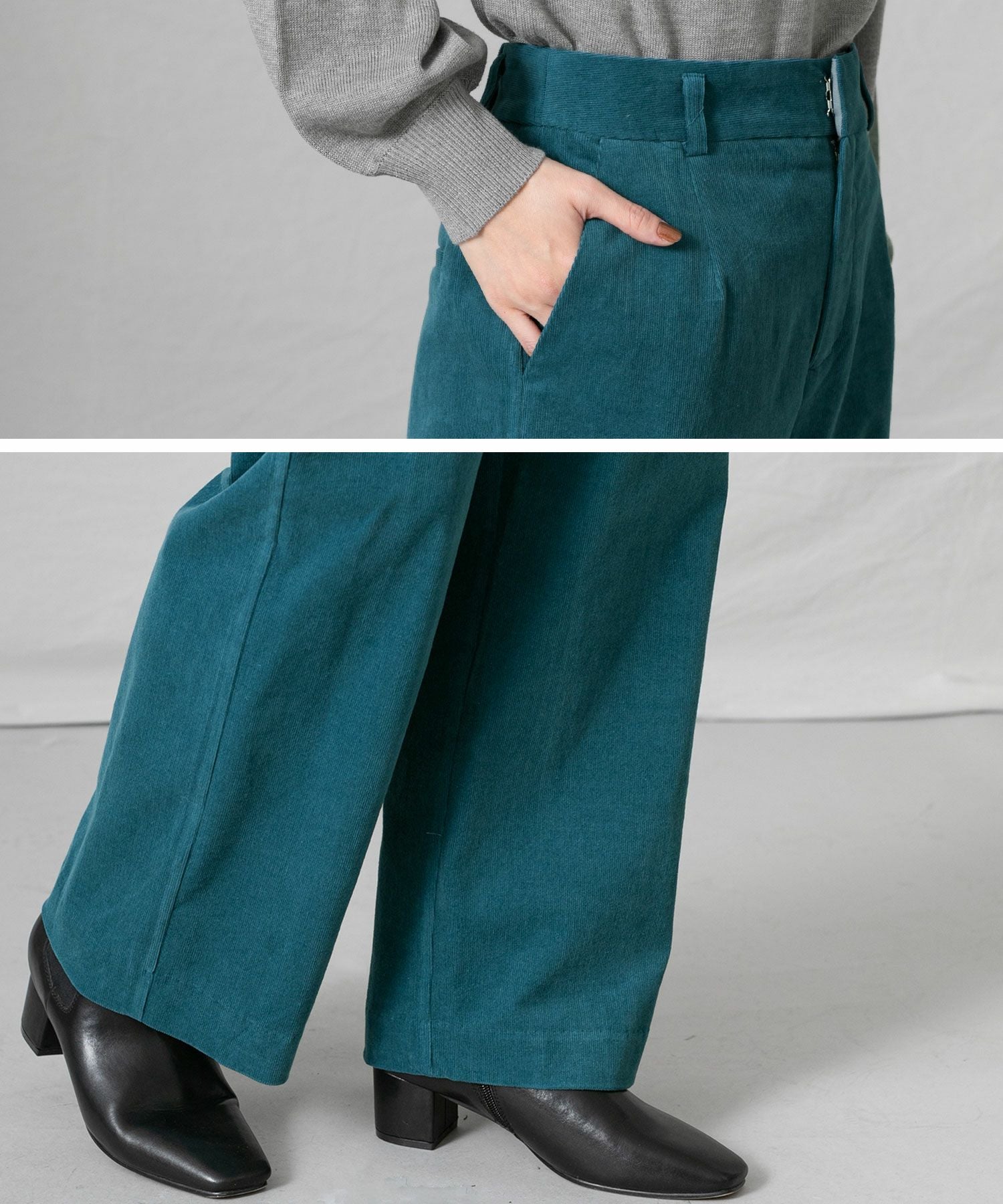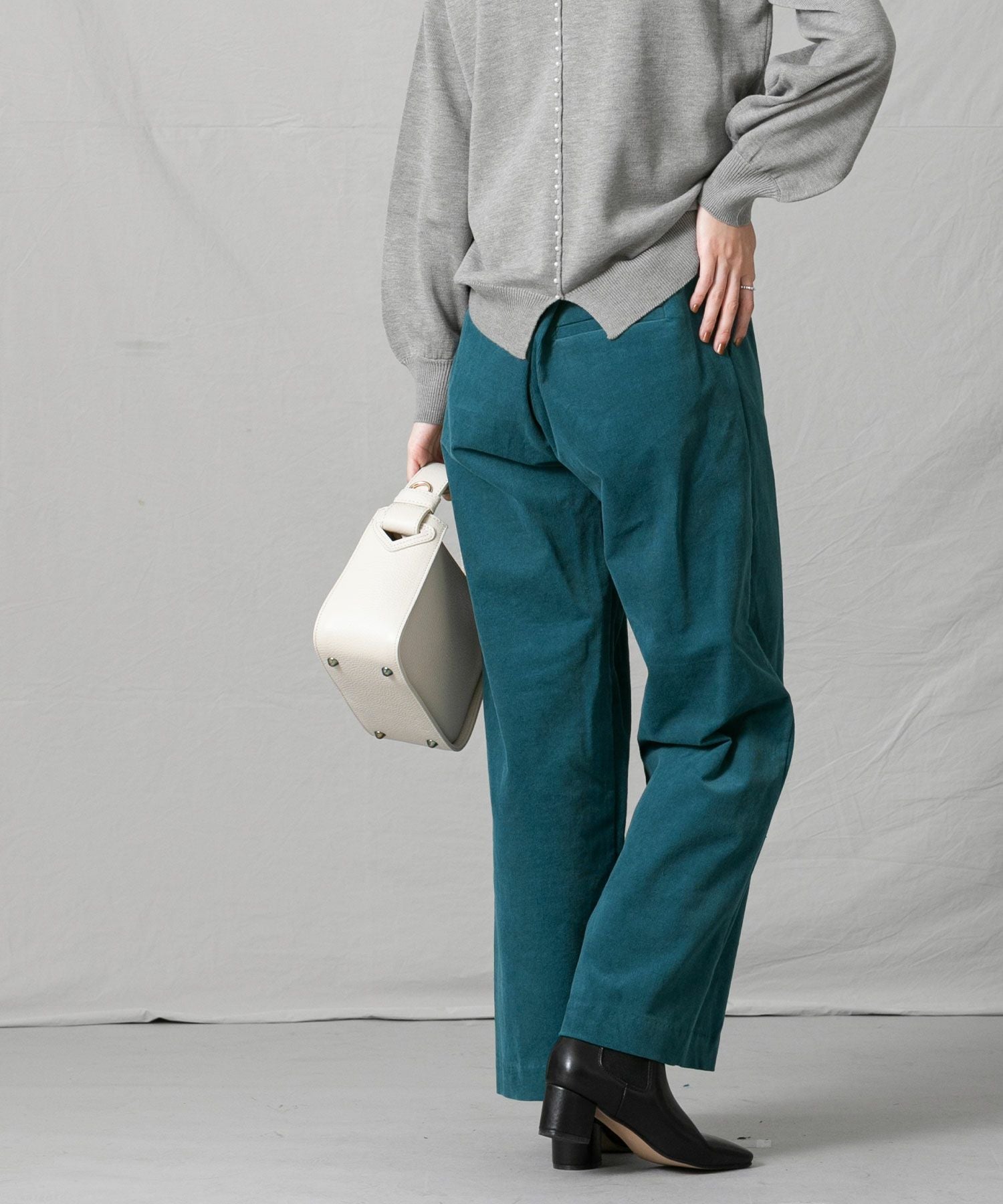 深みのあるグリーン系のブルーがトレンド感もあり秋冬の着こなしに新鮮さをプラスします。細コールの上品な光沢感も大人の着こなしにぴったり。