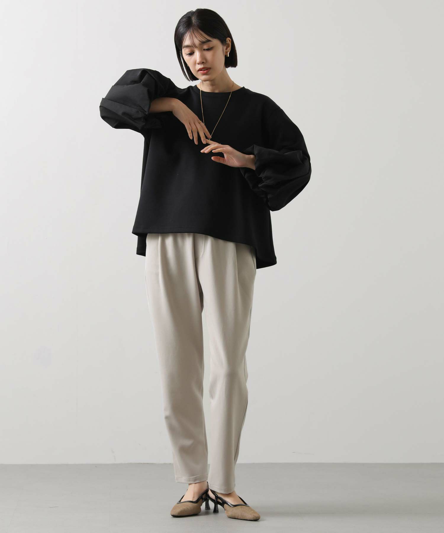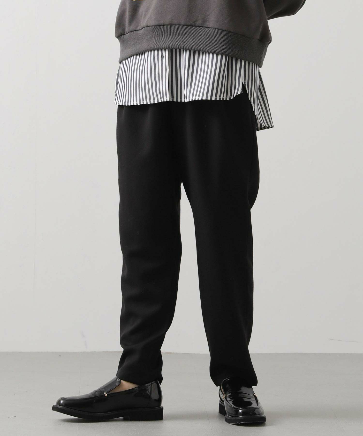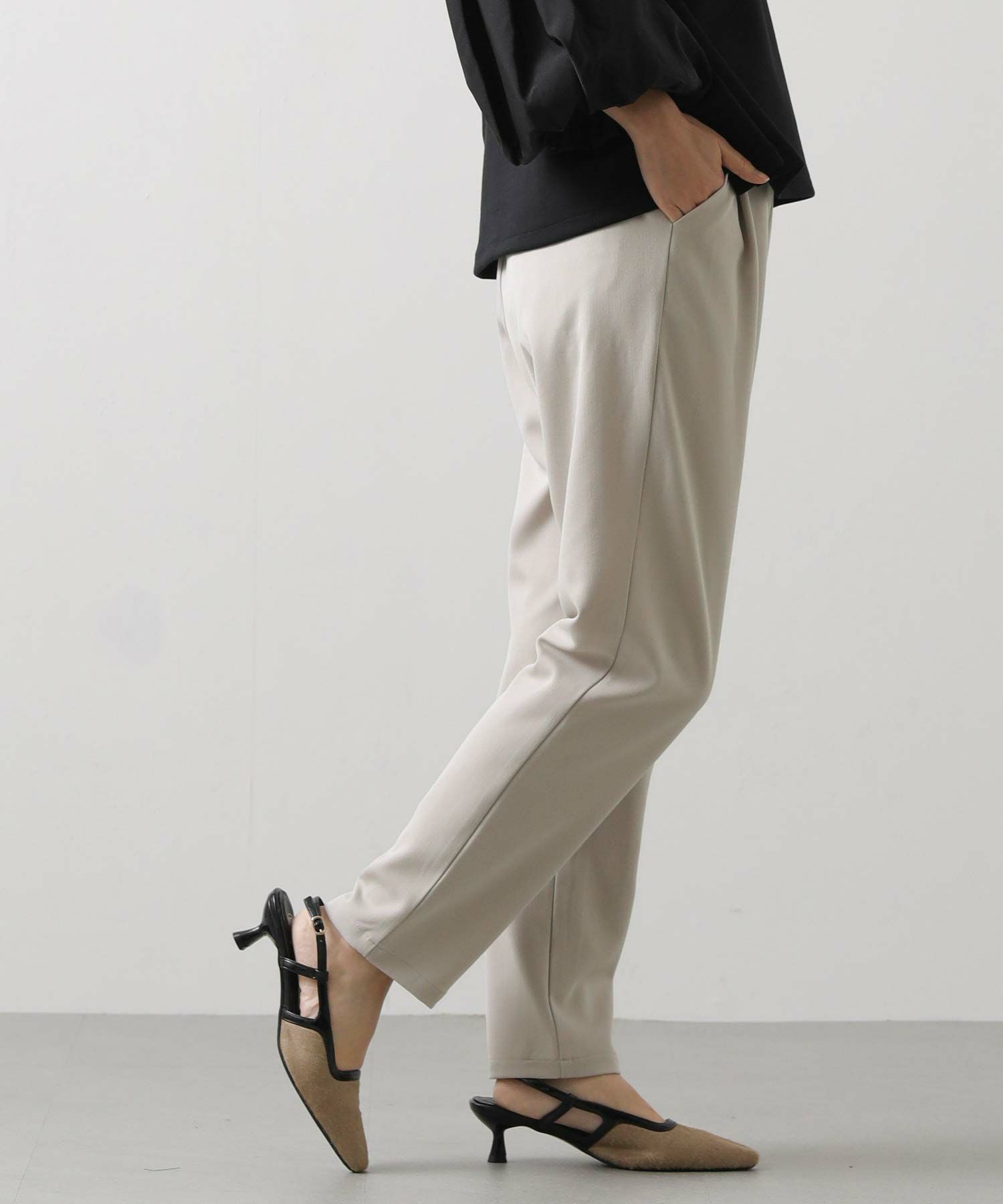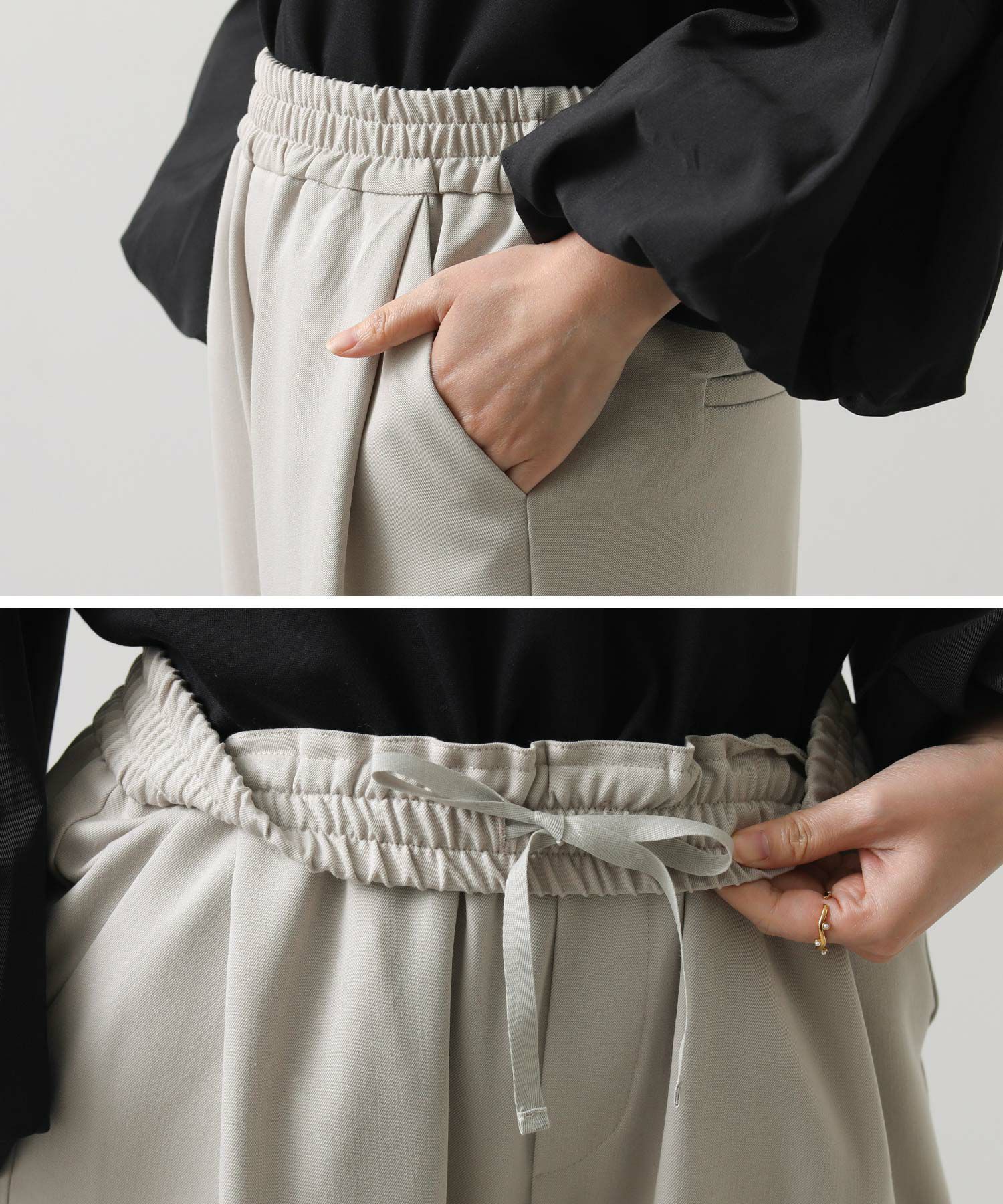 ウエストゴムの楽ちんな穿き心地に、きちんと見えするシルエットがオン・オフ使える万能パンツです。