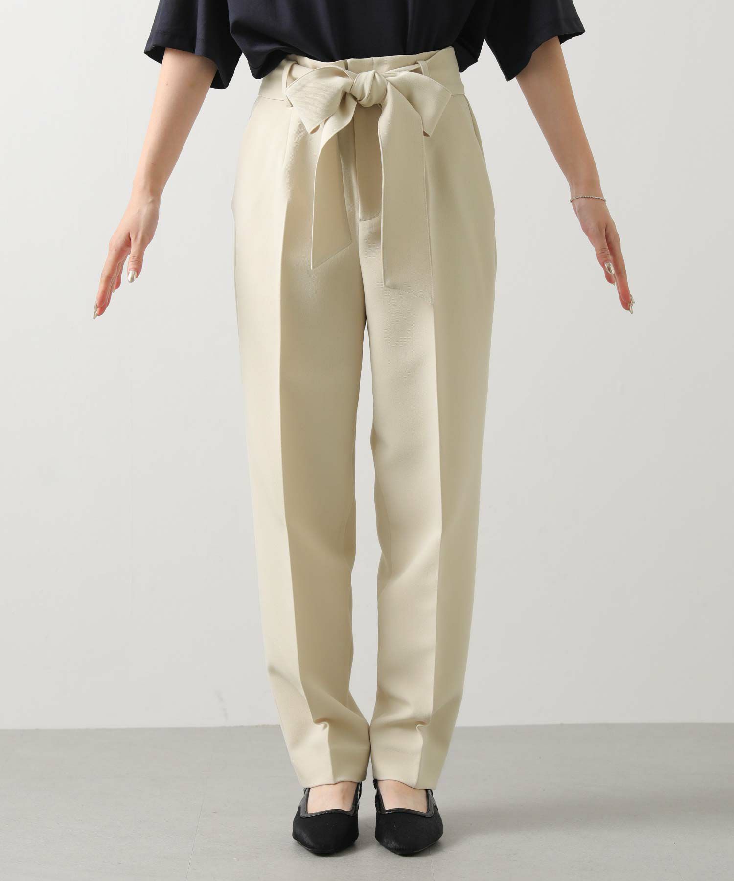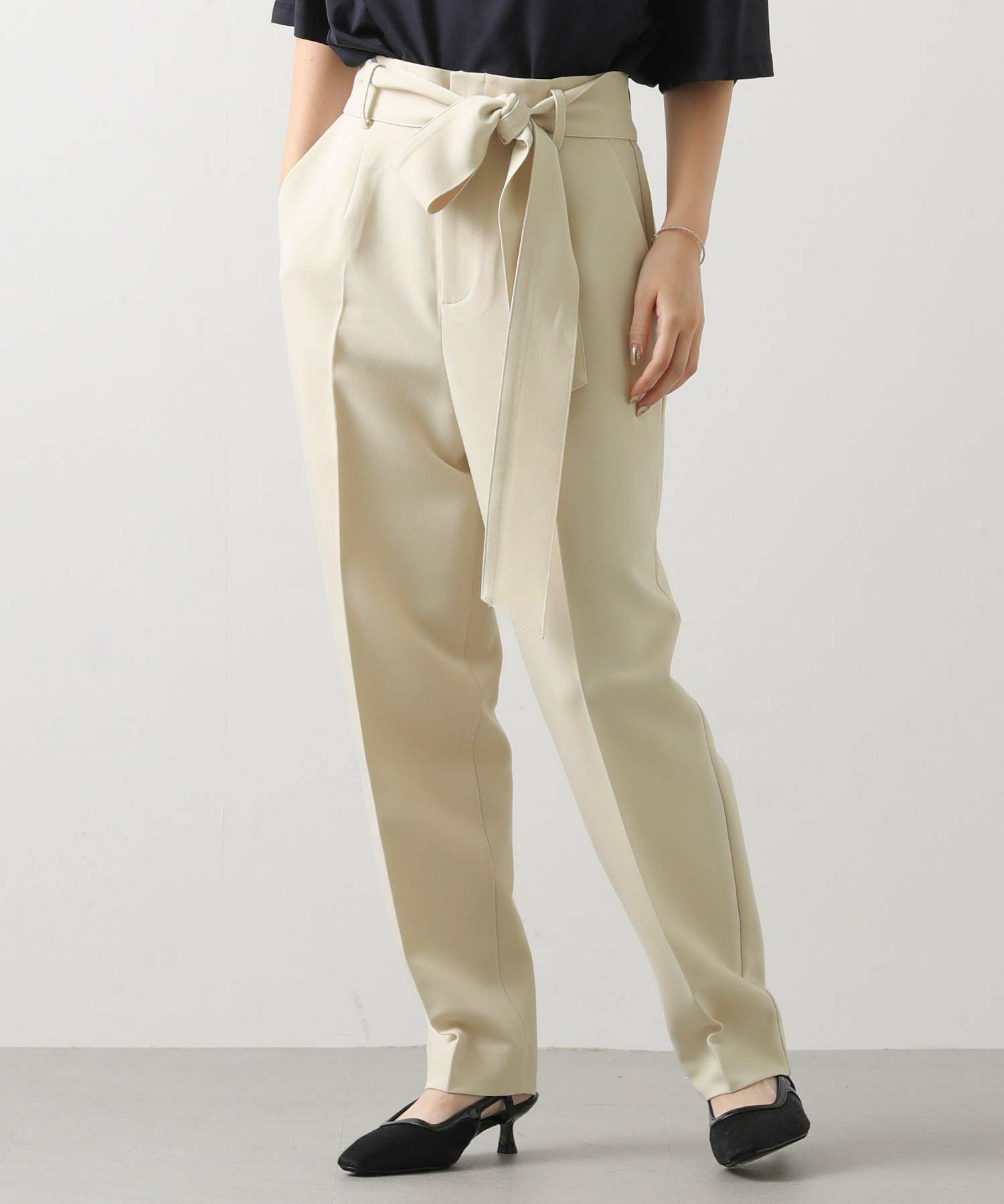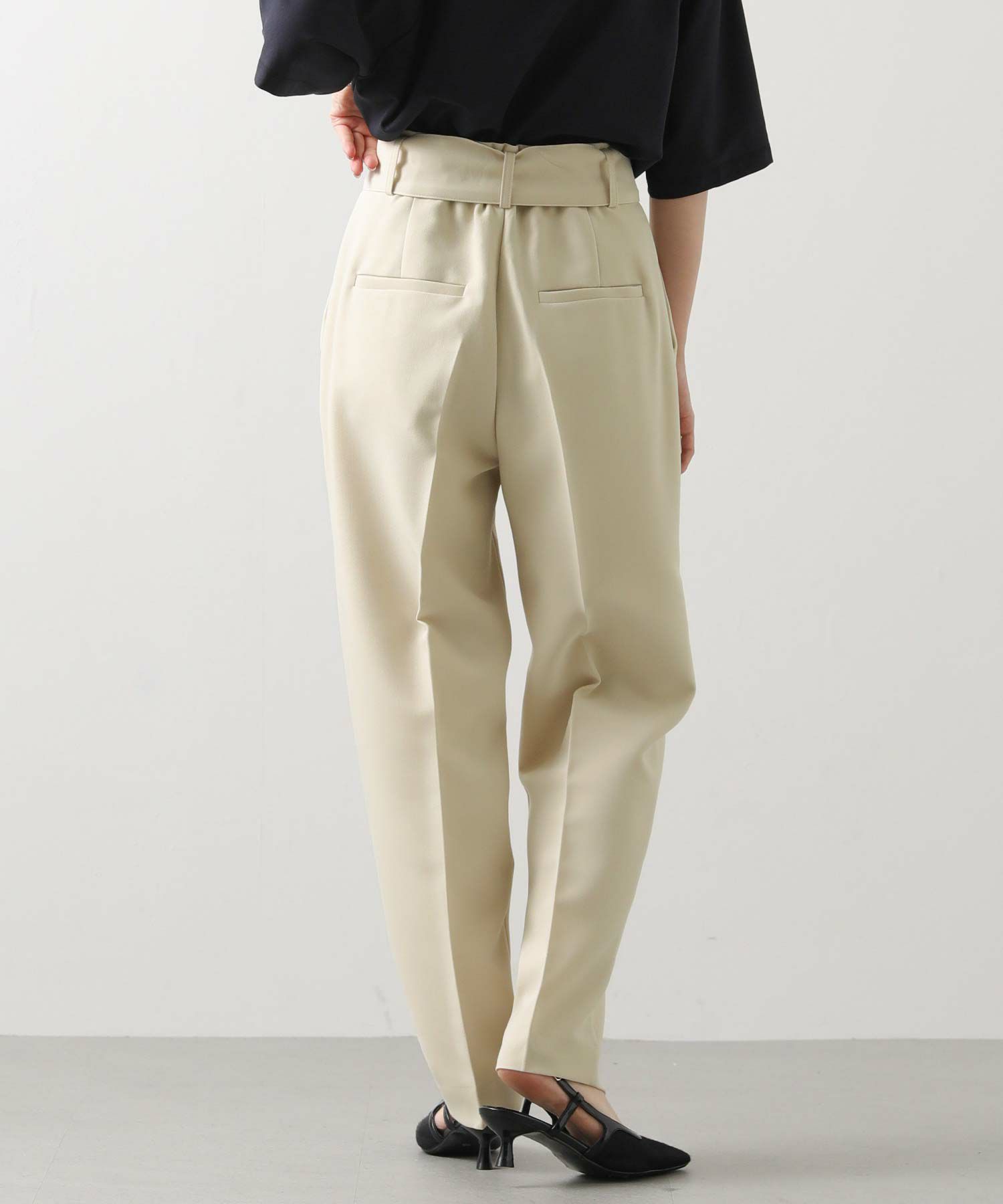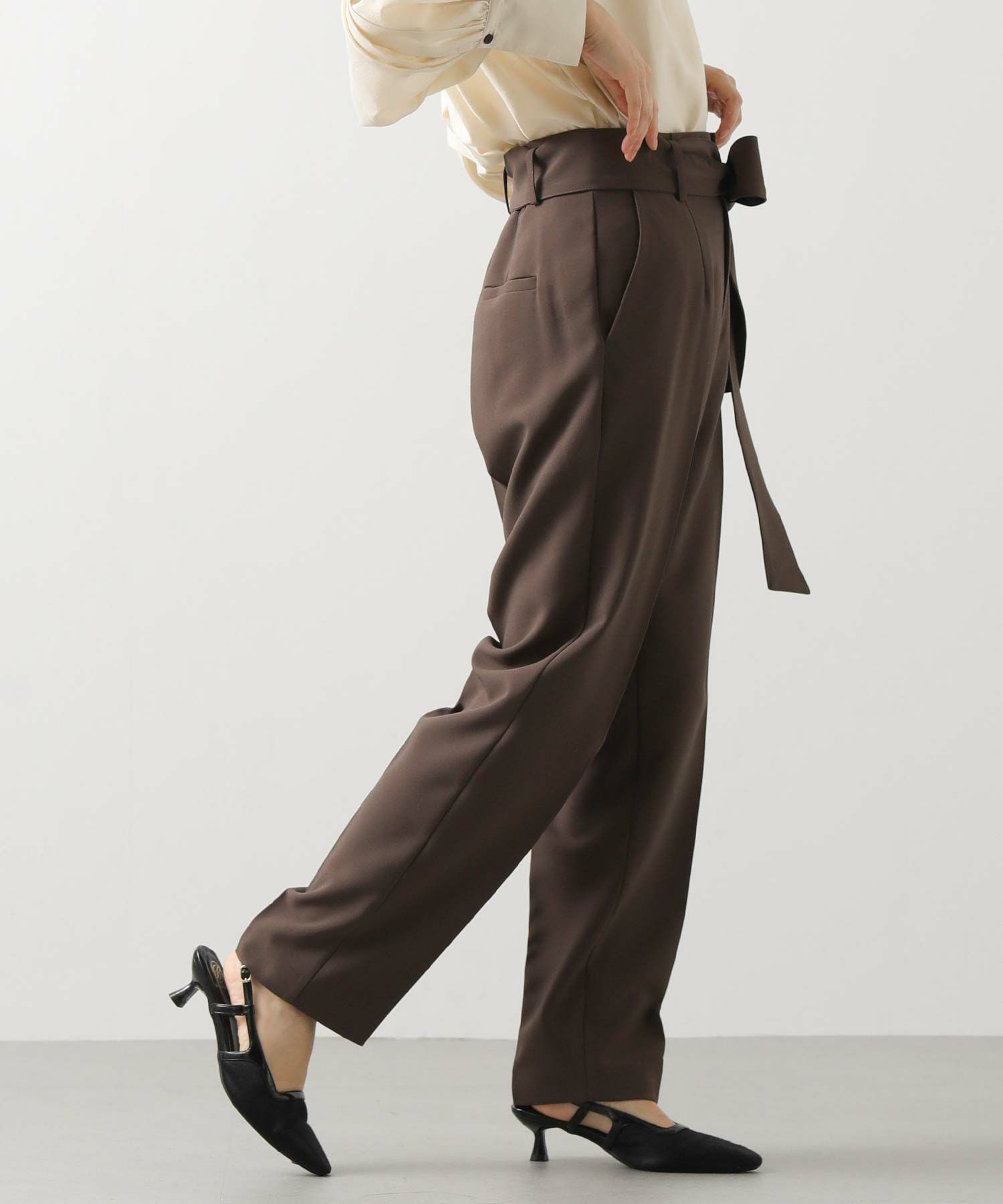 すっきりとしたタックレスのハイウエストデザインで、スタイルアップ効果も期待できるシルエット。