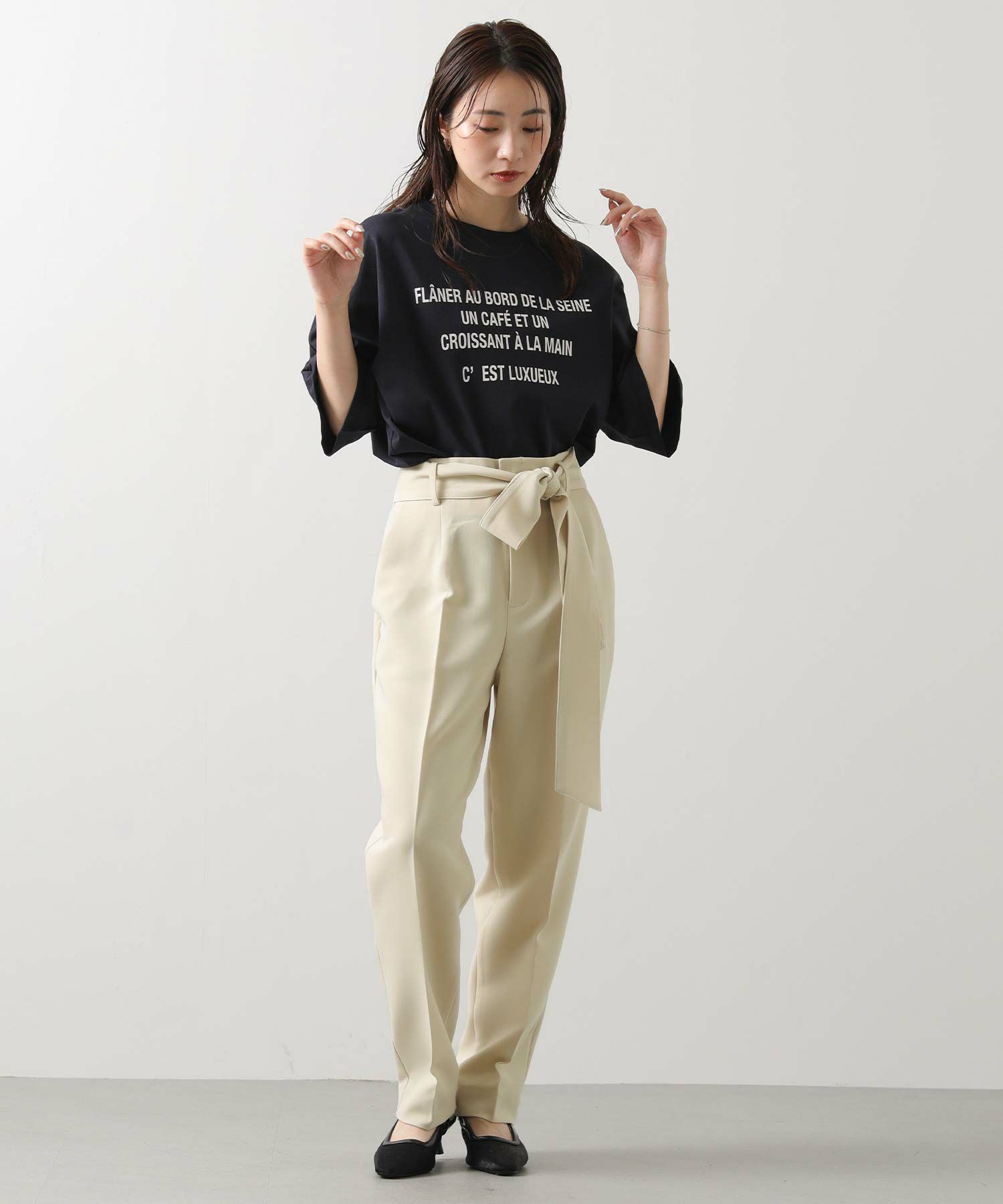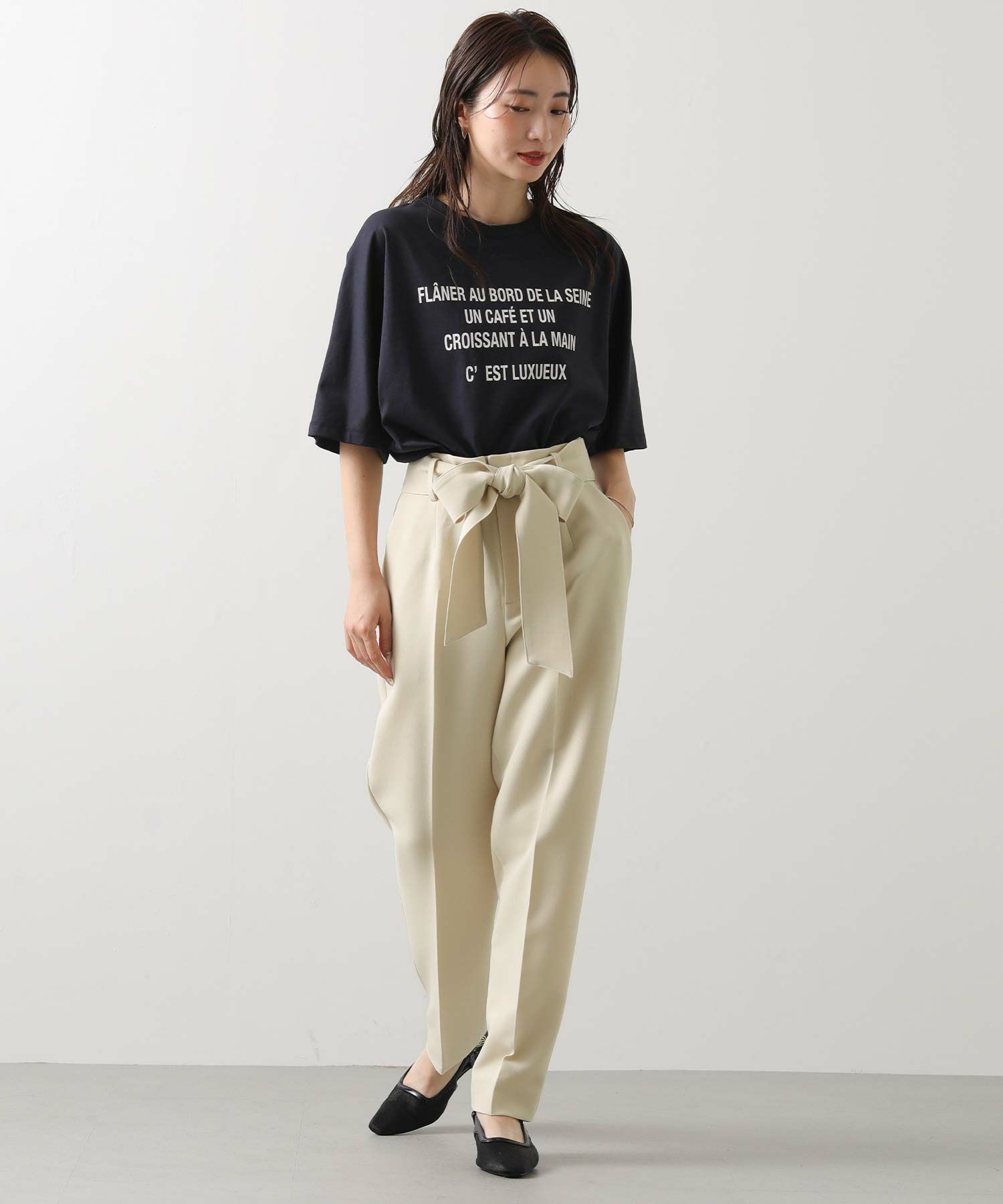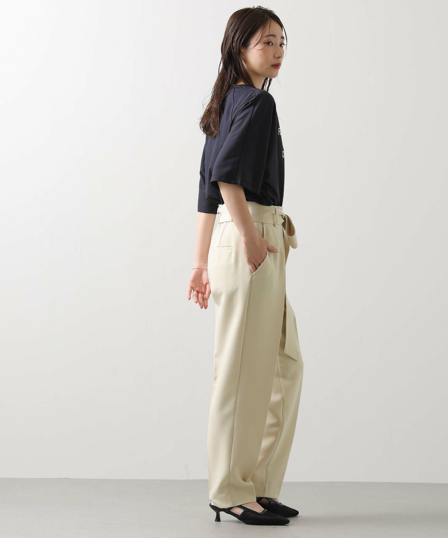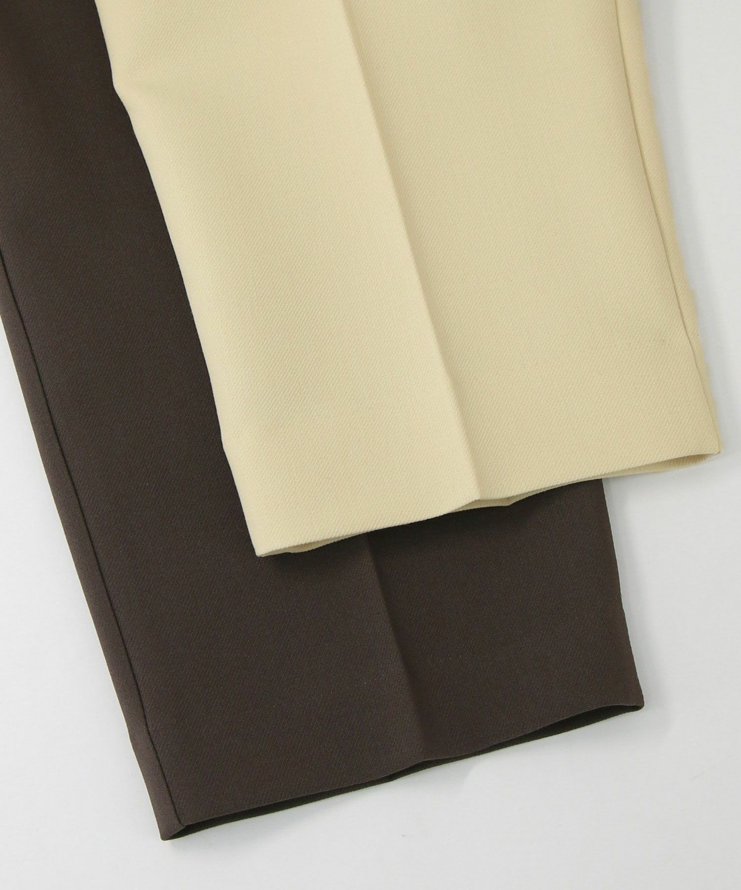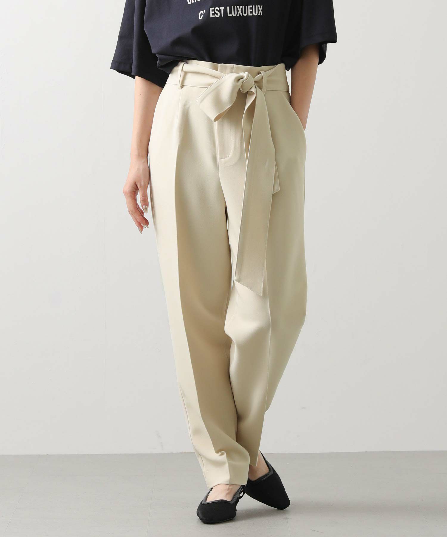 すっきりとしたタックレスのハイウエストデザインで、スタイルアップ効果も期待できるシルエット。