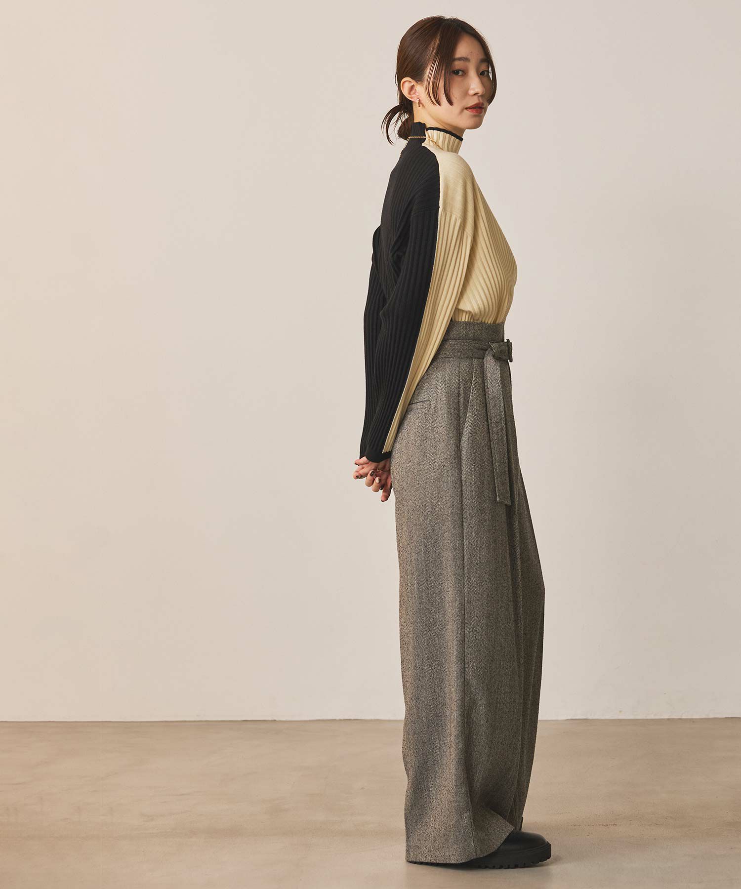 ハイウエストで脚長効果があり、フロントのタックとセンタープレスが美しいシルエットを強調、スッキリとしたラインを演出。