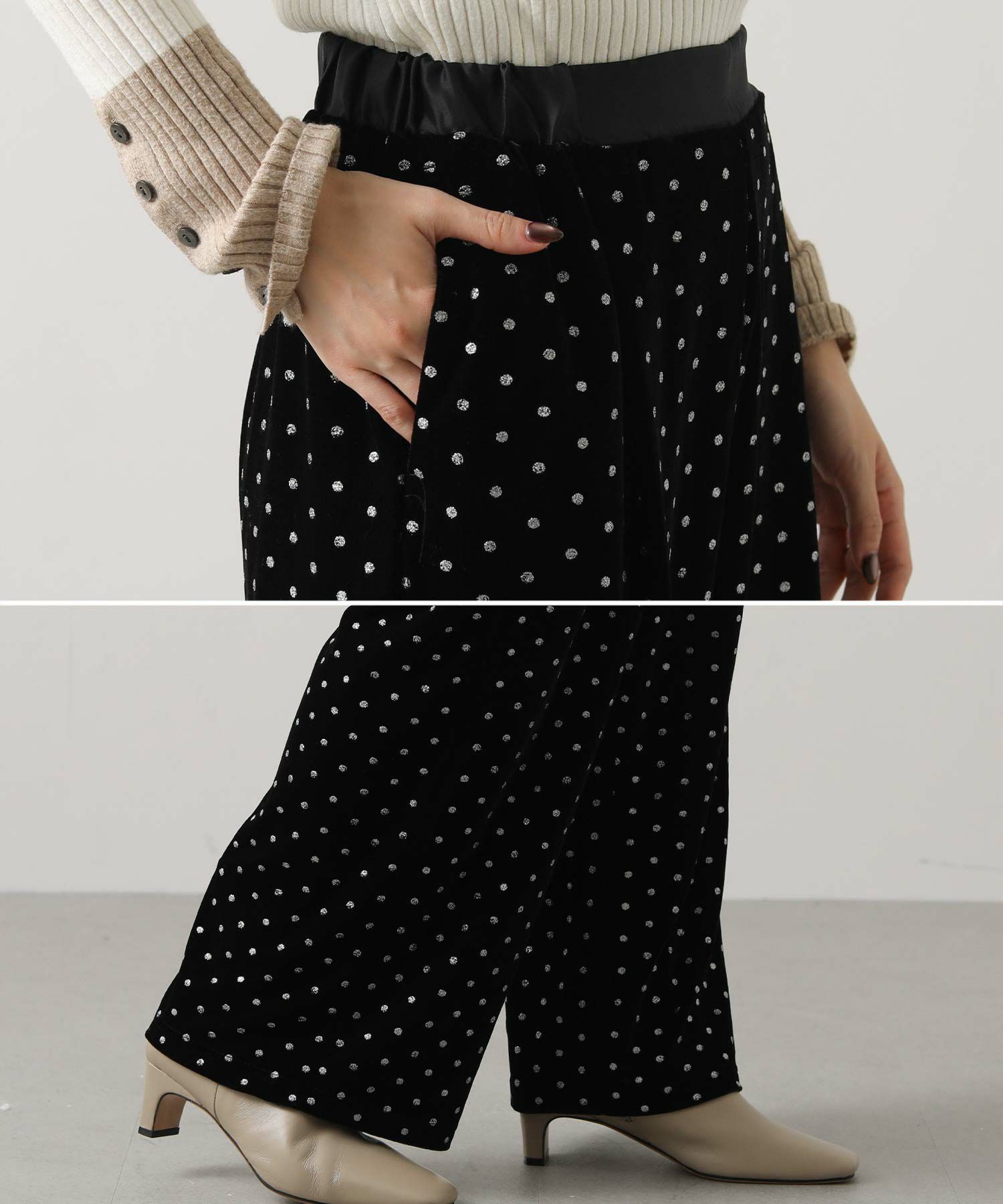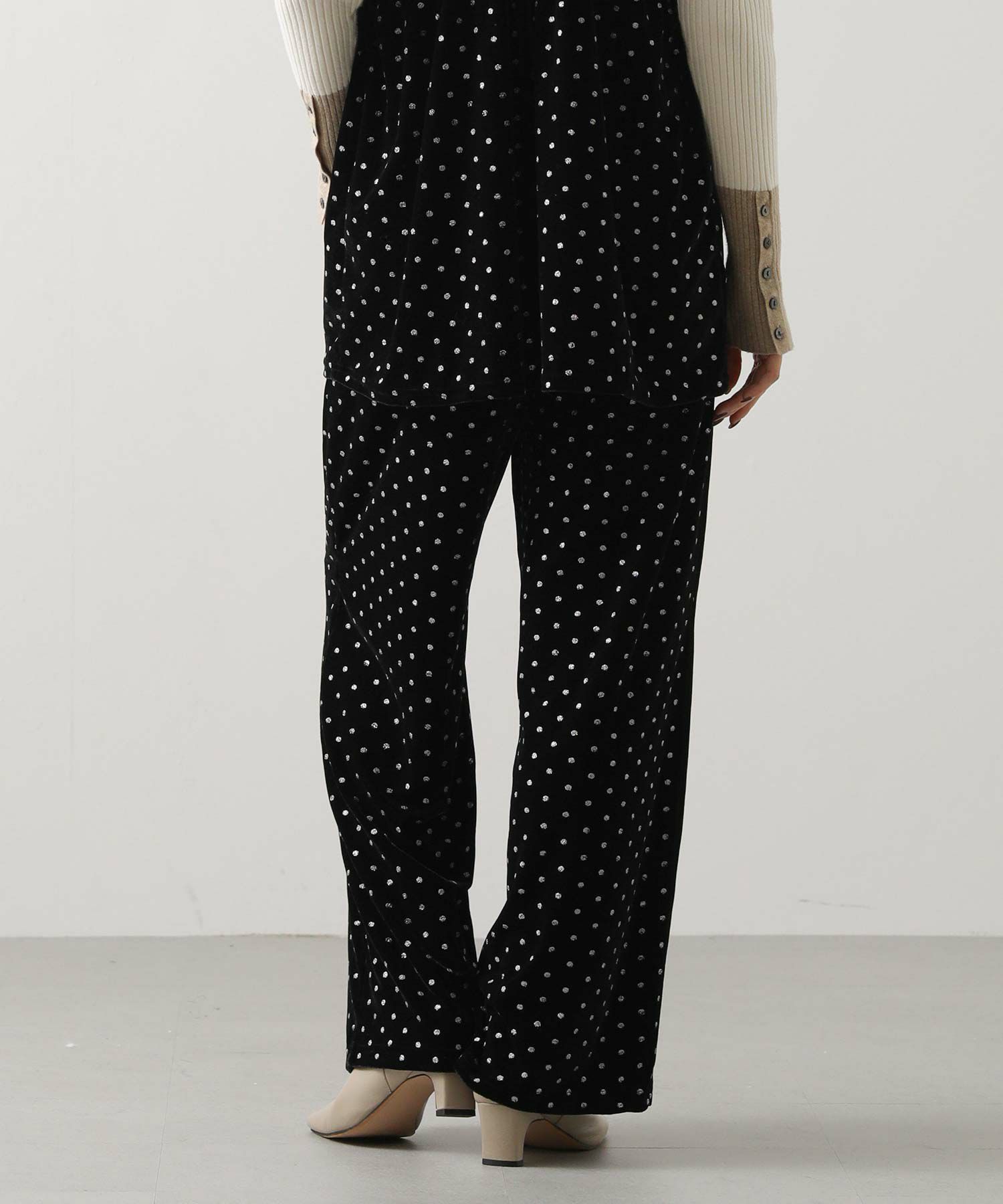 一気に旬顔になれるキラっとドット柄が華やかなベロアパンツ。