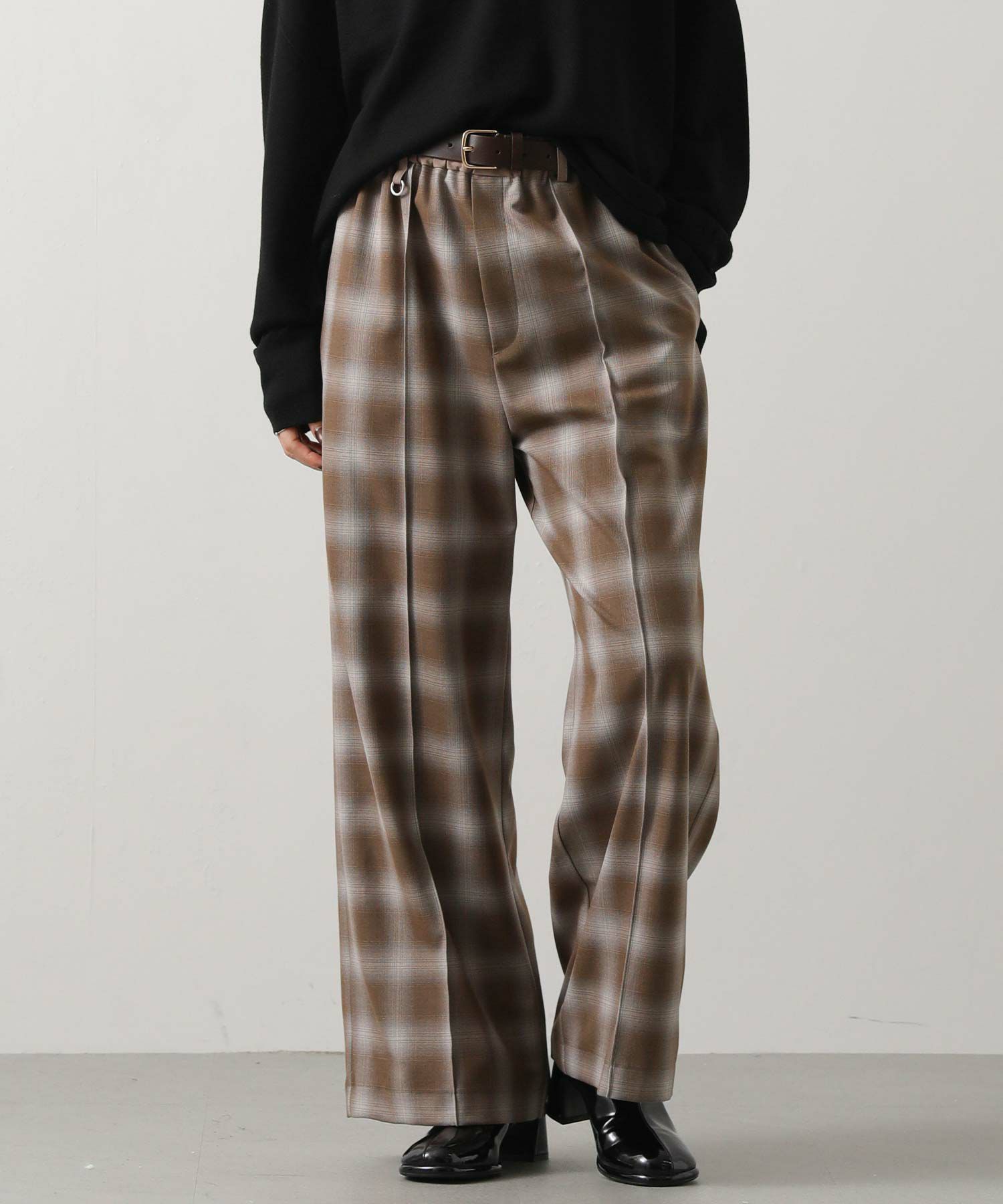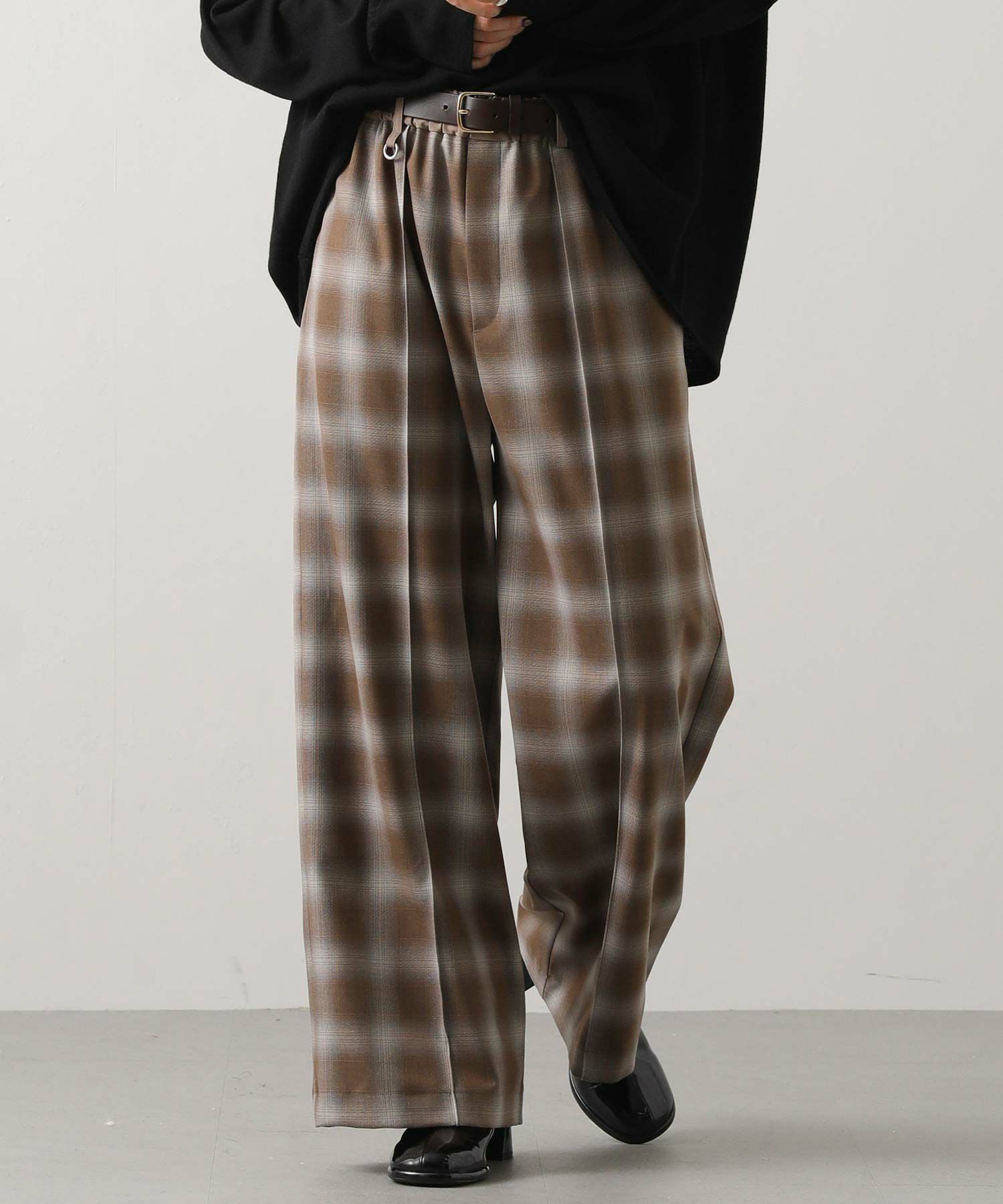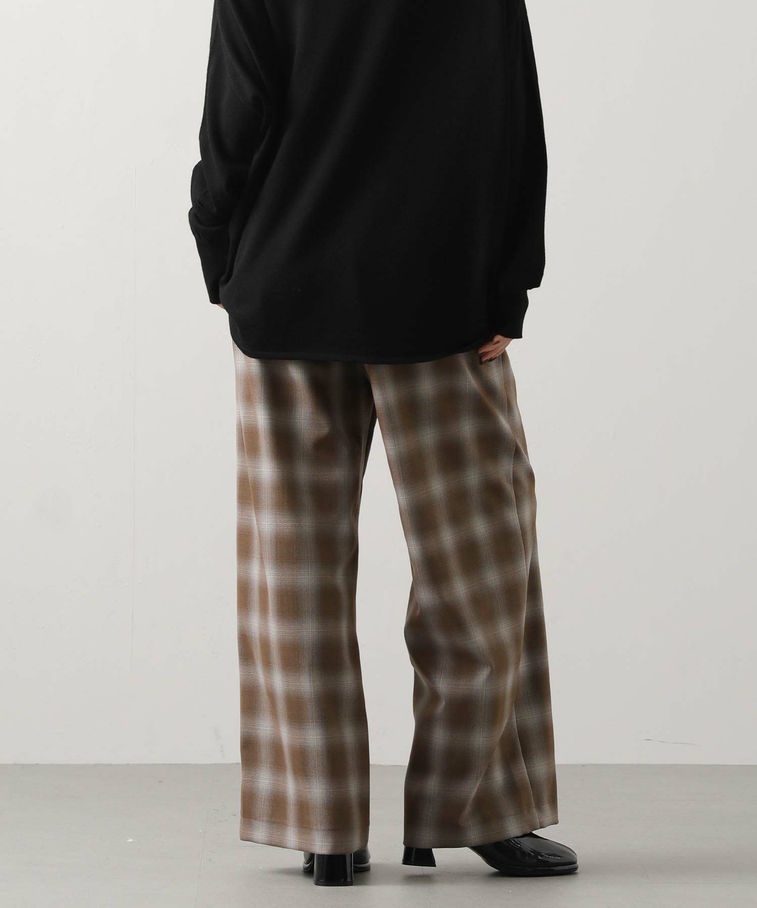 オンブレチェックの裏微起毛ツイルを使用した、ピンタック入りのワイドパンツ。