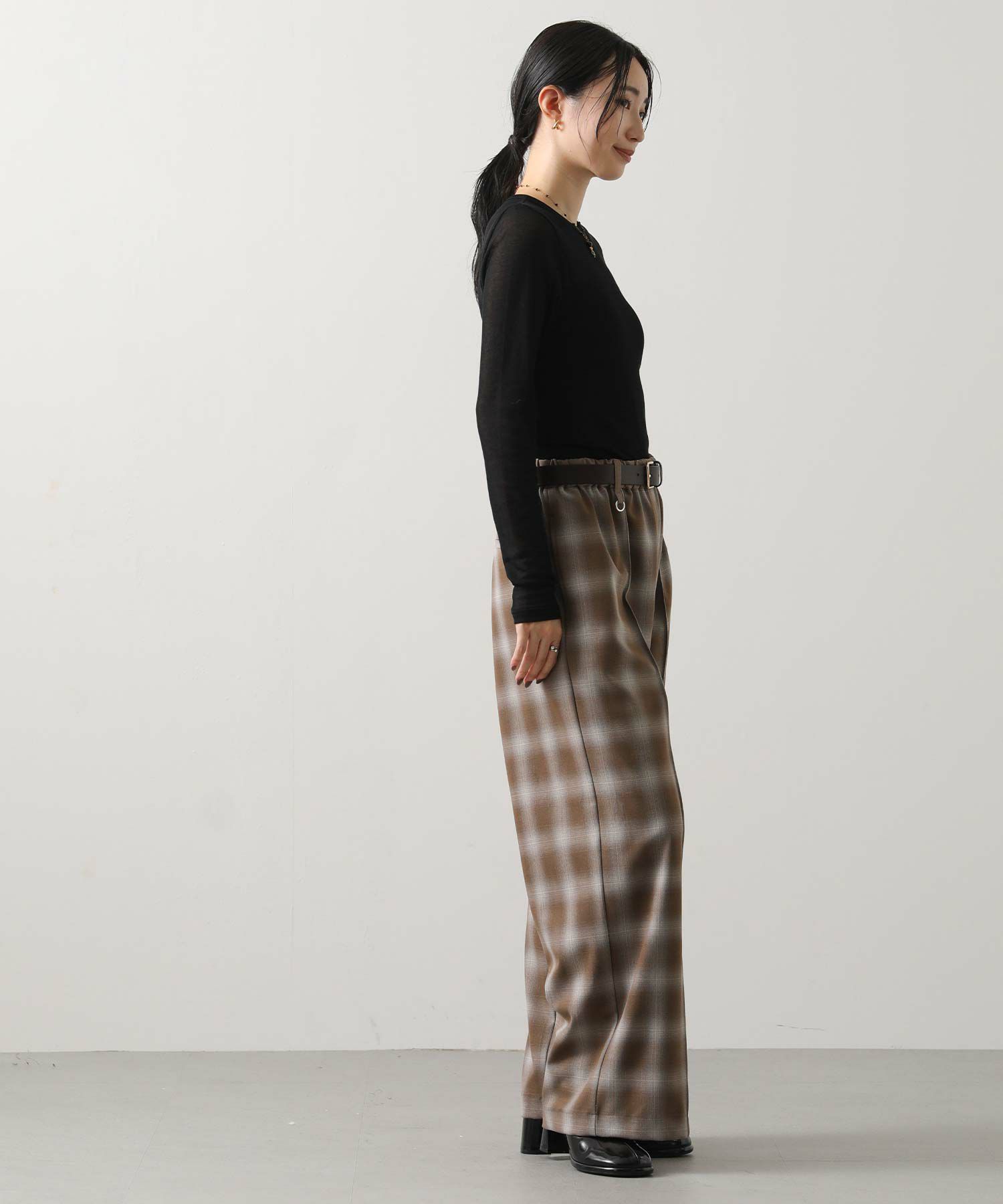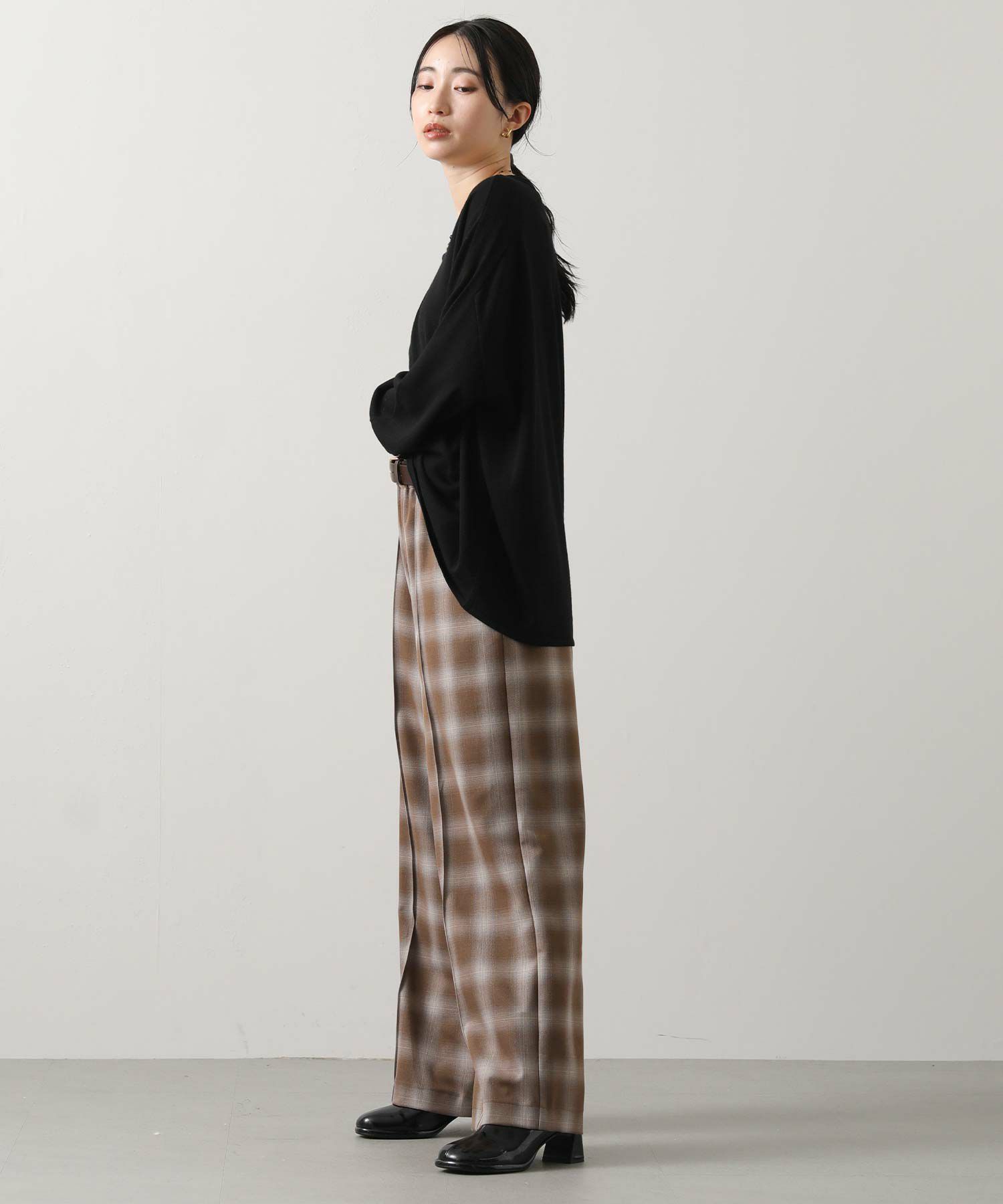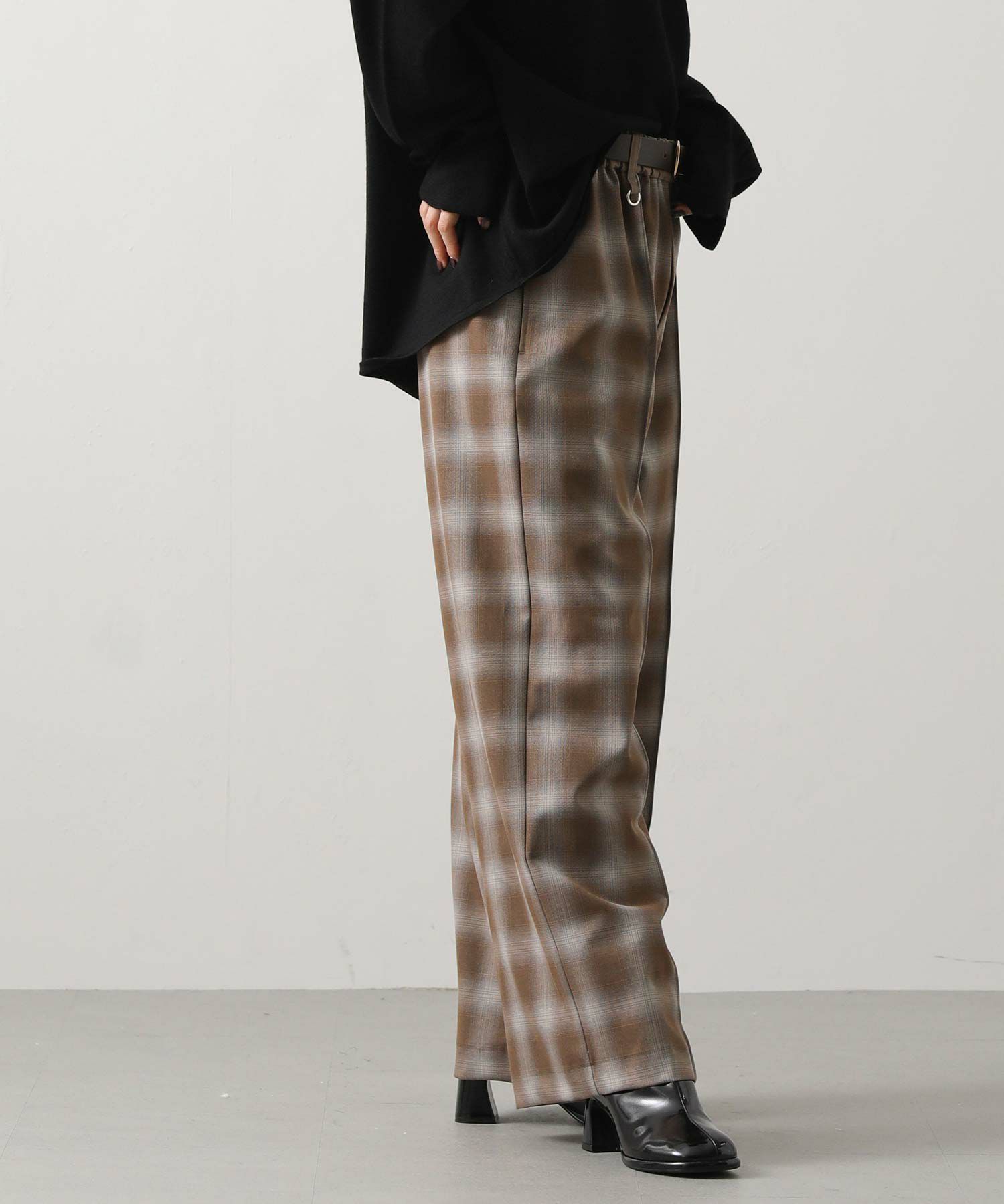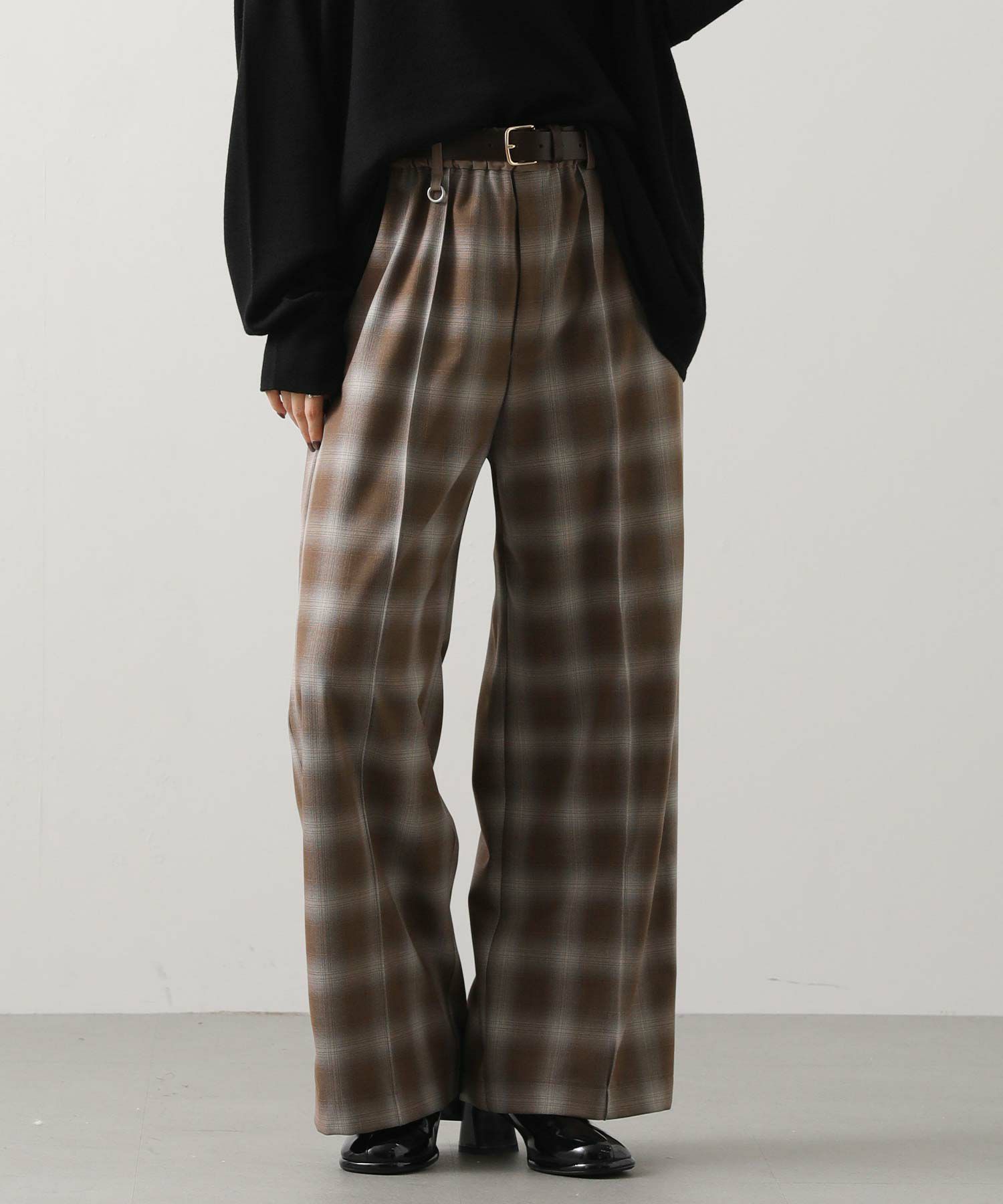 オンブレチェックの裏微起毛ツイルを使用した、ピンタック入りのワイドパンツ。