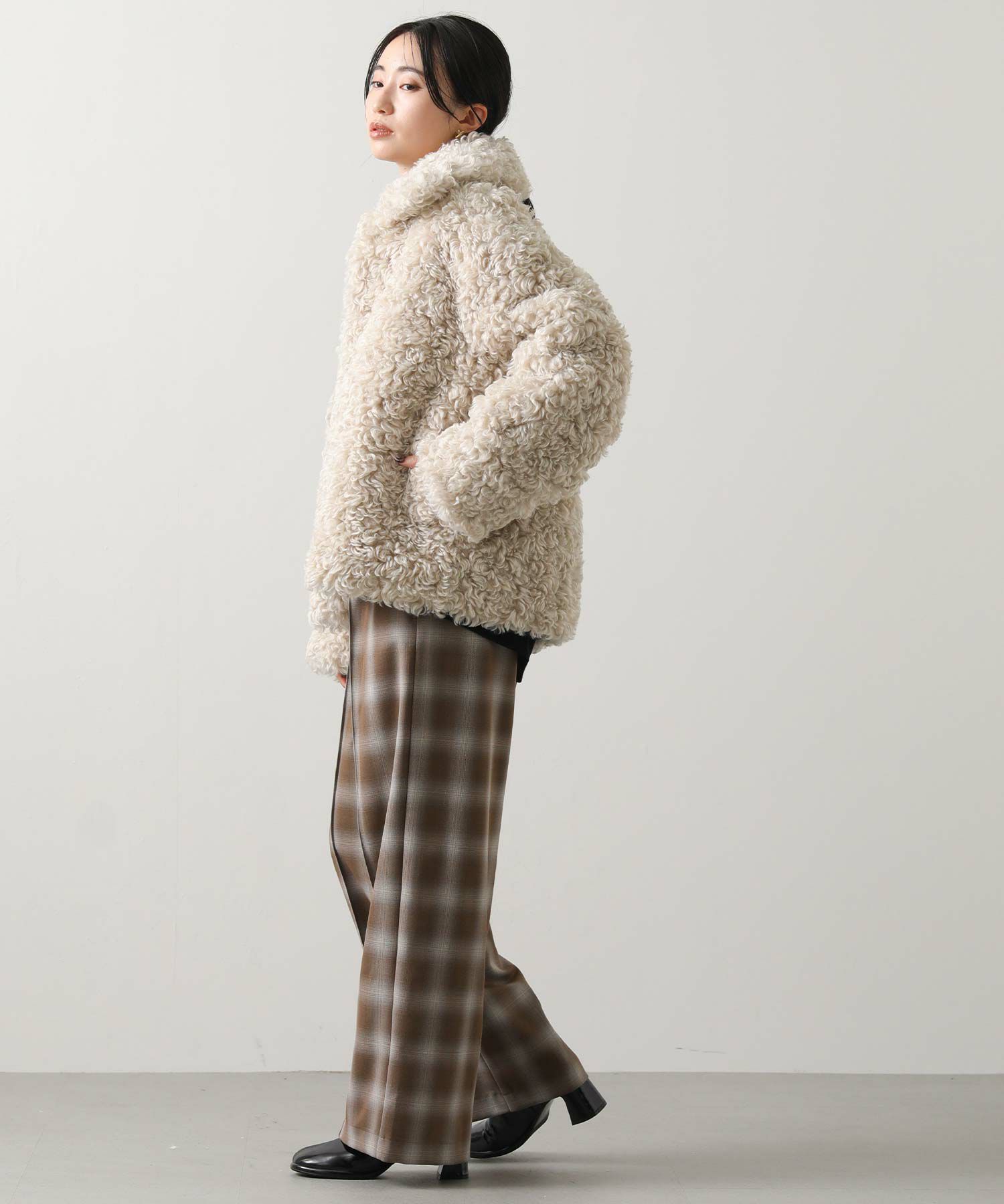 きれいな表面感の素材なので、オンブレチェックでもカジュアルになり過ぎないのがポイント。