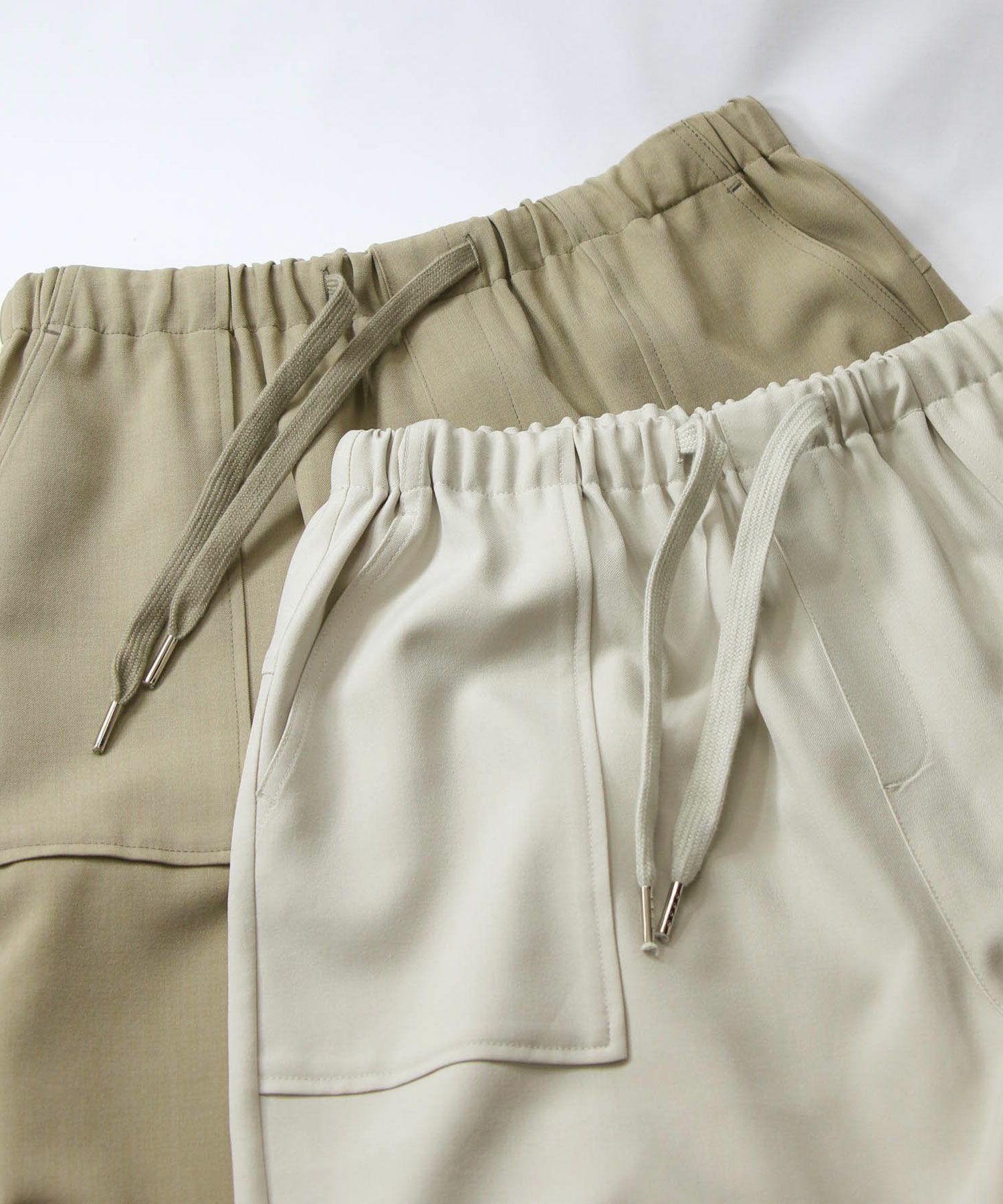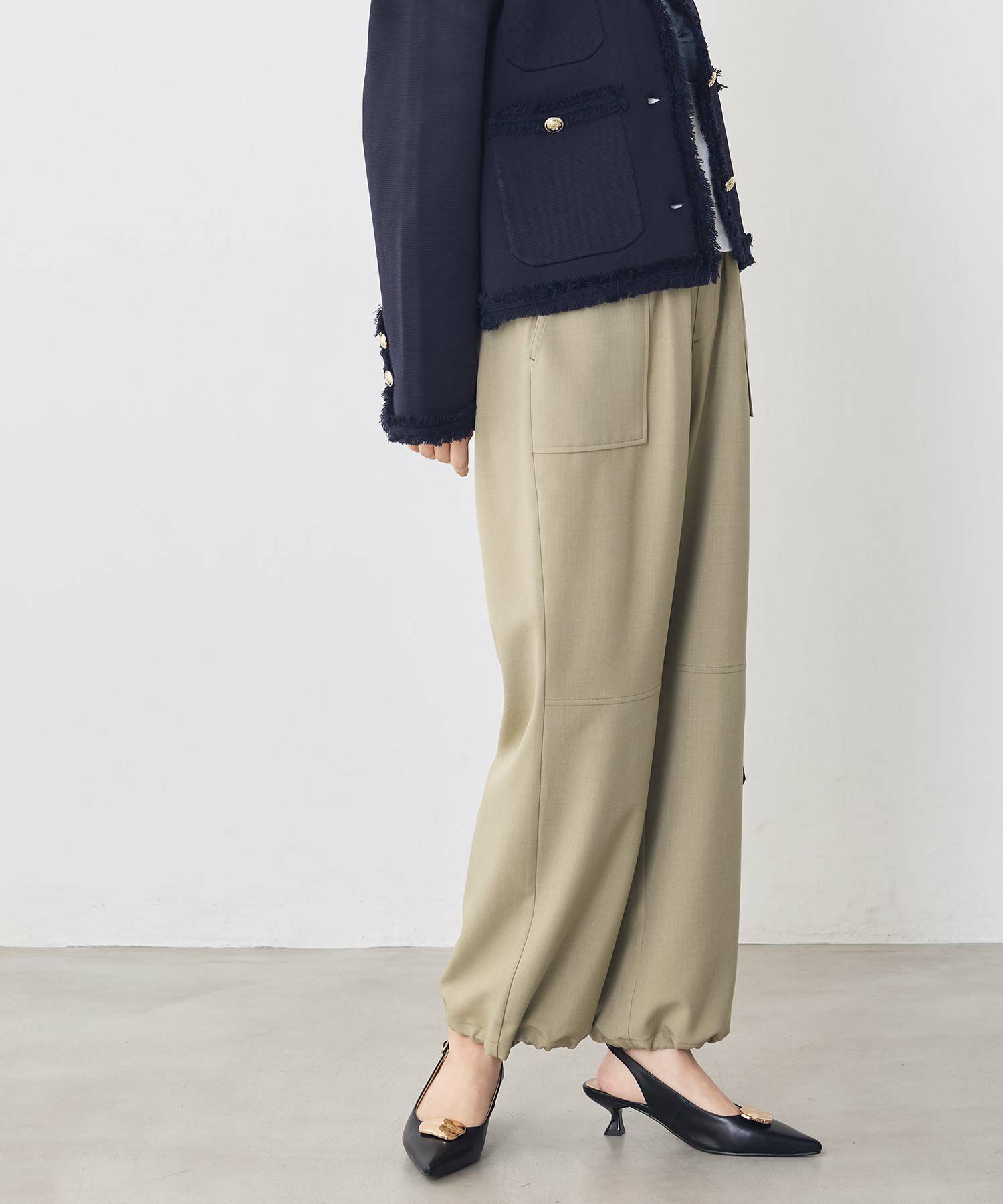 裾のドローコードでシルエットを変化させることにより、スニーカーやパンプス、サンダルなど足元に合わせて変えられるので、様々なシーンで楽しめます。