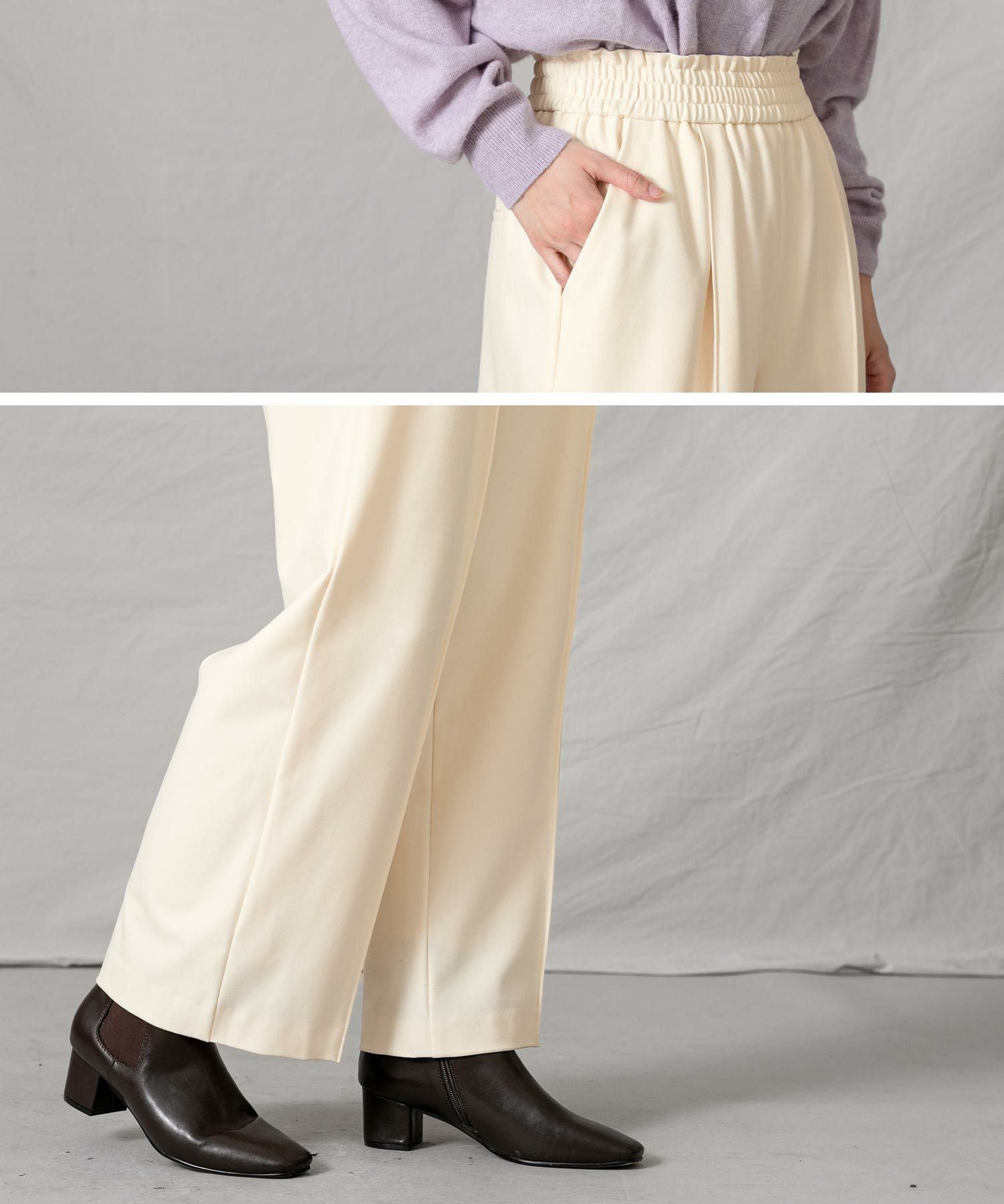 穿いた瞬間から温もりを感じられる、肌触りの良い滑らかな裏起毛生地のイージーセミワイドパンツ。