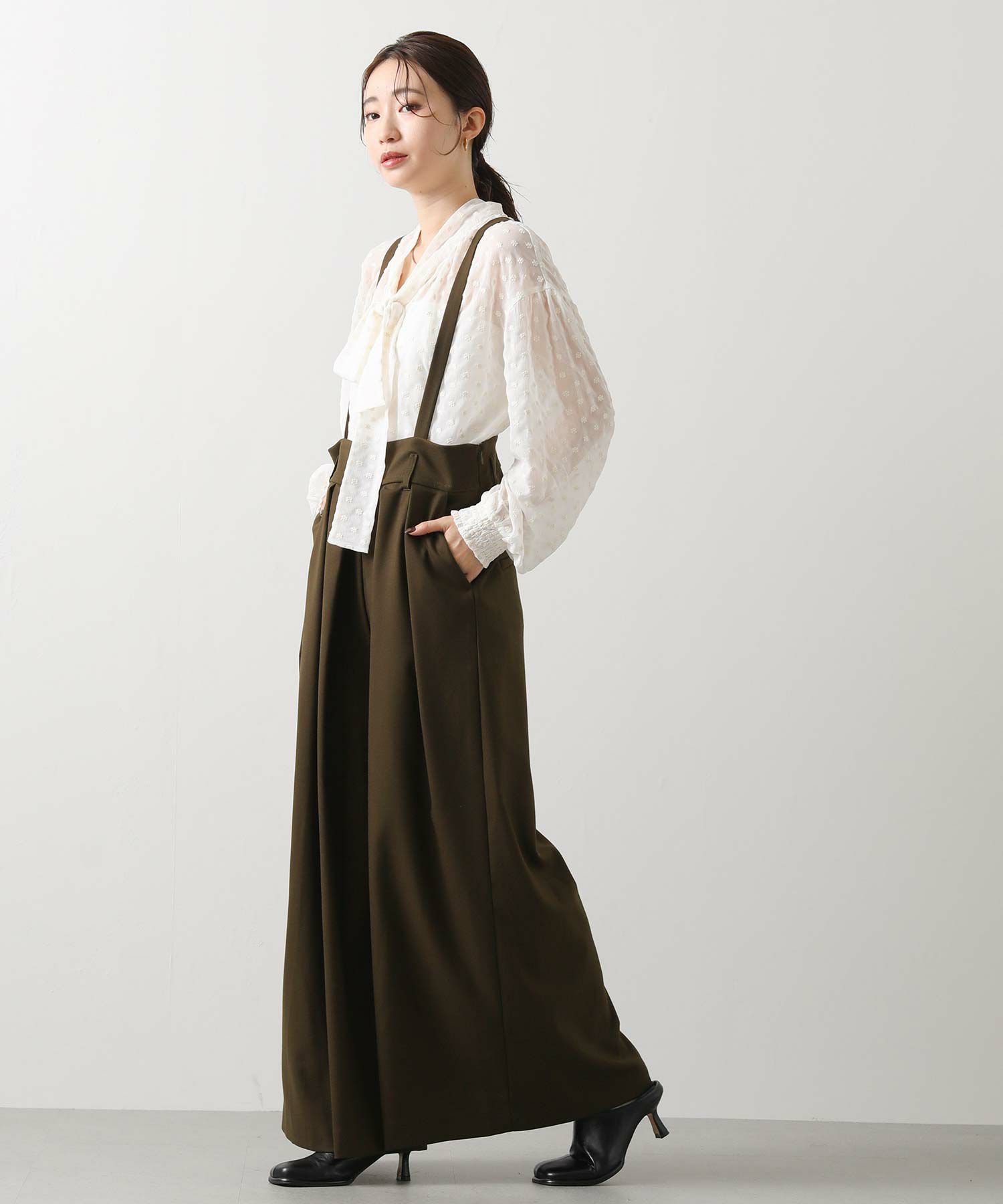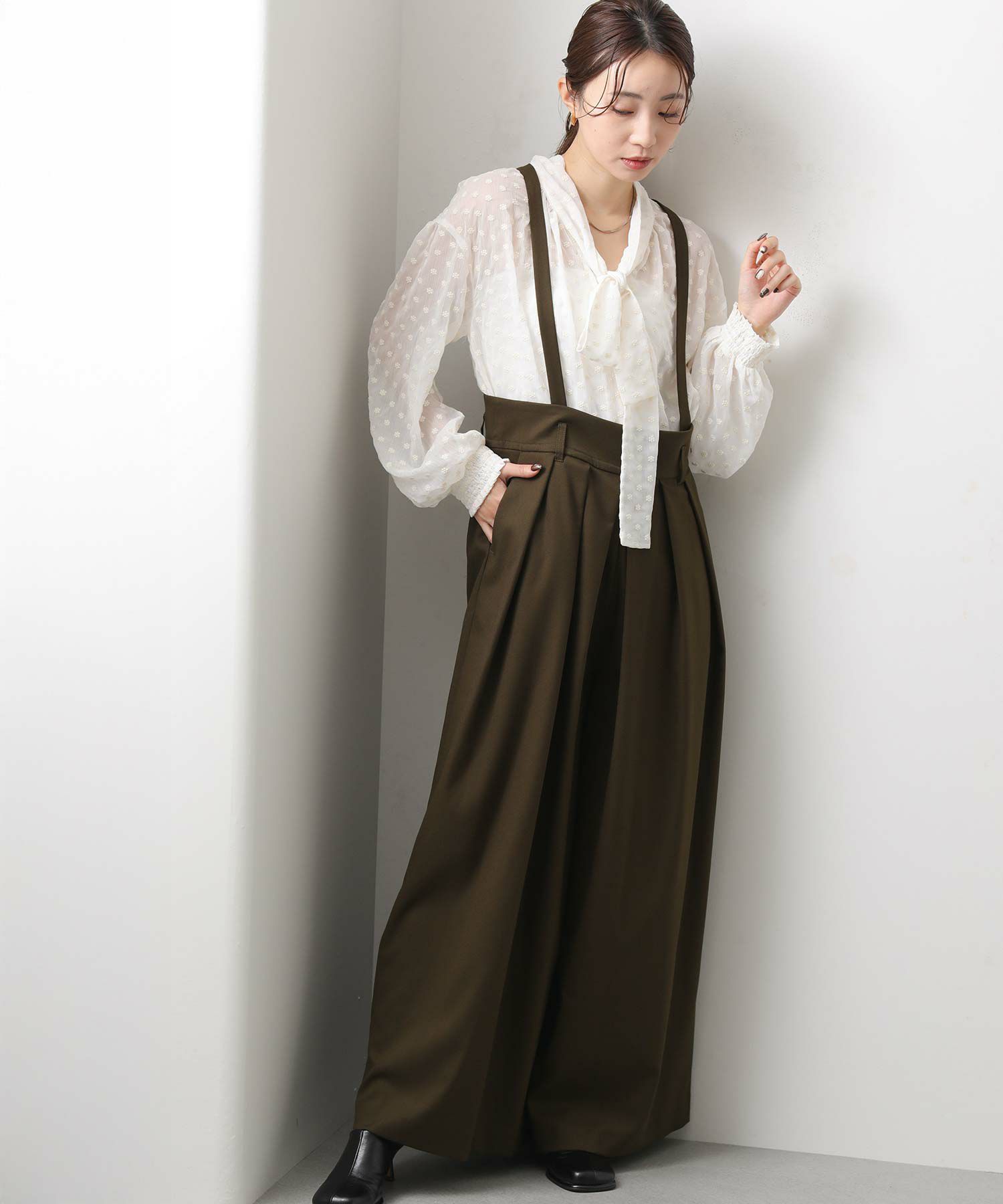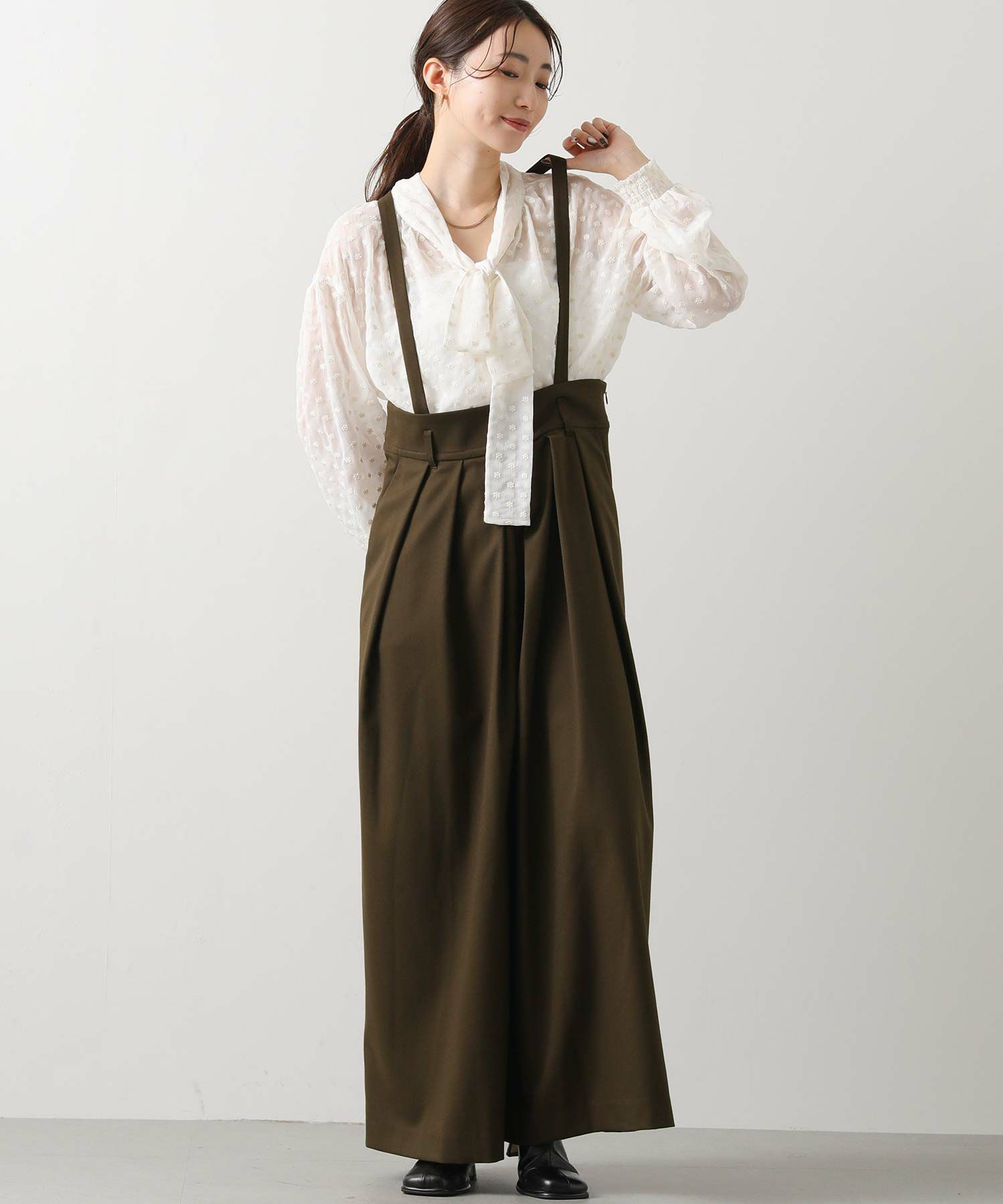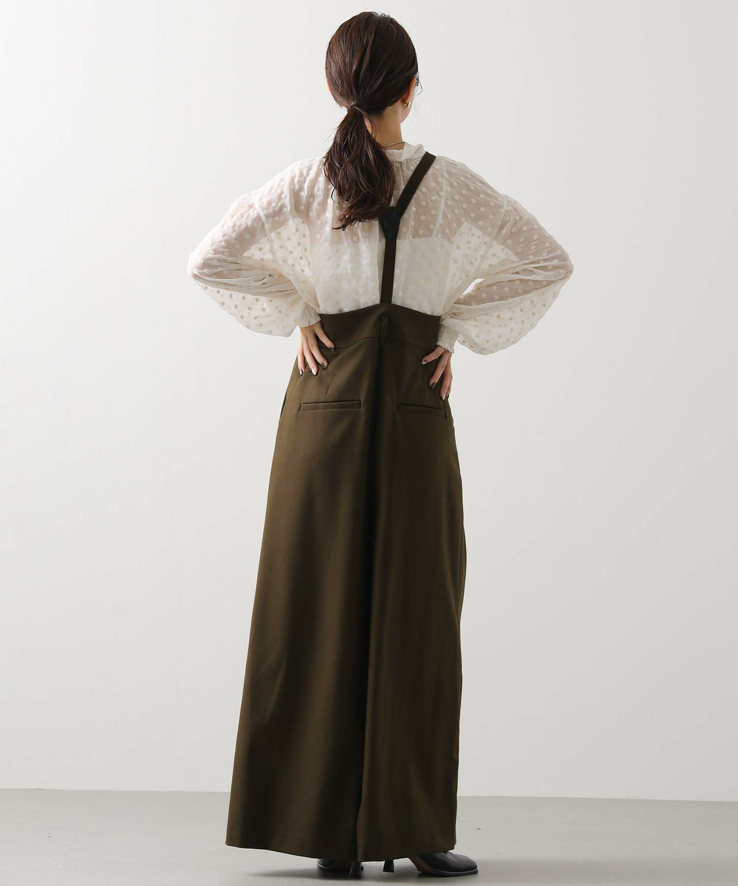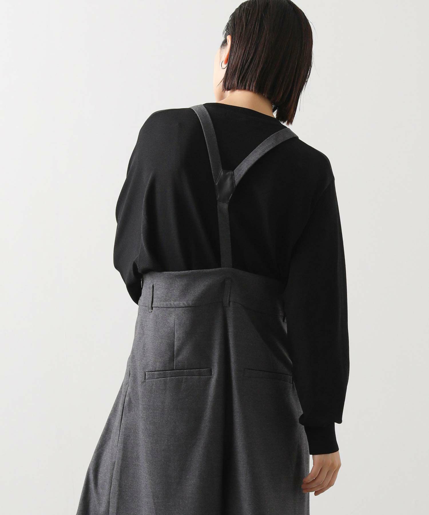 ウエストは大きめでベルト仕様になっており、フロントのたっぷり入ったタックがハの字に広がり、共布の肩ひもベルトで吊って着用するアイテムです。