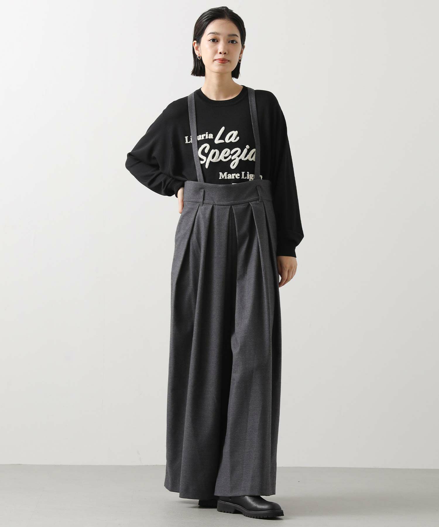 【MARECHALTERRE(マルシャルテル】から、贅沢に広がるシルエットのタック入り超ワイドサロペットパンツをセレクト。