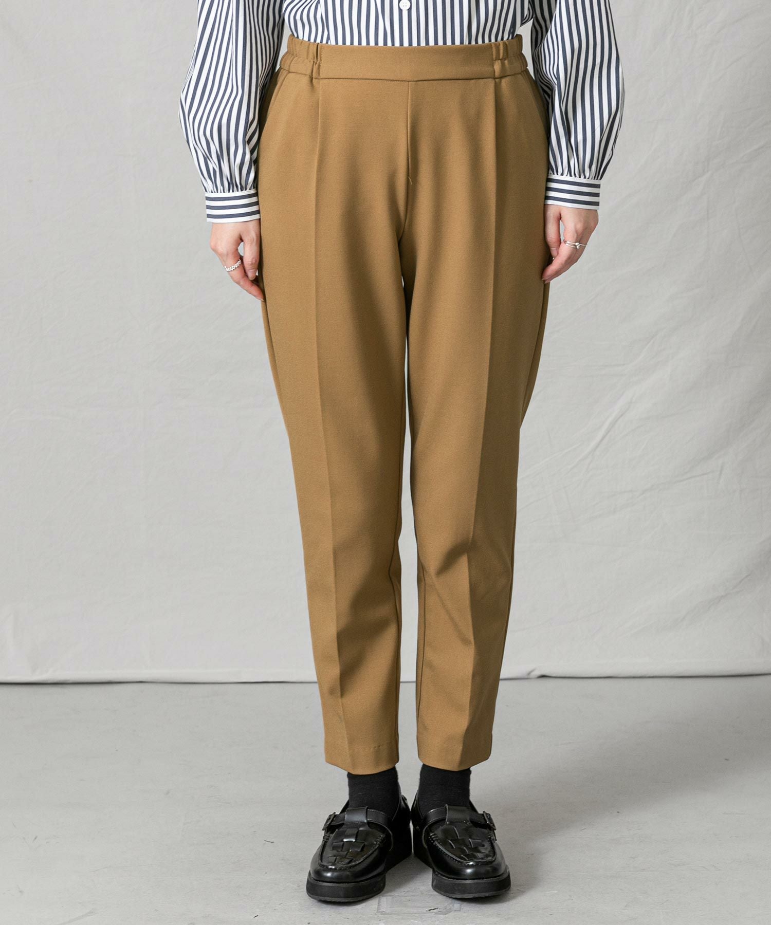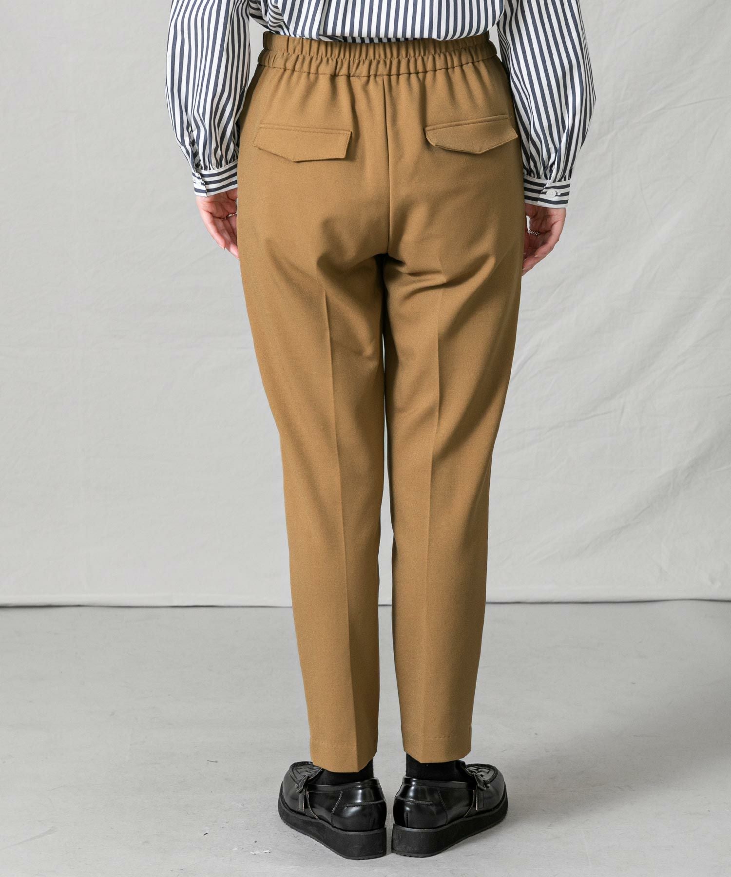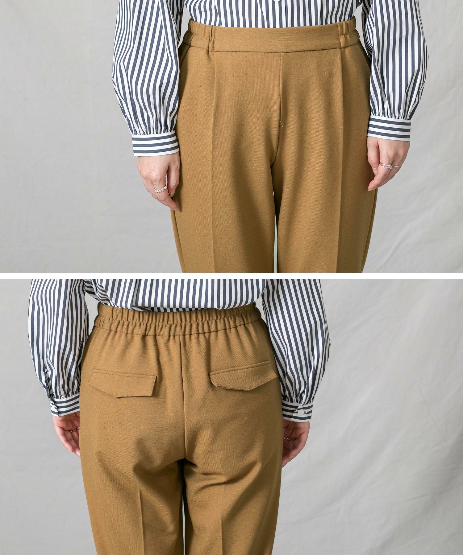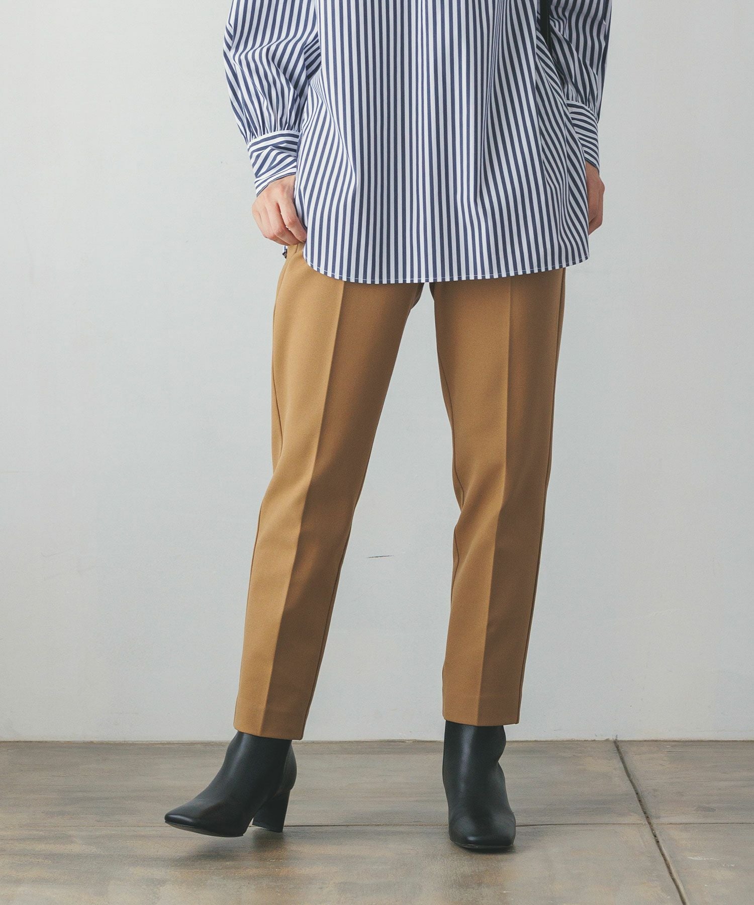 センタープレスが入り足をすっきり綺麗に見せながら、ウエストはイージーな仕様で楽な履き心地も魅力的。
