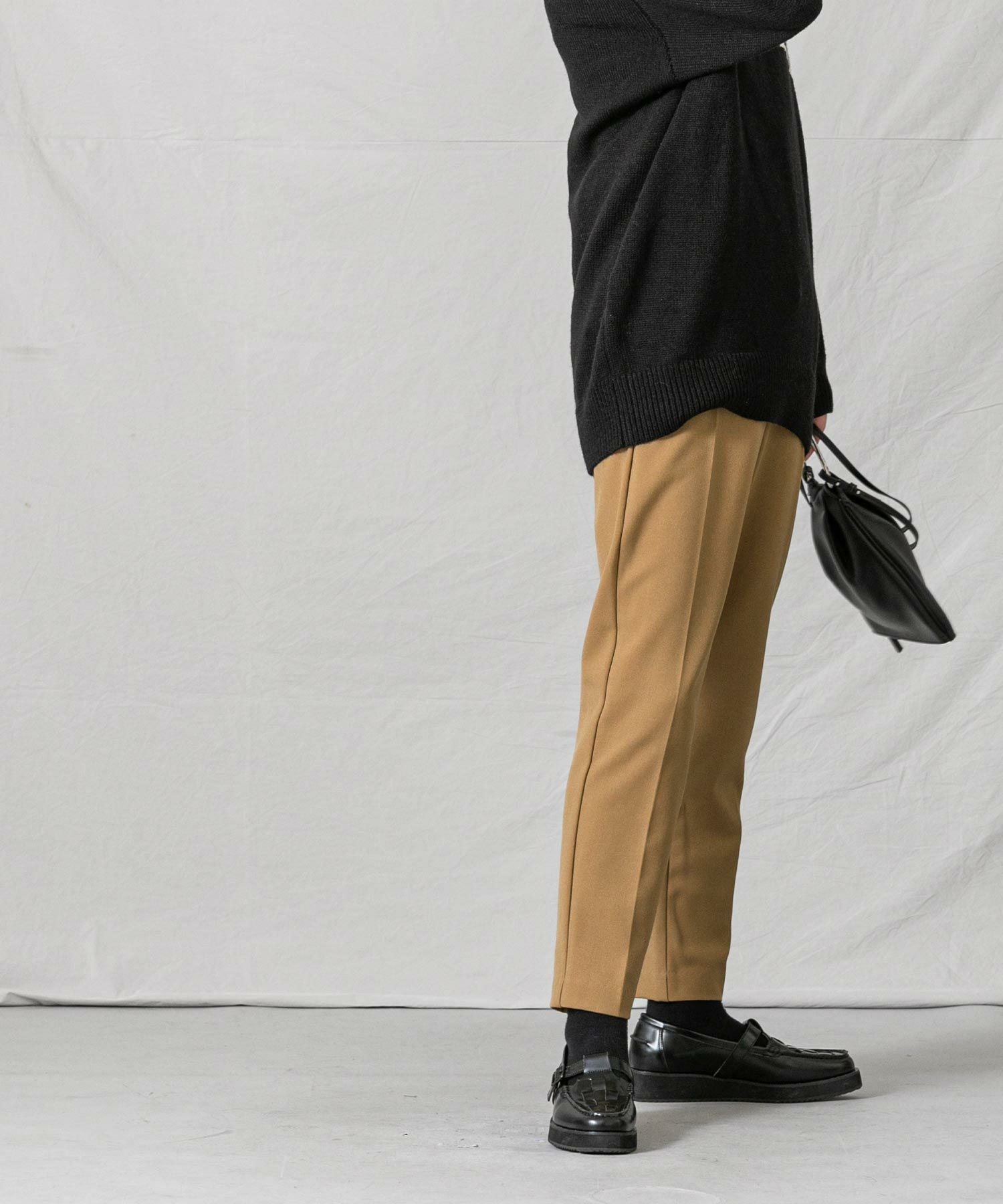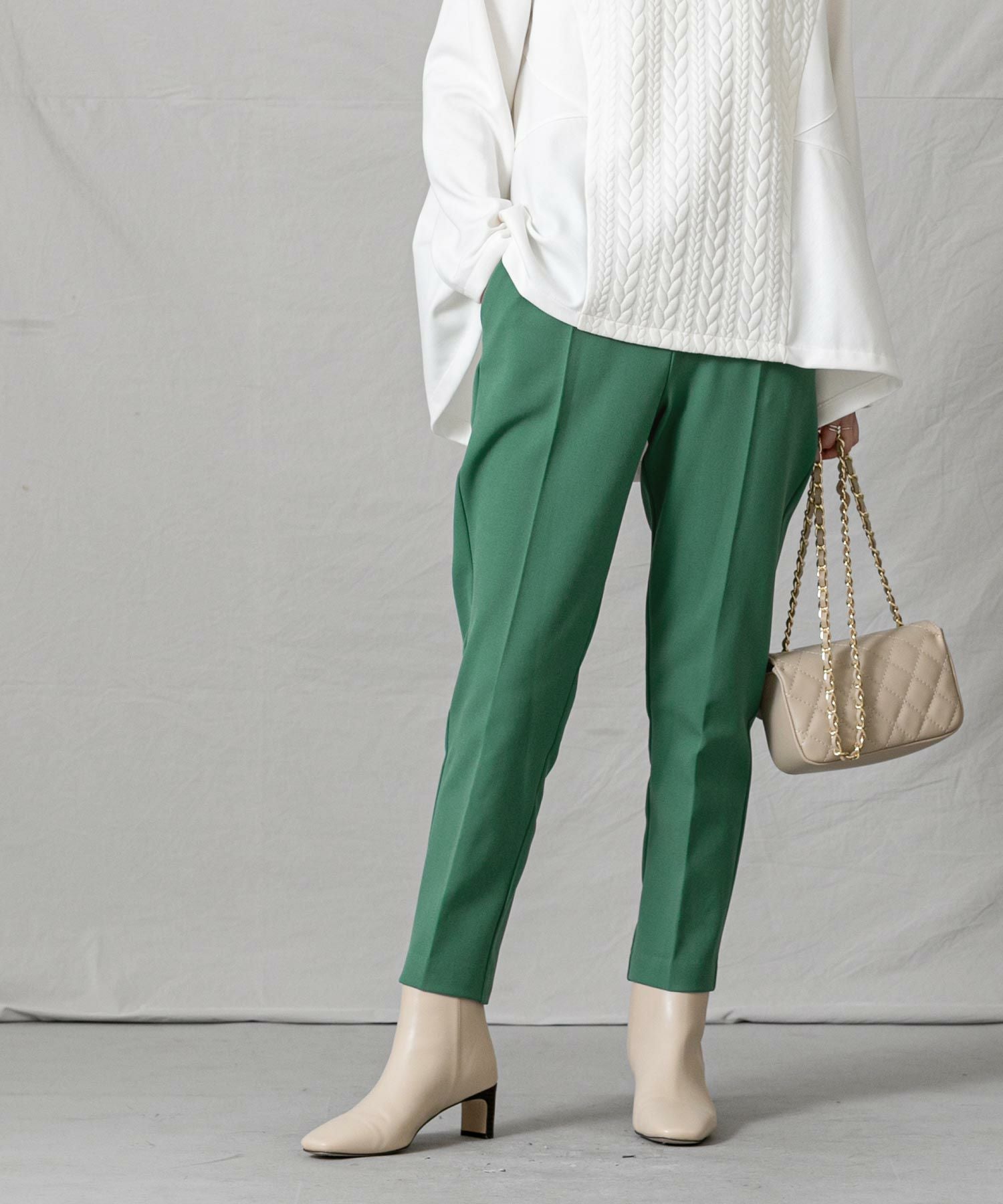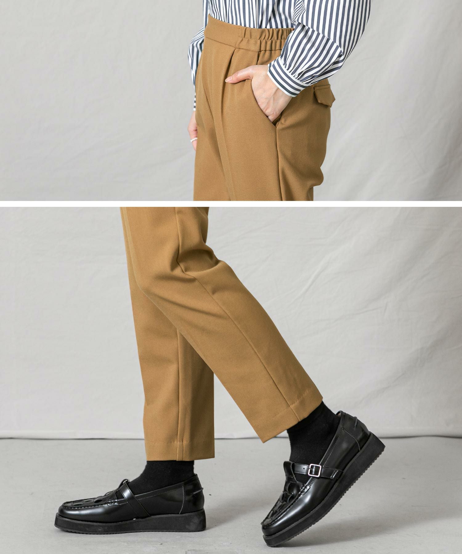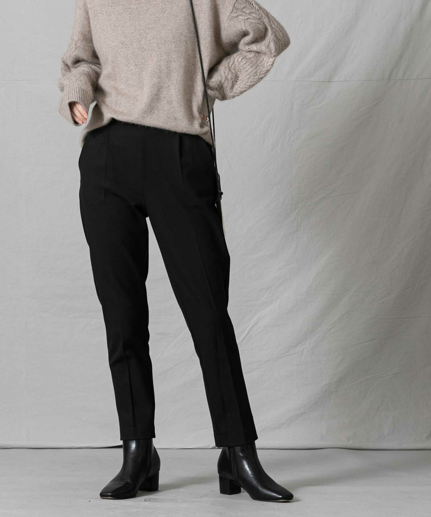 センタープレスが入り足をすっきり綺麗に見せながら、ウエストはイージーな仕様で楽な履き心地も魅力的。