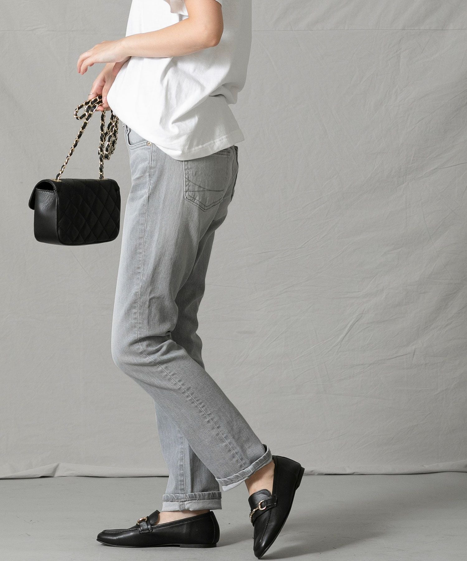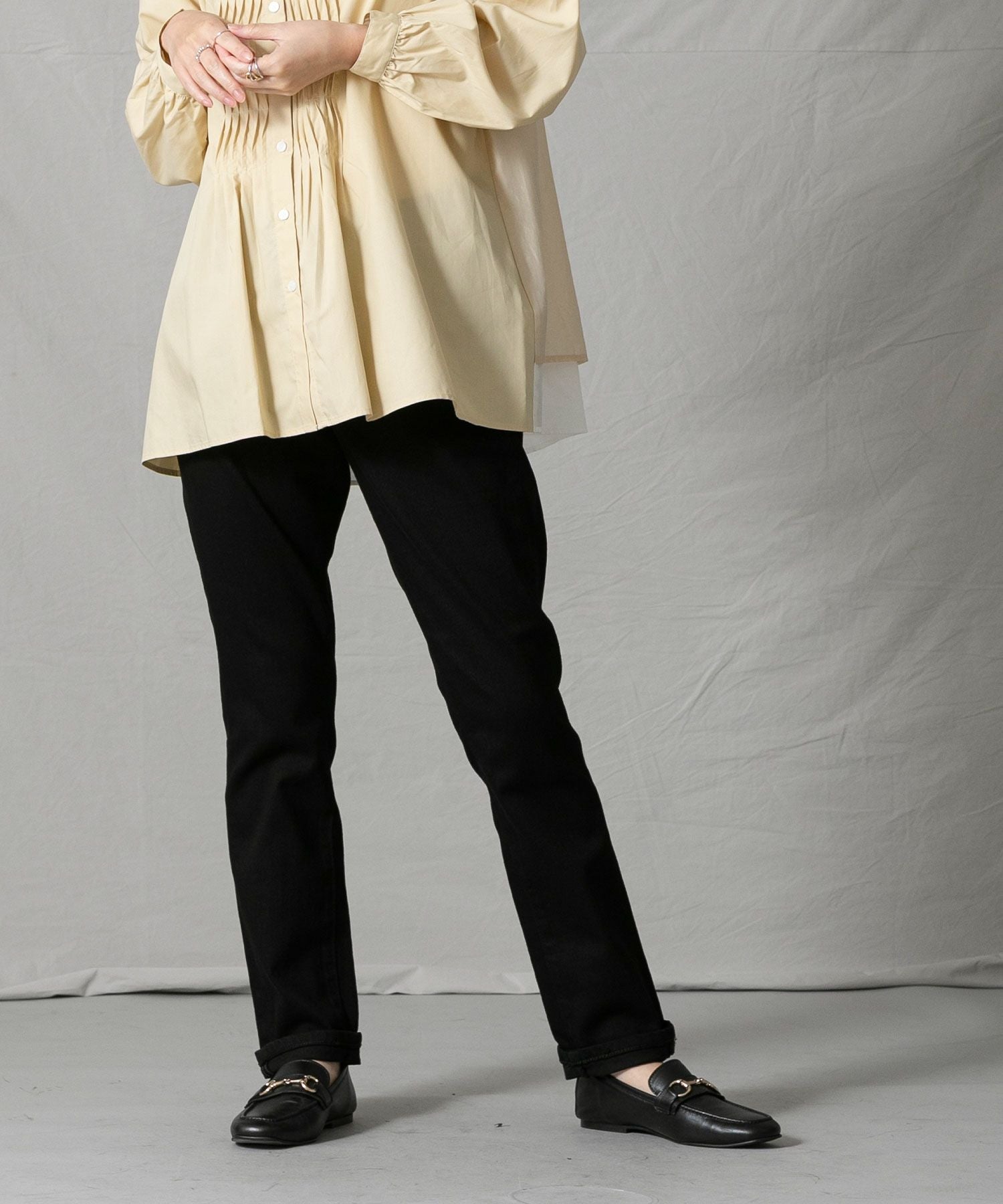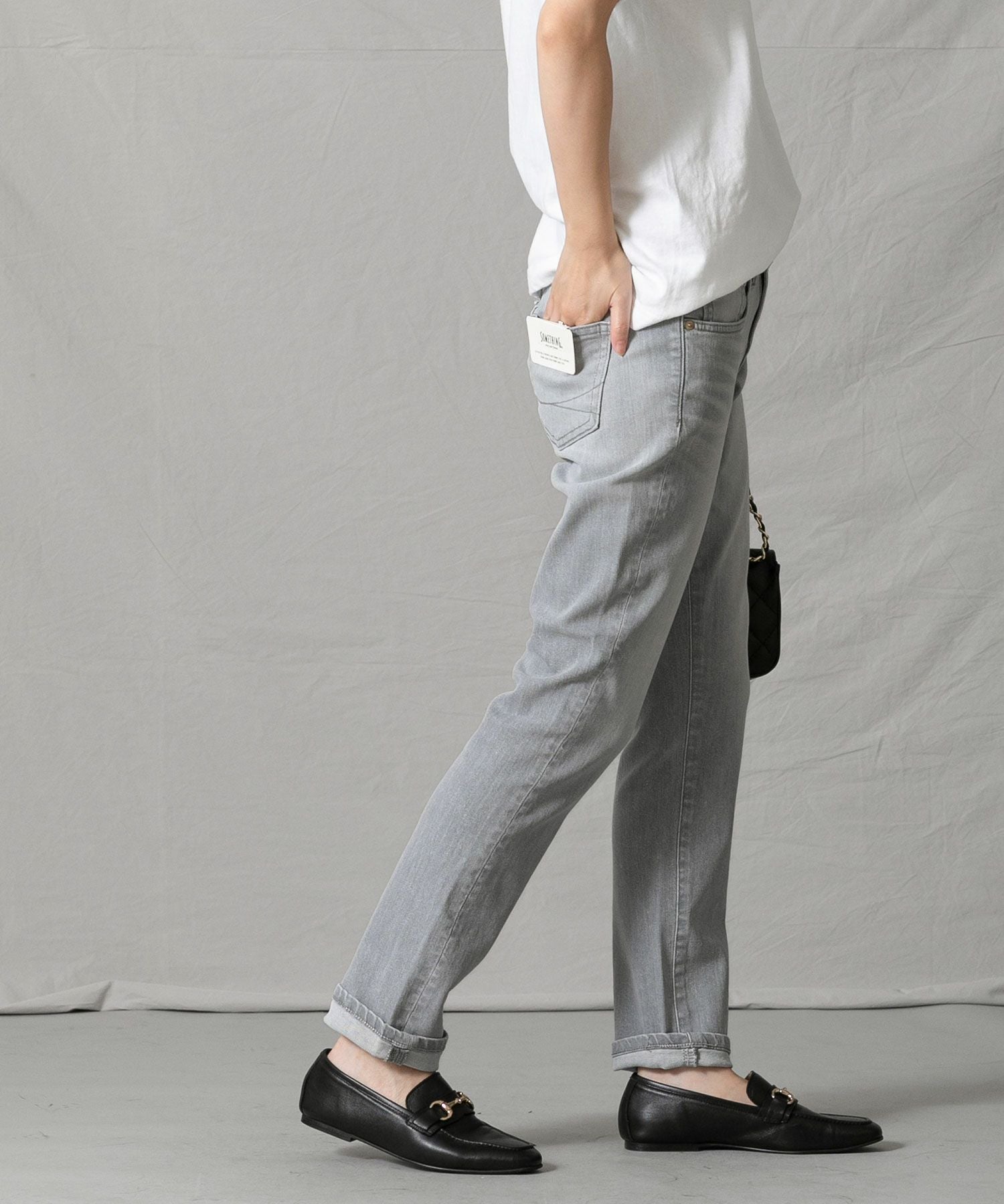 腰回りは程よくゆったりと、膝下はすっきりとしたテーパードシルエットでトップスとのバランスが取りやすく、着回し力の高いアテムです。