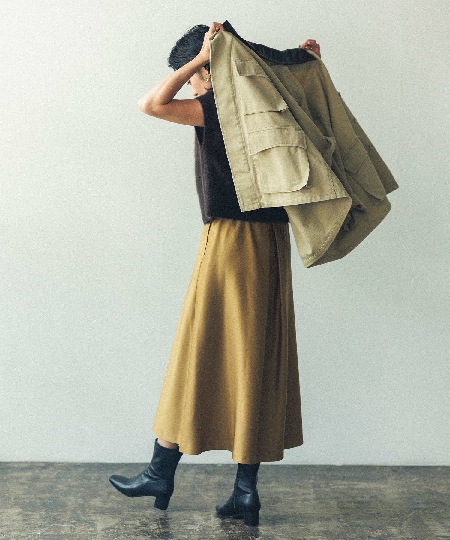 大胆なタックデザインが印象的、後ろ側のフレア分量が多いので、歩いた時の動きが美しいシルエットに。