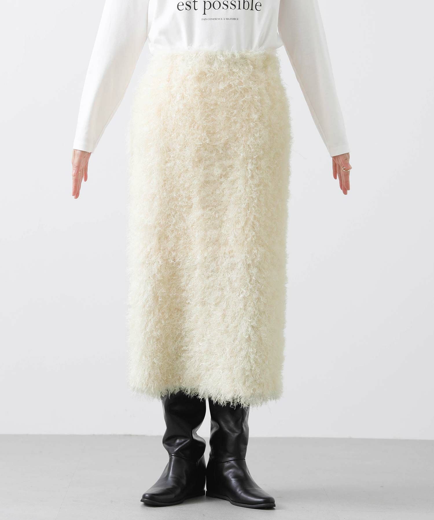 ファー素材が華やかなIラインスカート。カールした毛で表面感のある素材なので、着用するだけで目を惹くアイテムです。