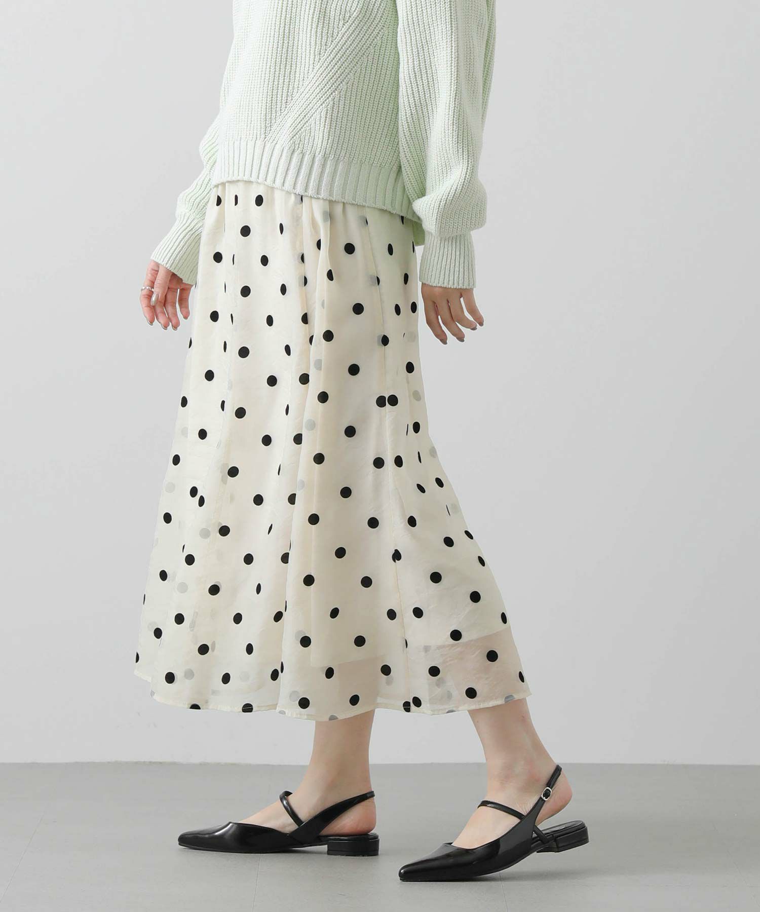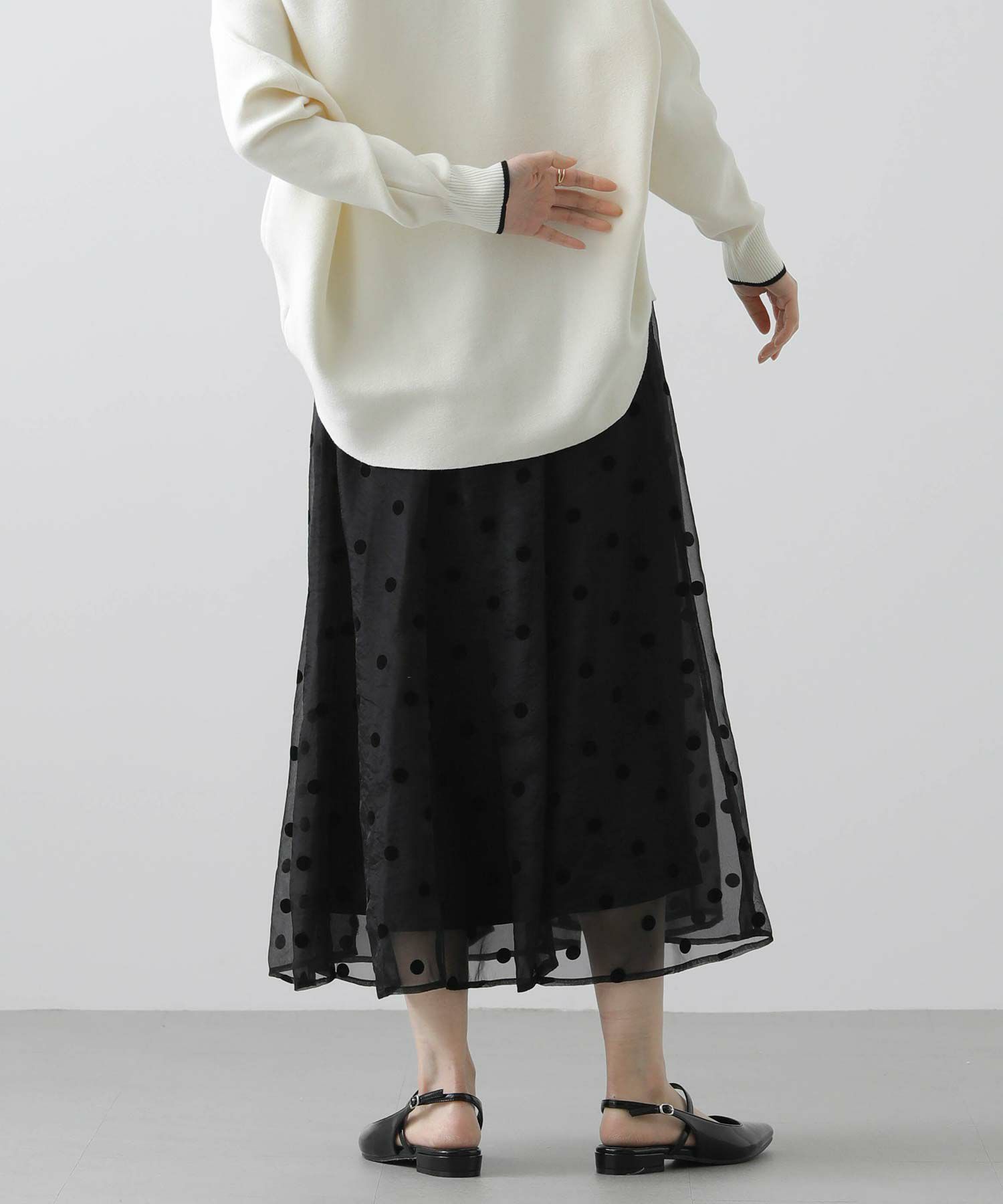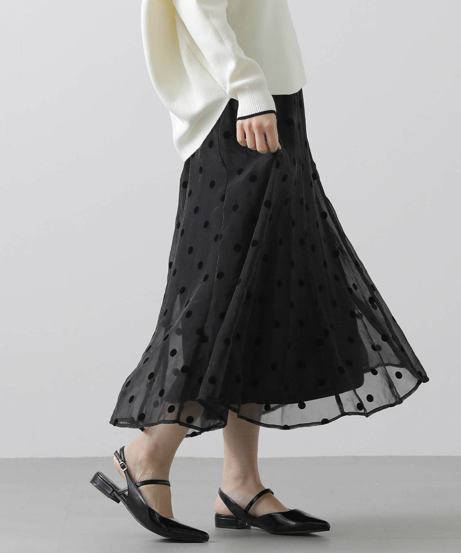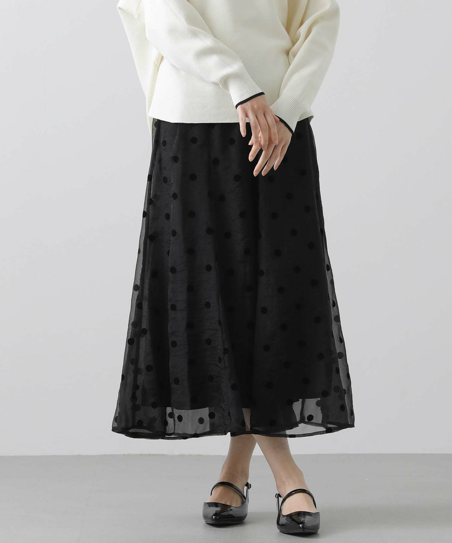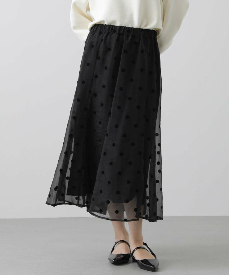 ドット柄の透け感があるオーガンジーが目を惹くギャザースカート。