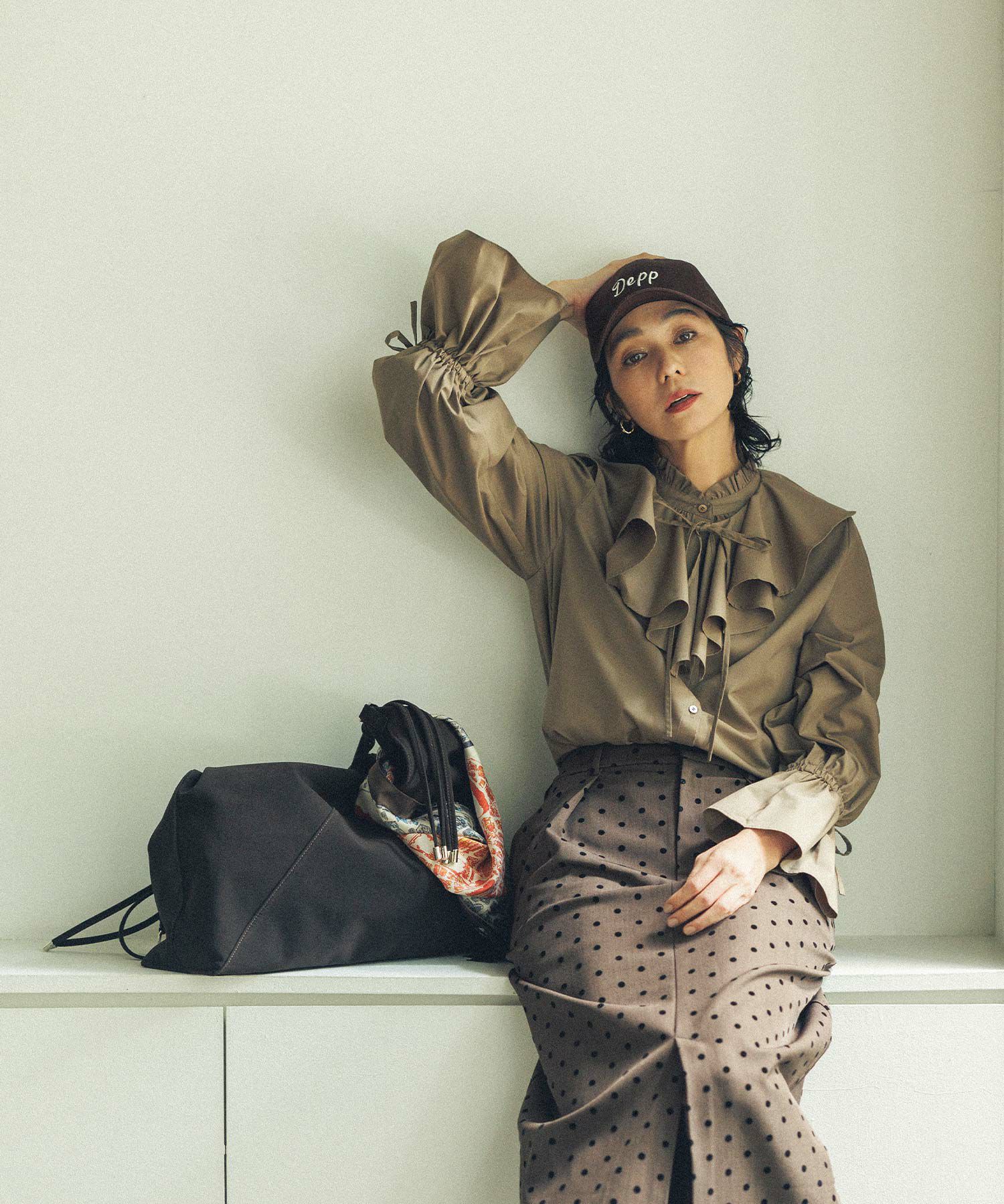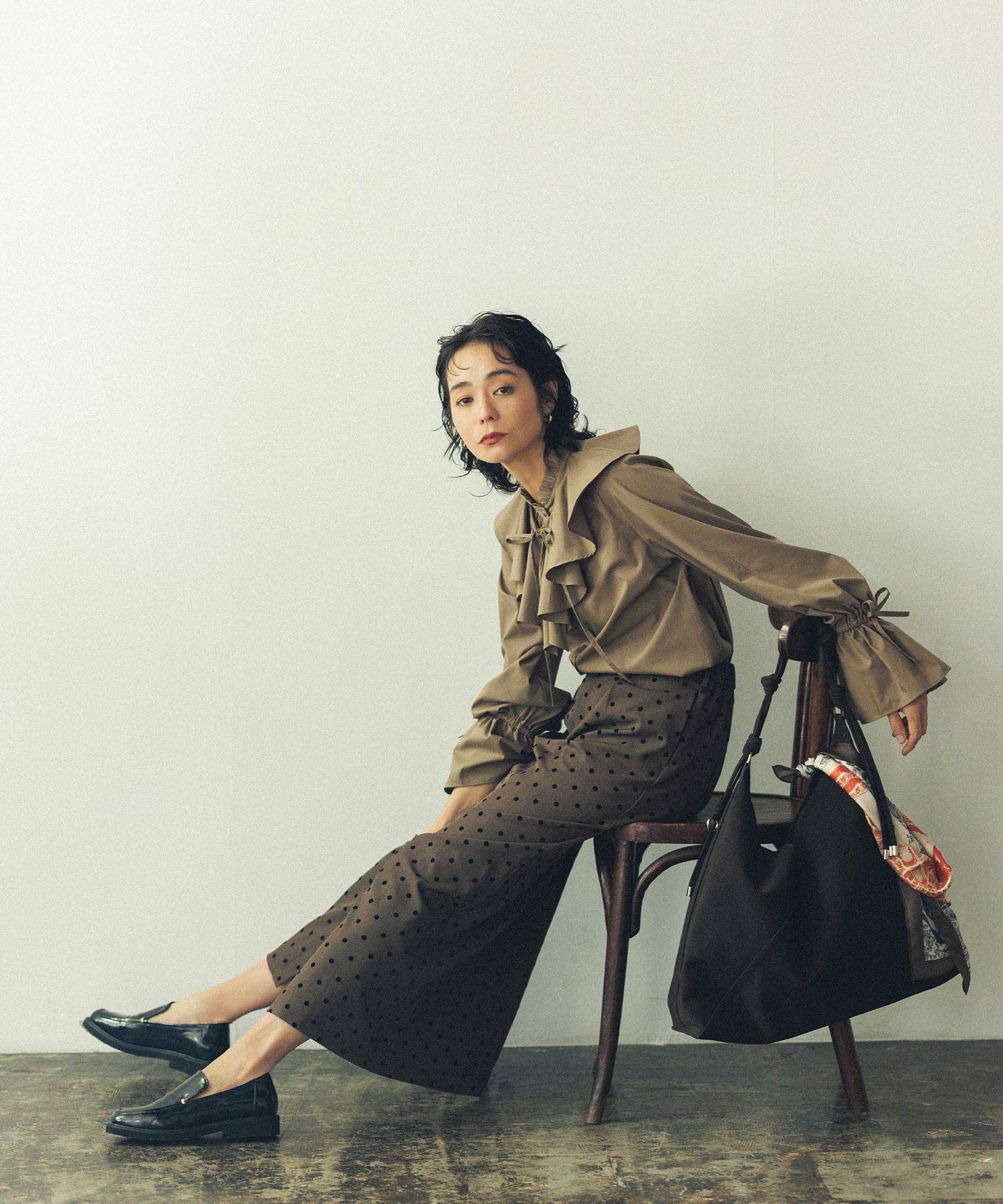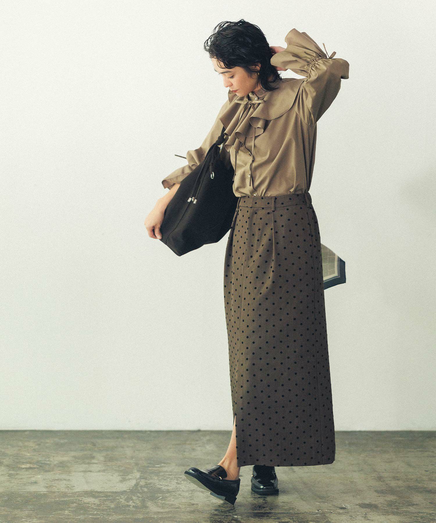 小さめのドット柄が甘過ぎず、スッキリとした印象に。