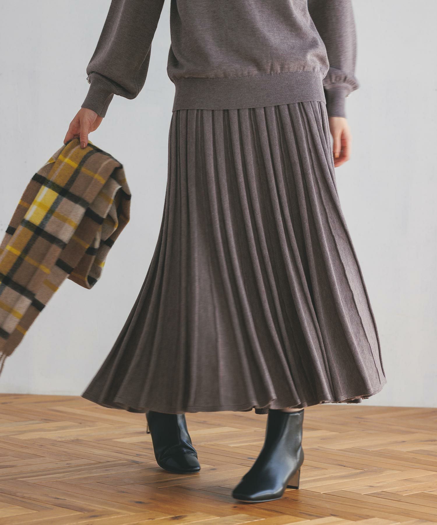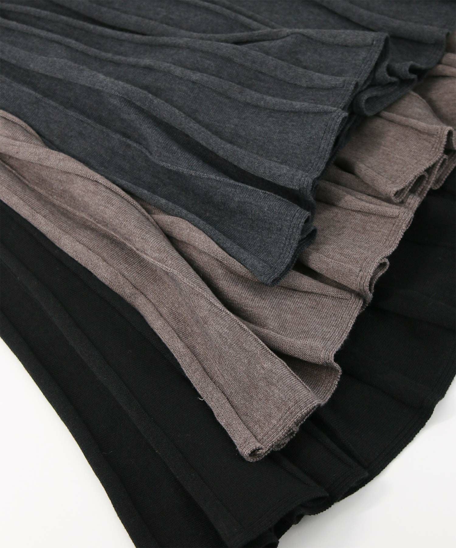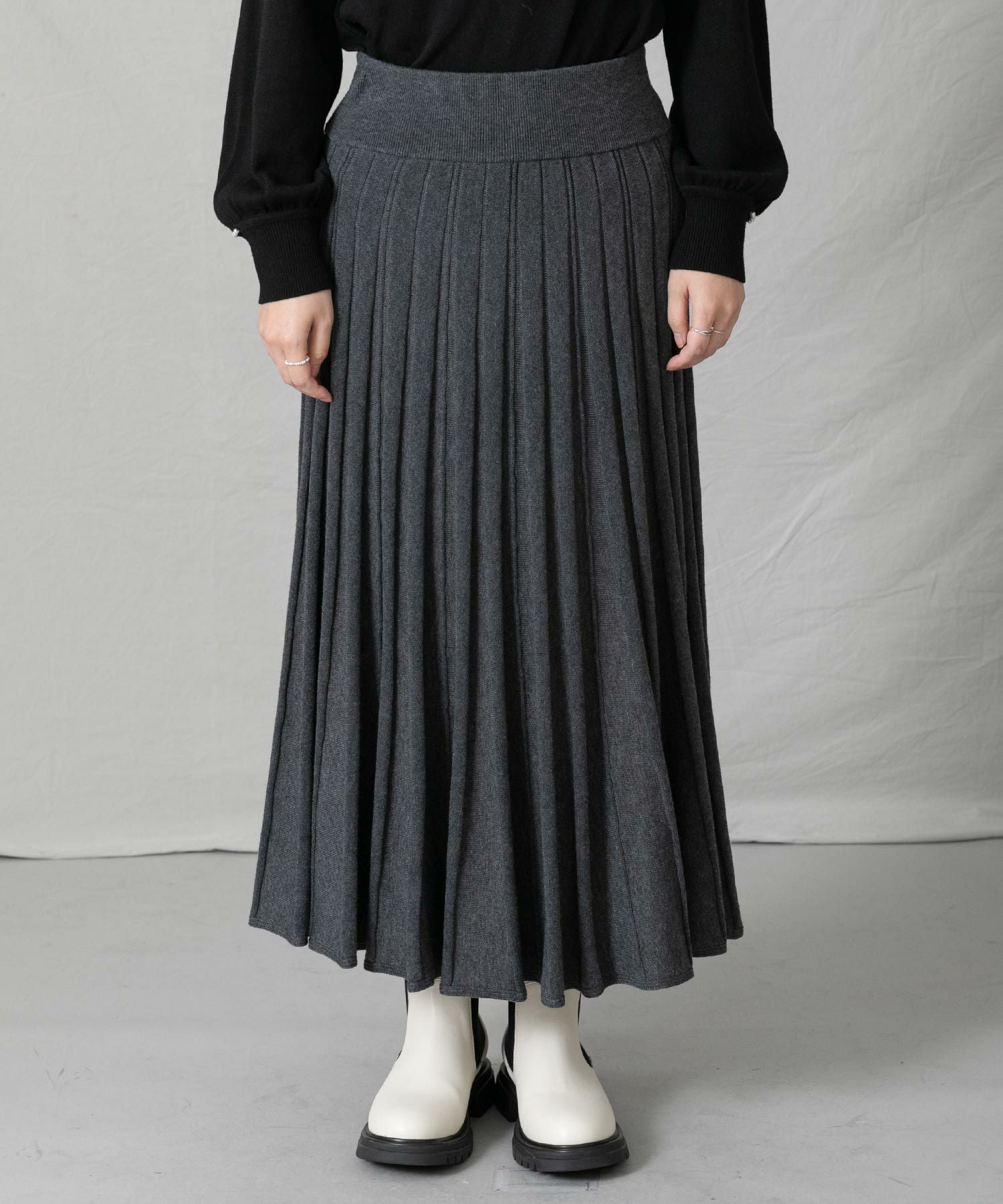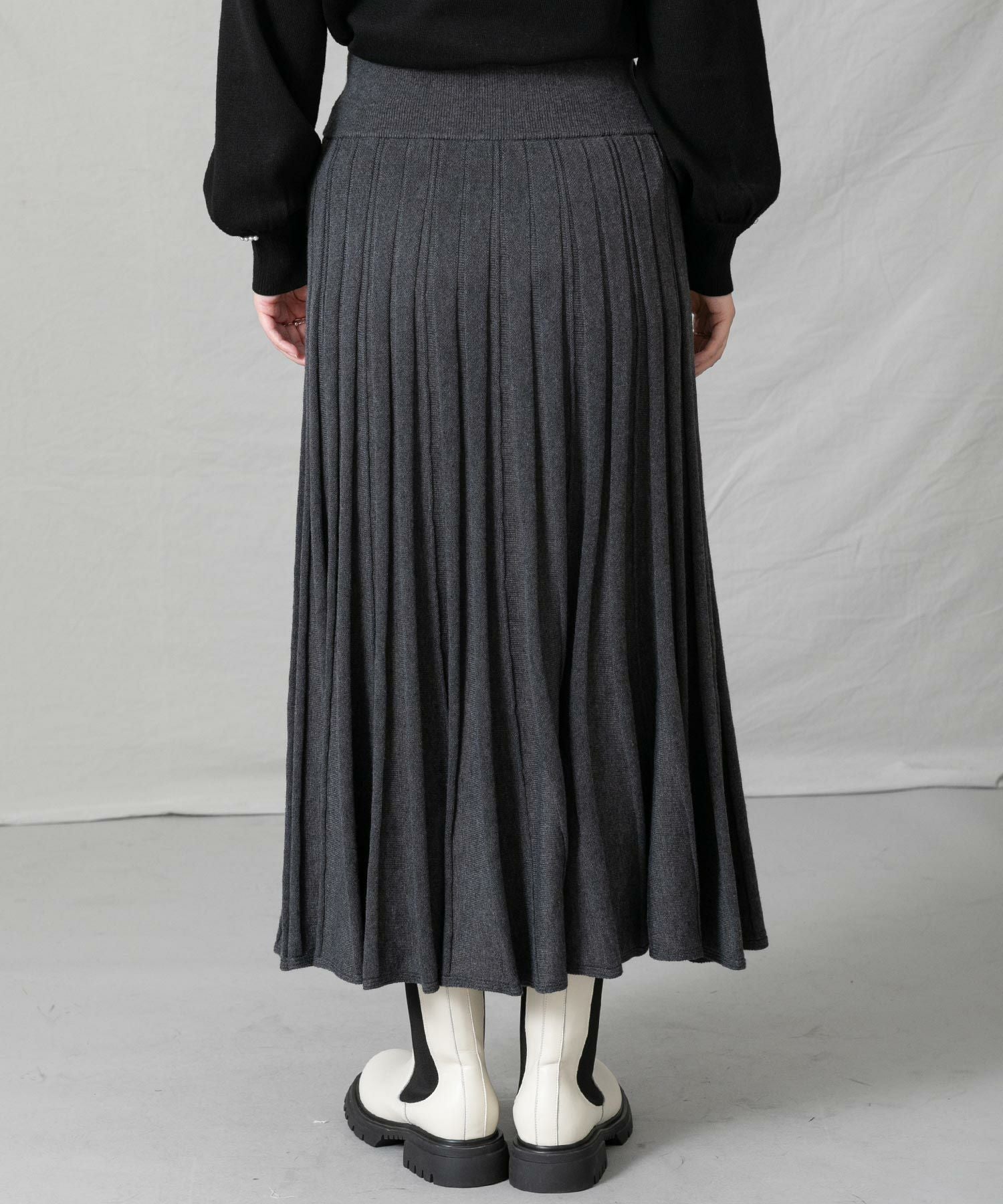 ウエストは総ゴム仕様で柔らかく優しい肌触りの穿き心地抜群のスカートです。綺麗に広がるニットプリーツが女性らしくエレガントな印象。
