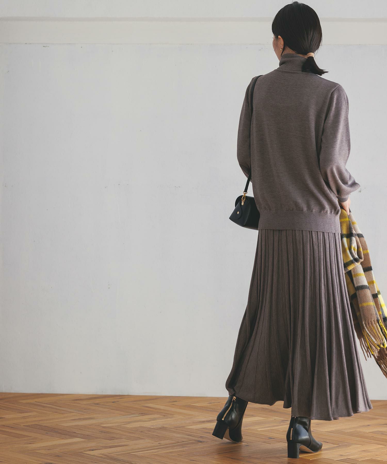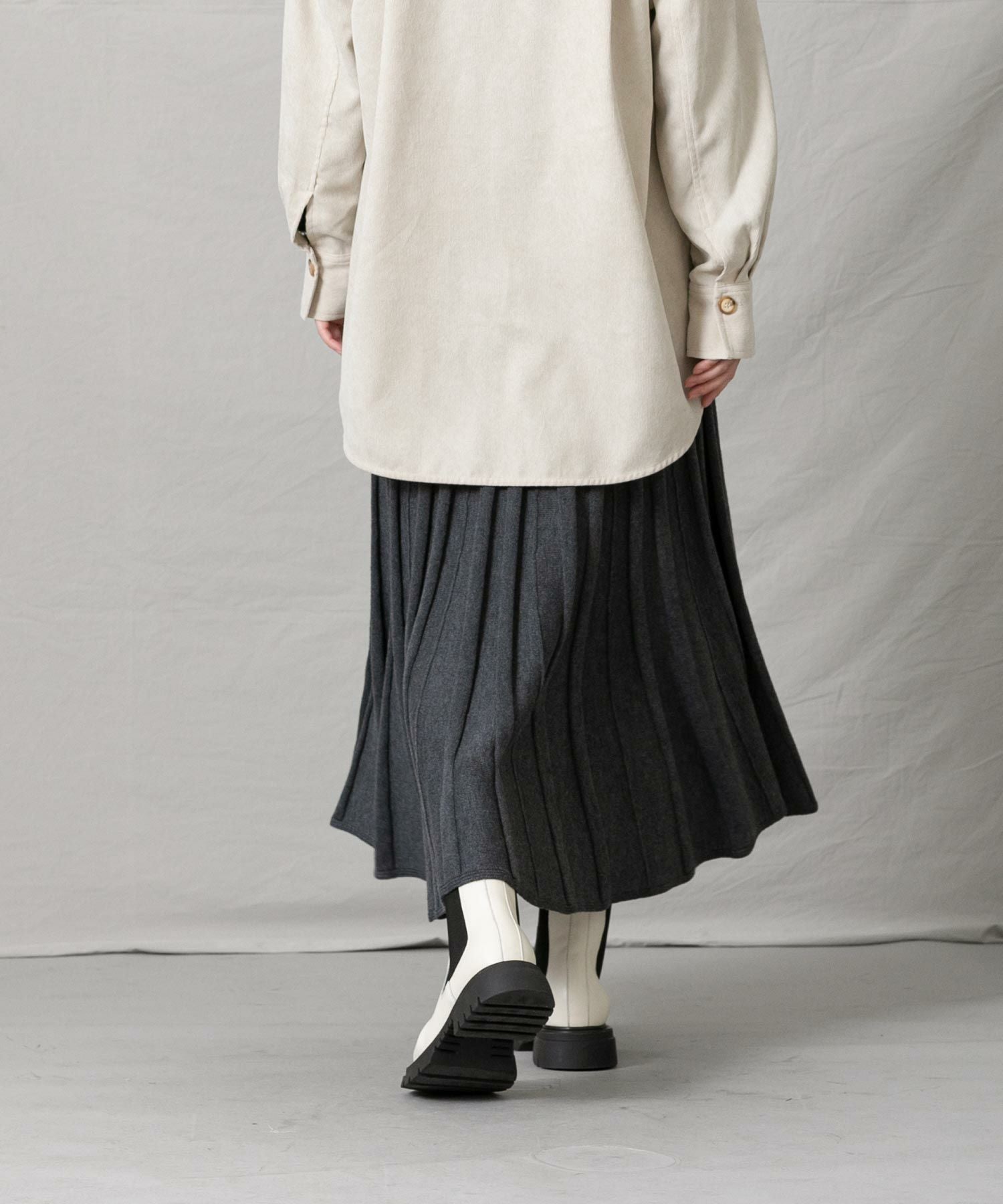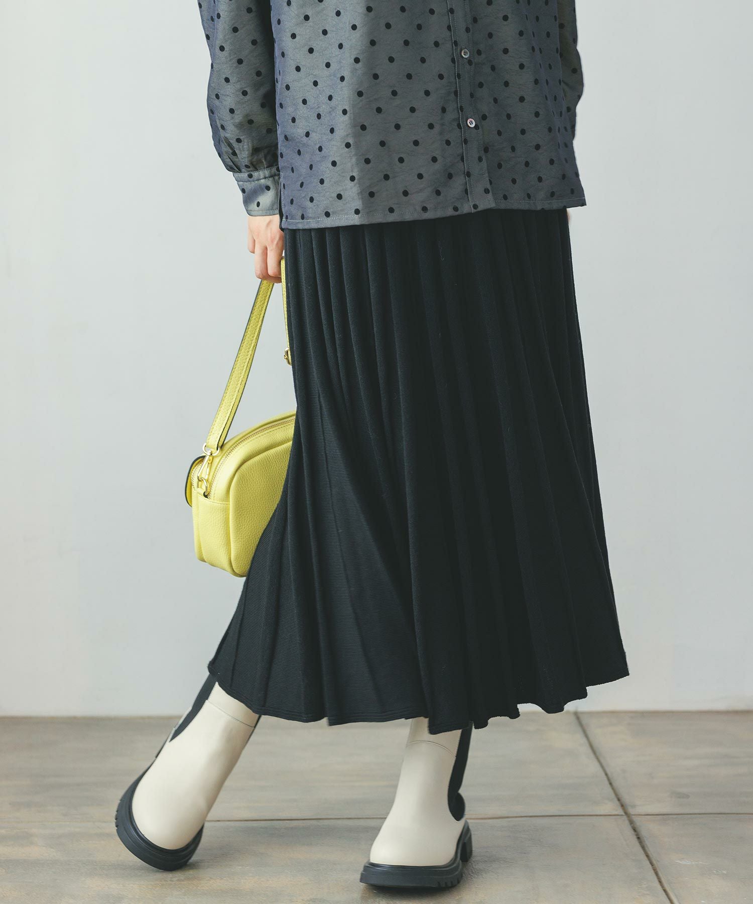 ウエストは総ゴム仕様で柔らかく優しい肌触りの穿き心地抜群のスカートです。綺麗に広がるニットプリーツが女性らしくエレガントな印象。